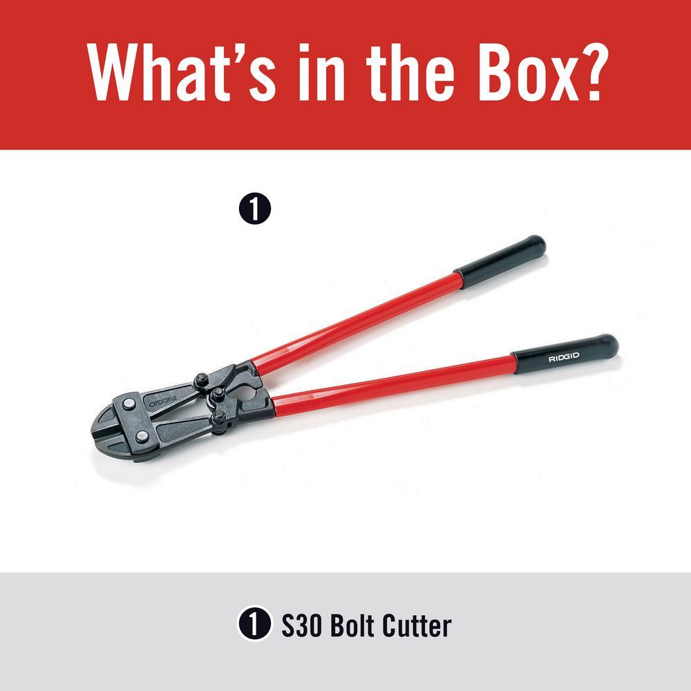 Built to handle tough jobs, the RIDGID S30 30 in. Bolt Cutter is a practical addition to your toolbox. These heavy-duty bolt cutters feature durable, hardened alloy steel jaws for maximum blade life and a one-step internal cam mechanism for precise blade alignment. The handles have comfortable grips, designed to allow greater mechanical advantage for crisp, controlled cutting. This RIDGID bolt cutter features a center cut that has a 1/2 in. capacity for soft metals, a 7/16 in. capacity for medium metals and a 3/8 in. capacity for hard metals. The overall tool length is 30 in.