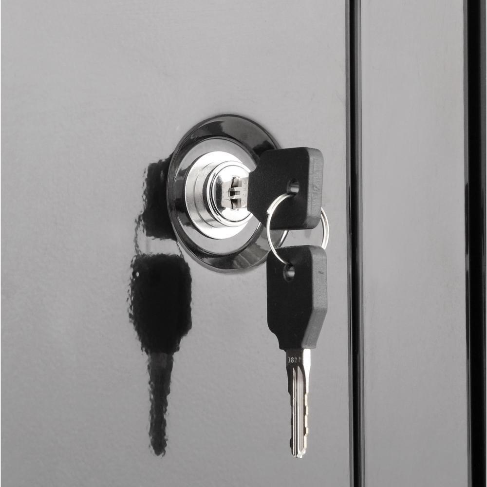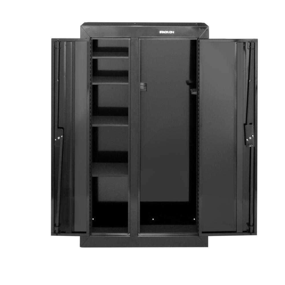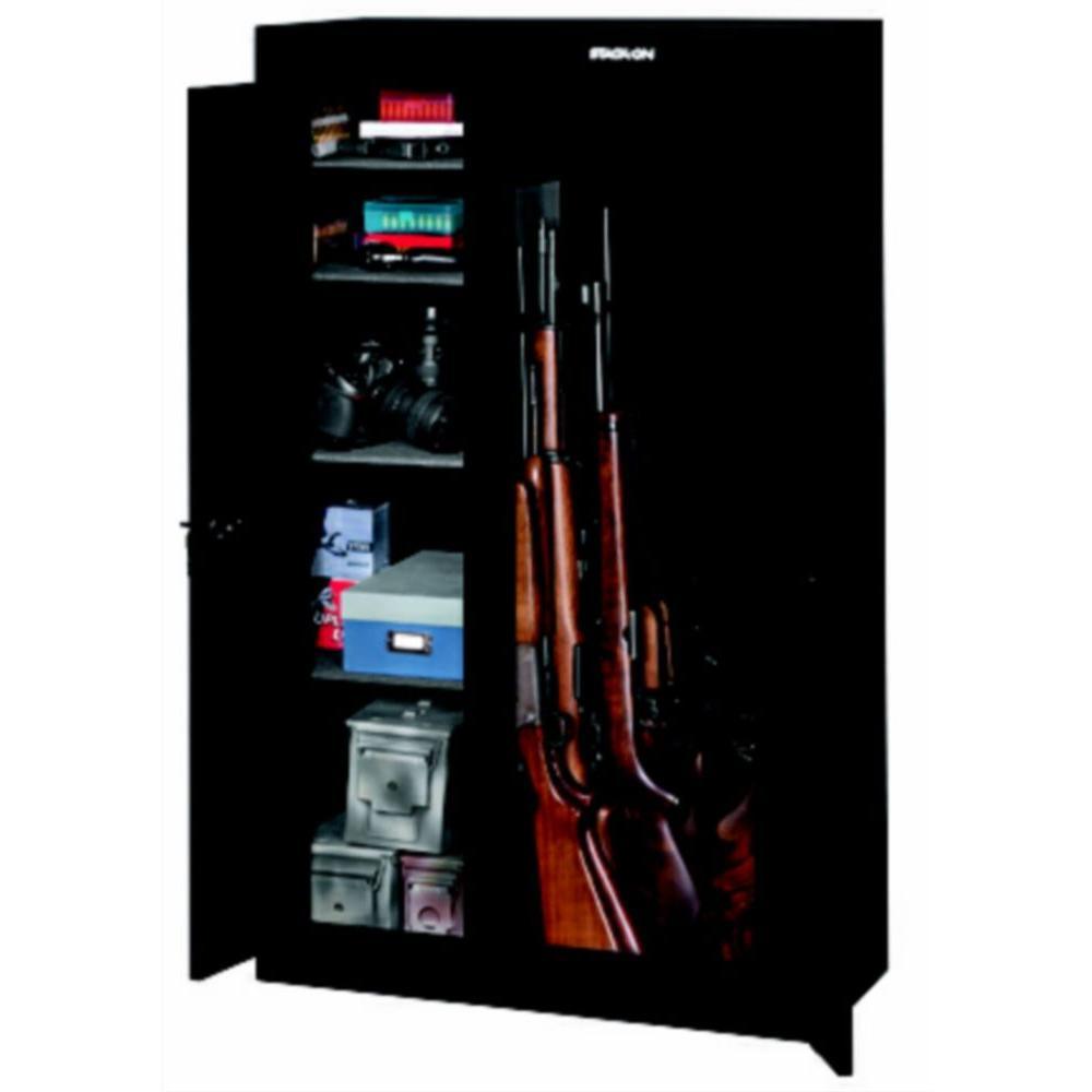 This 10-Gun double door security cabinet holds 10 rifles or shotguns up to 54 in. tall. Double door steel security cabinets have a separately keyed valuables cabinet. Available in gloss black paint finish.