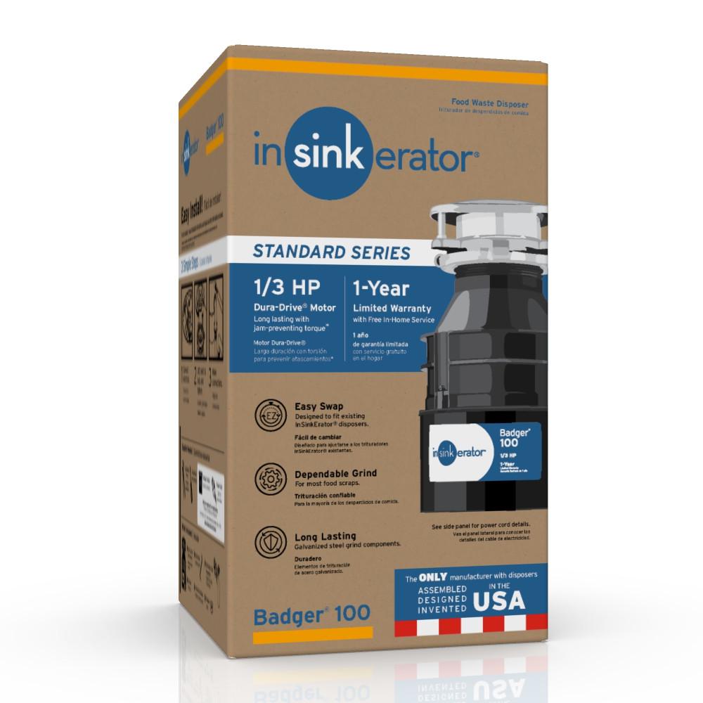 Badger Food garbage disposals are a reliable and functional choice when affordability is the prime concern. Badger 100 features a 1/3-horsepower heavy-duty quiet Dura-Drive induction motor, rugged galvanized steel construction for disposer durability, and a space-saving compact design.
