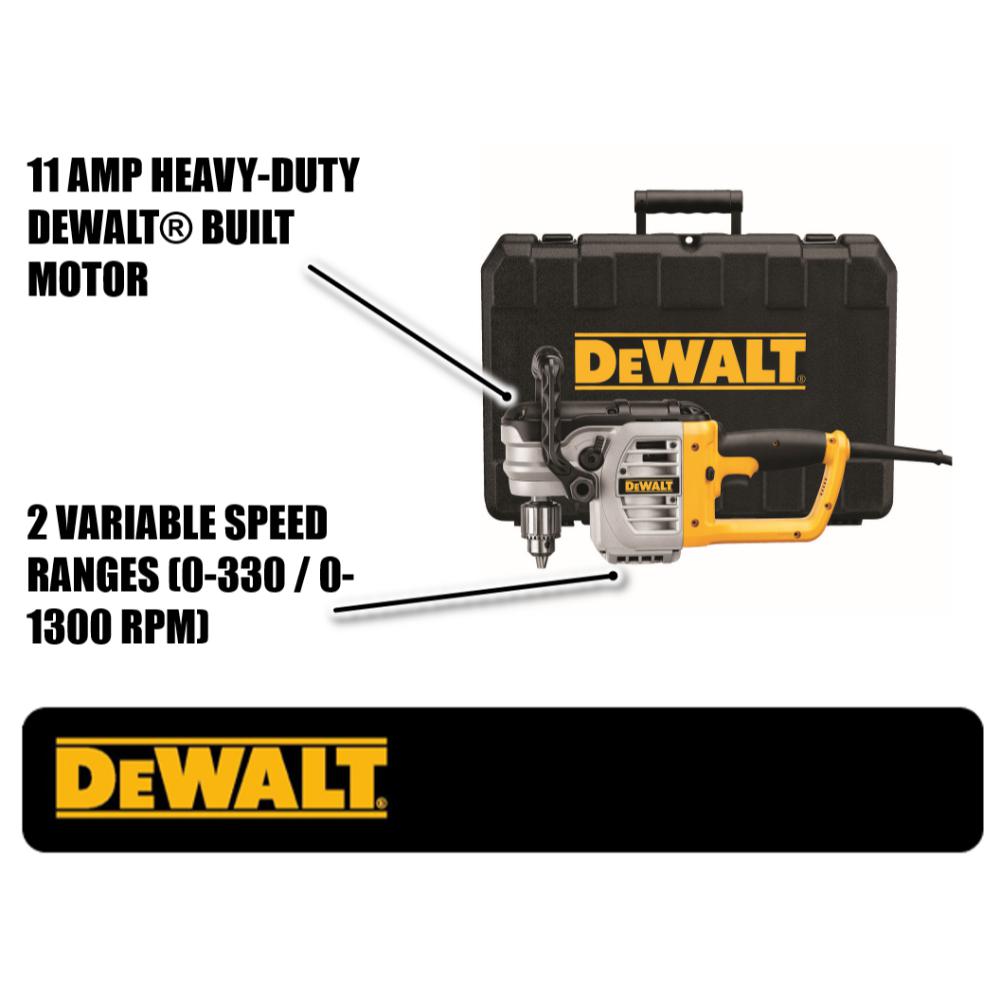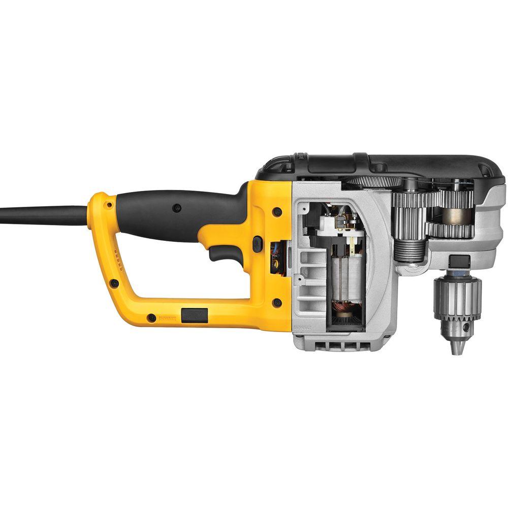 The DEWALT DWD460K is a 1/2 in. Right Angle Stud and Joist Drill Kit with Bind-Up Control. Built to drill large holes in wood using ship auger bits, hole saws and self-feed bits. The new drill provides plumbers, electricians and HVAC installers with increased levels of performance, durability and user control on the jobsite. The DWD460K is equipped with an innovative Bind-Up Control feature that provides increased user control in bind-up/stall situations. The Bind-Up Control feature senses a stall during use and adjusts the motor torque to a manageable level. The Bind-Up Control indicator illuminates when it is activated.