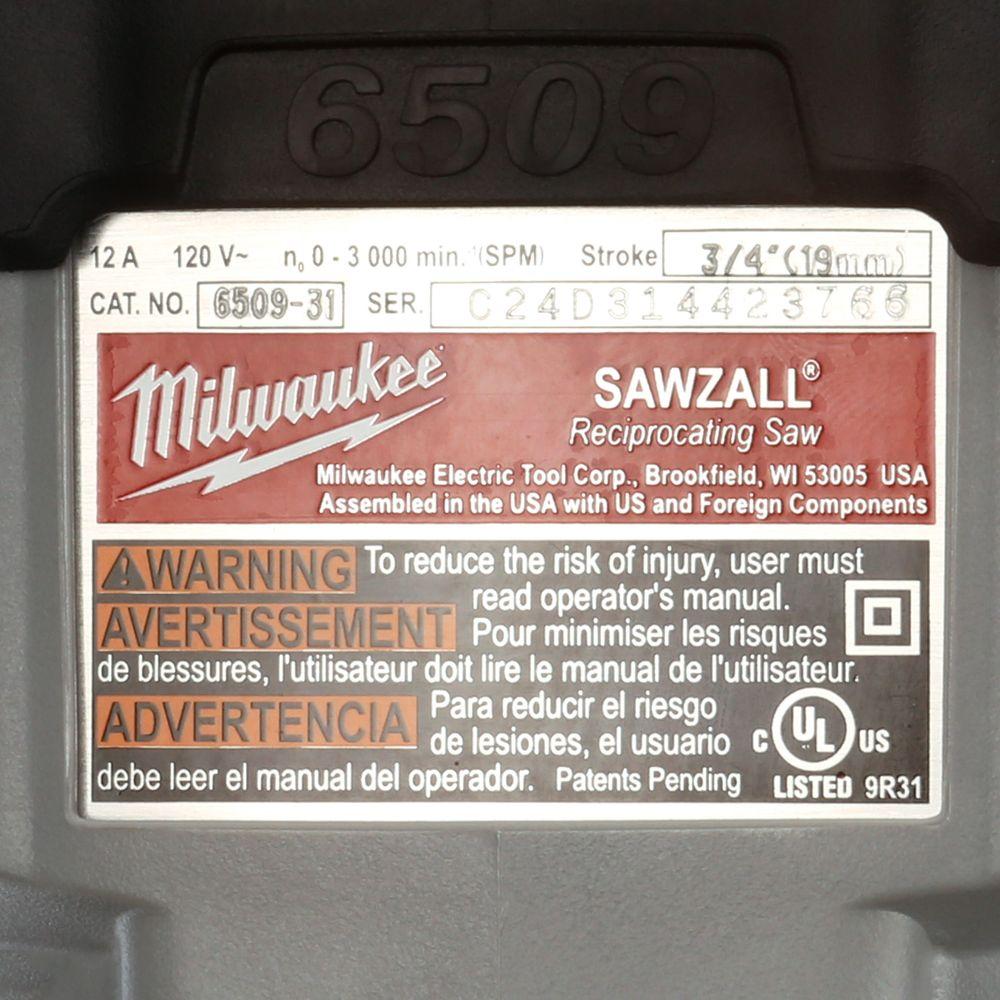 The Milwaukee 12 Amp 3/4 in. SAWZALL Reciprocating Saw with Case delivers superior cutting speed, durability and power with 0-3000 strokes per minute (SPM), a 3/4 in. stroke length and a 12 Amp motor. Suitable for cutting a wide range of materials with ease, this tool's protecting clutch extends gear and motor life by absorbing high impact forces and a QUIK-LOK blade clamp offers fast tool-free blade changes for less downtime. Comfortable to use and easy to control, a counter weighted mechanism reduces vibration for smoother operation and a redesigned front grip area provides exceptional ergonomics.