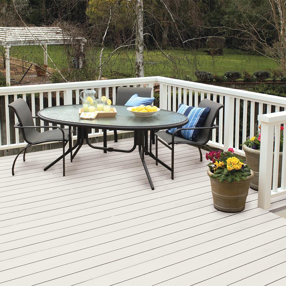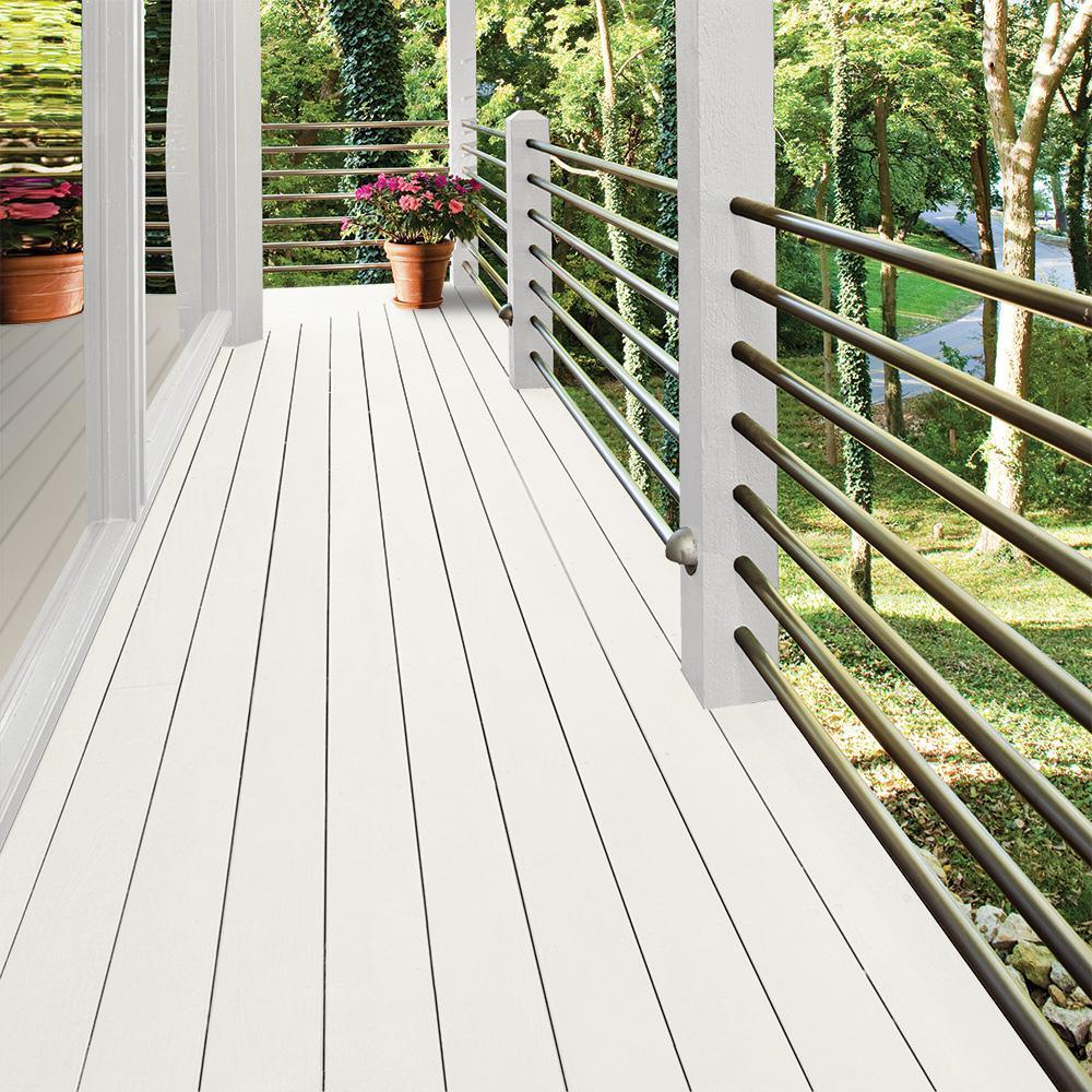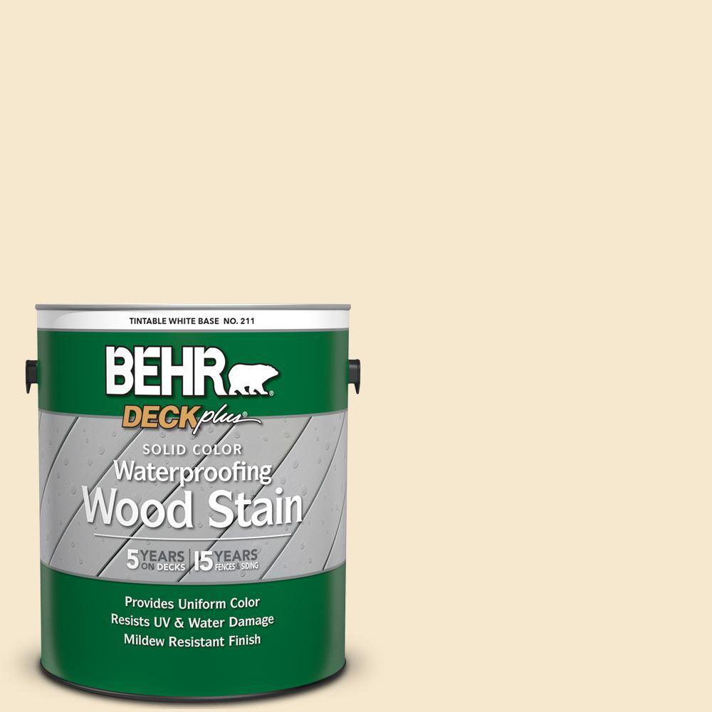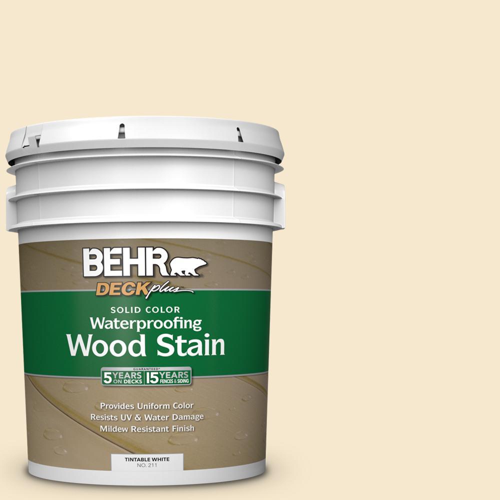 The BEHR DECKplus 5 gal. White Tint Base Solid Color Waterproofing Wood Stain is BEHRs best solid color product. This advanced 100% acrylic formula delivers complete protection from the elements for up to 5 years on decks and 15 years on fencing and siding. The product is self-priming and delivers excellent protection from the suns harmful UV rays. Available in over 1,600 custom colors and formulated for color matching, this stain will hide imperfections while allowing the wood texture to show through. The durable and advanced 100% acrylic formula resists cracking, peeling and blistering. This product is also great for composite decks.