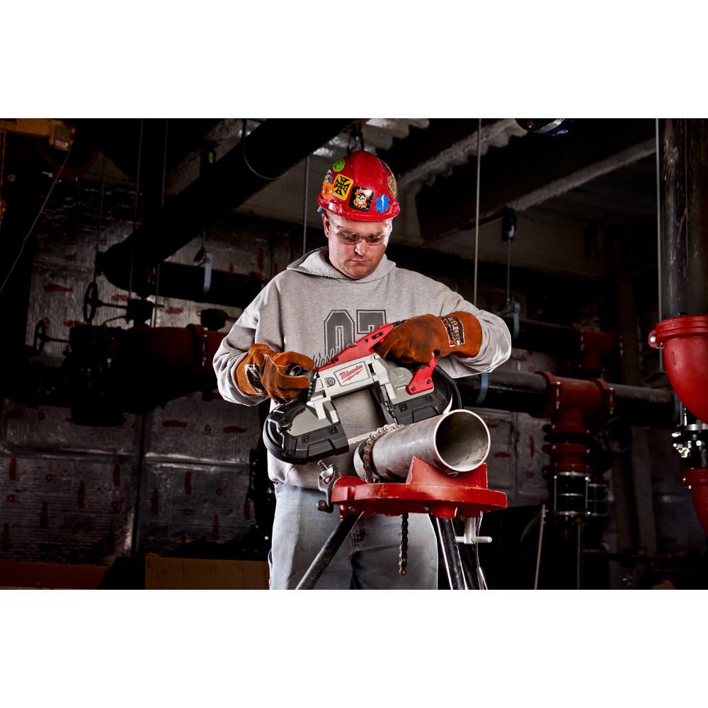 Deep Cut Band Saws deliver 2X more durability, best-in-class power at 11 Amp, revolutionary cut visibility and the industry's largest cut capacity at 5 in. x 5 in. These Band Saws still deliver on the heritage of long-term reliability and performance that make Milwaukee Band Saws the standard in industrial metalworking, but now feature a new, exclusive Job Site Armor Technology and all metal direct drive system that provide game-changing durability. The Job Site Armor Technology is made of a proprietary composite material and has crush zone barriers that provide long-lasting rugged protection. The all metal direct drive gearing system delivers maximum tool life, while requiring less servicing than a chain drive. In addition, a gear protecting clutch extends gear and motor life by absorbing high impact forces caused by blade lock-ups. The new Band Saw's slimmer motor housing increases user line of site delivering superior cut accuracy and revolutionary cut visibility, while a new balanced body design allows tool to rest naturally and comfortably in users hands. At 14.5 lbs., this lighter weight design delivers more control over the tool and less fatigue at the conclusion of the work day. Other innovative features include a tool-free locking adjustable shoe for a button actuated tool-free design that allows user to quickly adjust from an extended shoe to no shoe in seconds, while the new debris protection system delivers longer pulley life by removing debris during use.