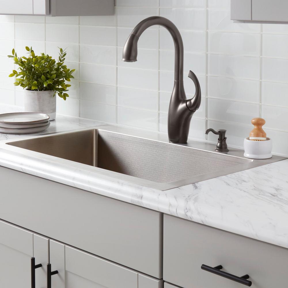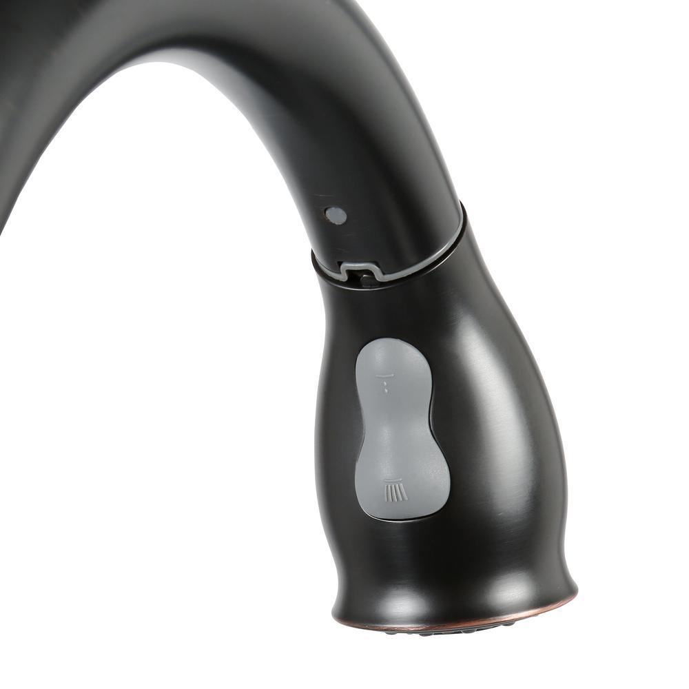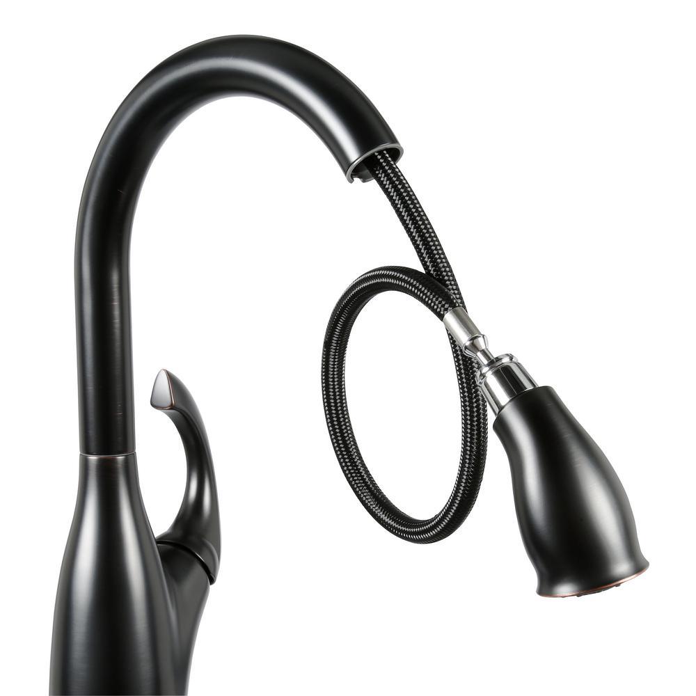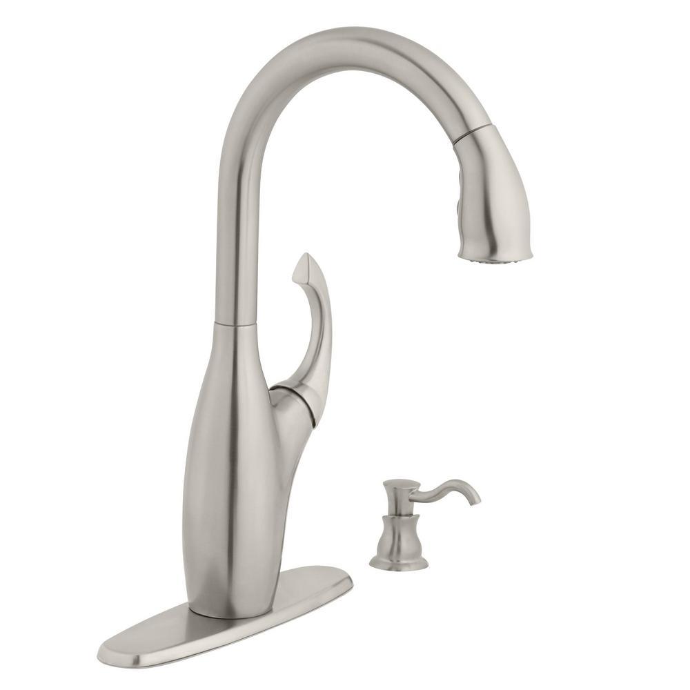 This Glacier Bay Single-Handle Pull-Down Sprayer Kitchen Faucet with Soap Dispenser in Mediterranean Bronze features a transitional style with a smooth and simple curved design. It complements a wide range of kitchen decor. This faucet is easy to use with single water control and a spout with a high arc for ample sink clearance. Its pull-down sprayer offers plenty of reach for cleaning the sink, rinsing dishes or filling pots and pans. A ceramic disc enables drip-free performance and is easy to install.
