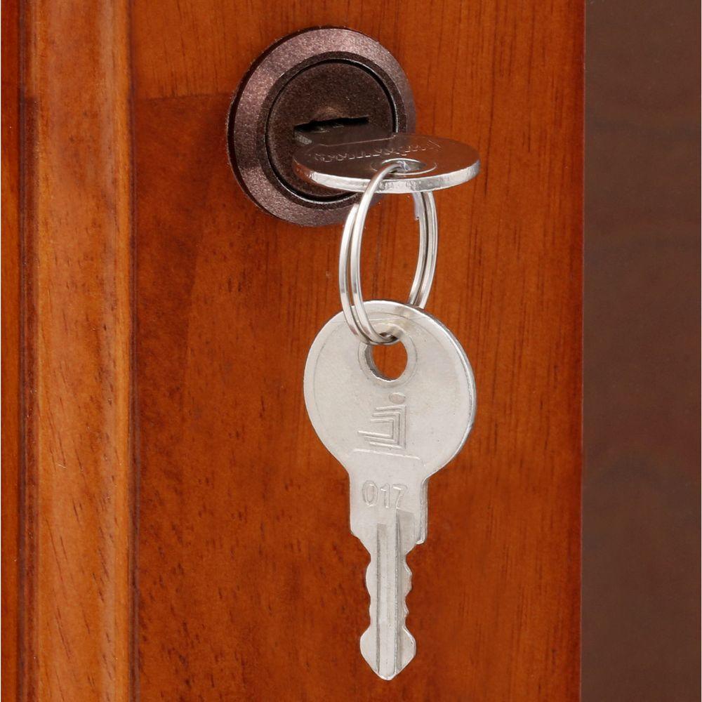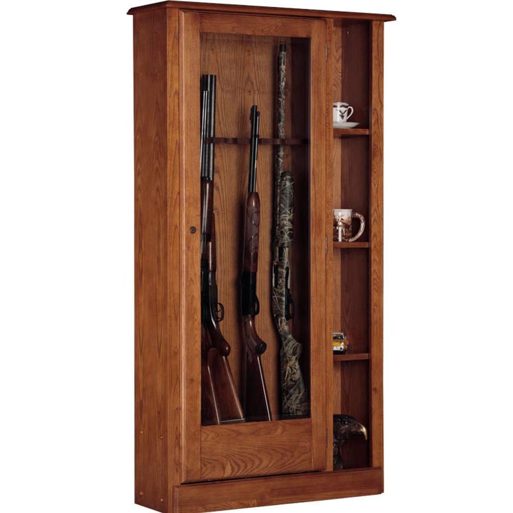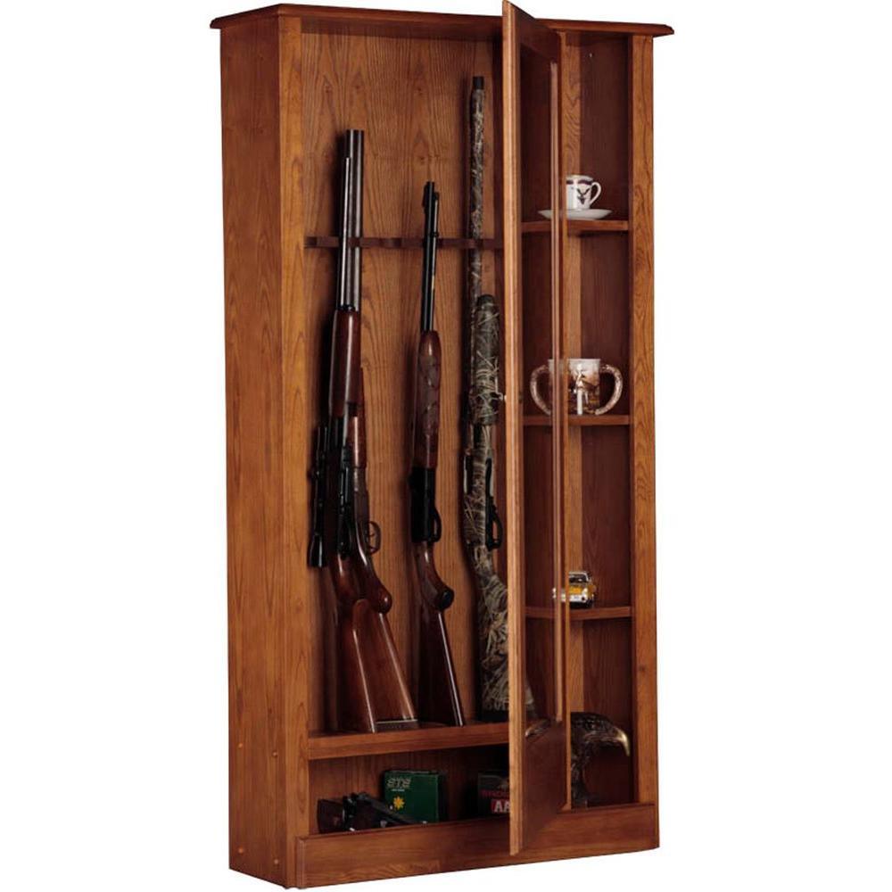 This 10-gun cabinet is made of rich medium brown finished hardwoods and wood veneers for long-lasting style. The cabinet provides a real touch of class you can add to your den or study. It is fully-locking so you can keep your collection secure at all times. The curio display includes 3 adjustable shelves and hidden storage is available behind the door.