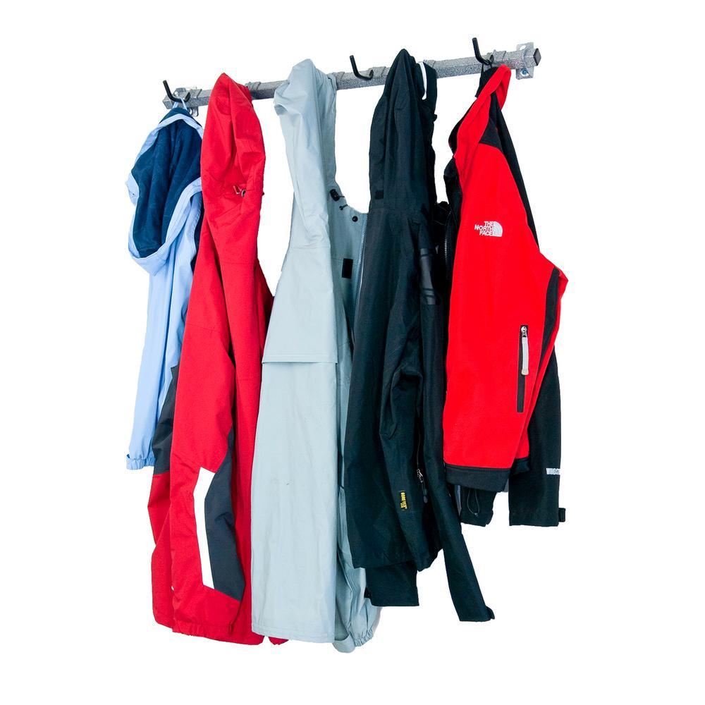 The Small Garage Coat Rack by Monkey Bars allows you to hang 6 adult coats of any size. The long hooks allow for hanging even the heaviest coats. The Coat Rack takes only 4 screws and 15 minutes to install. The Small Coat Rack uses just 3 ft. of wall space and extends a mere 3 from the wall with coats hanging. This wall mounted coat rack is perfect for the garage, shop, warehouse, barn, closet, or tack room and is suitable for outside use.