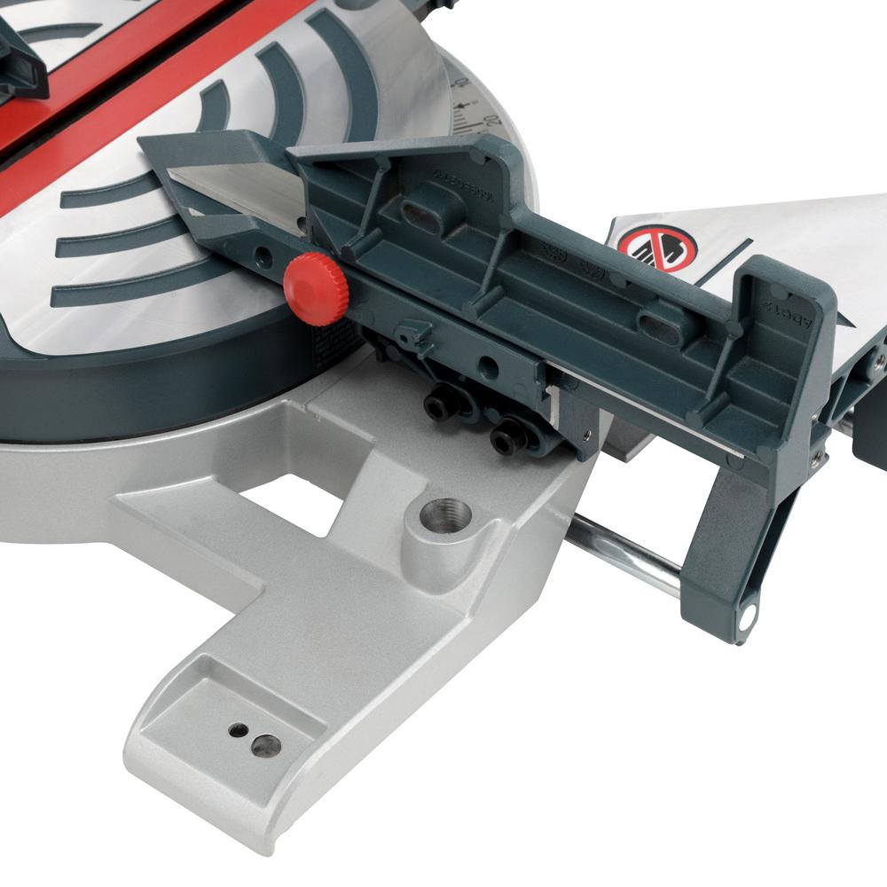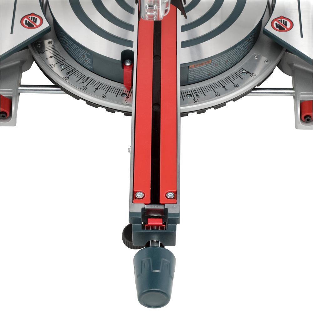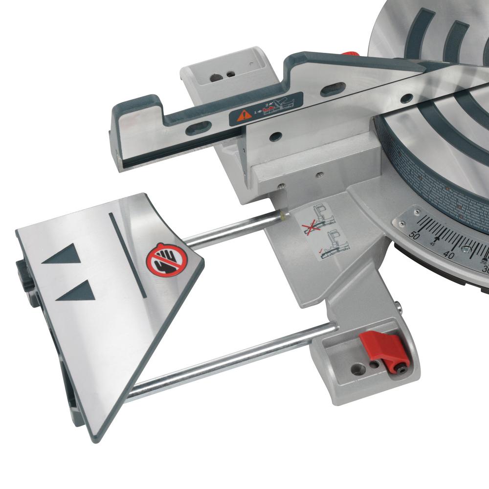 Adjustable front stabilizing foot maintains saw stability when performing slide cuts allowing maximum capacity: cross cut 12-1/4 in. at 0˚, 8 in. at 45˚, 2-3/4 in. upright, 3-1/2 in. crown