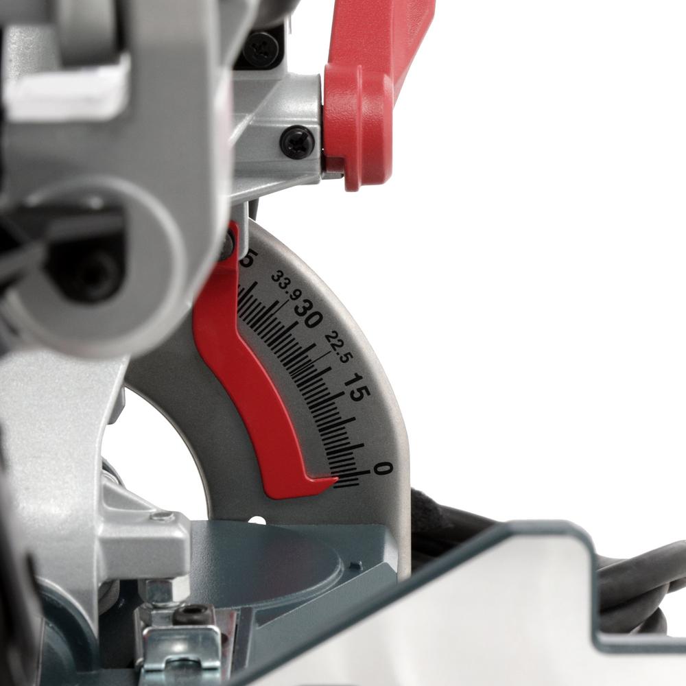 Easy access bevel controls, bevel lock lever, and bevel turret stops are located on side of tool for quick and easy adjustments