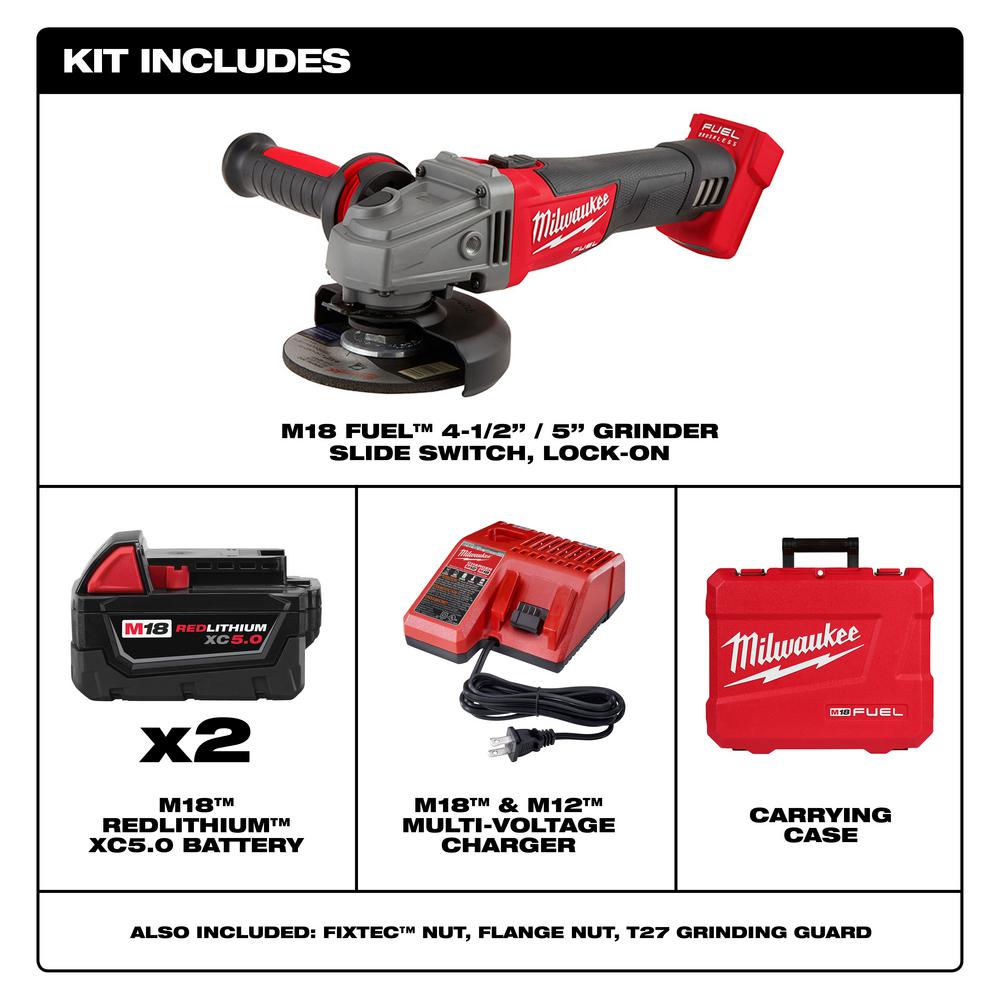 - Includes: (1) M18 FUEL 4-1/2 in. / 5 in. grinder, slide switch lock-on (bare tool) (2781-20), (2) M18 REDLITHIUM XC5.0 extended capacity battery pack (48-11-1850), (1) M18 and M12 multi-voltage charger (48-59-1812), (1) carrying case, (1) flange nuts, (1) wheel guard, (1) spanner wrench