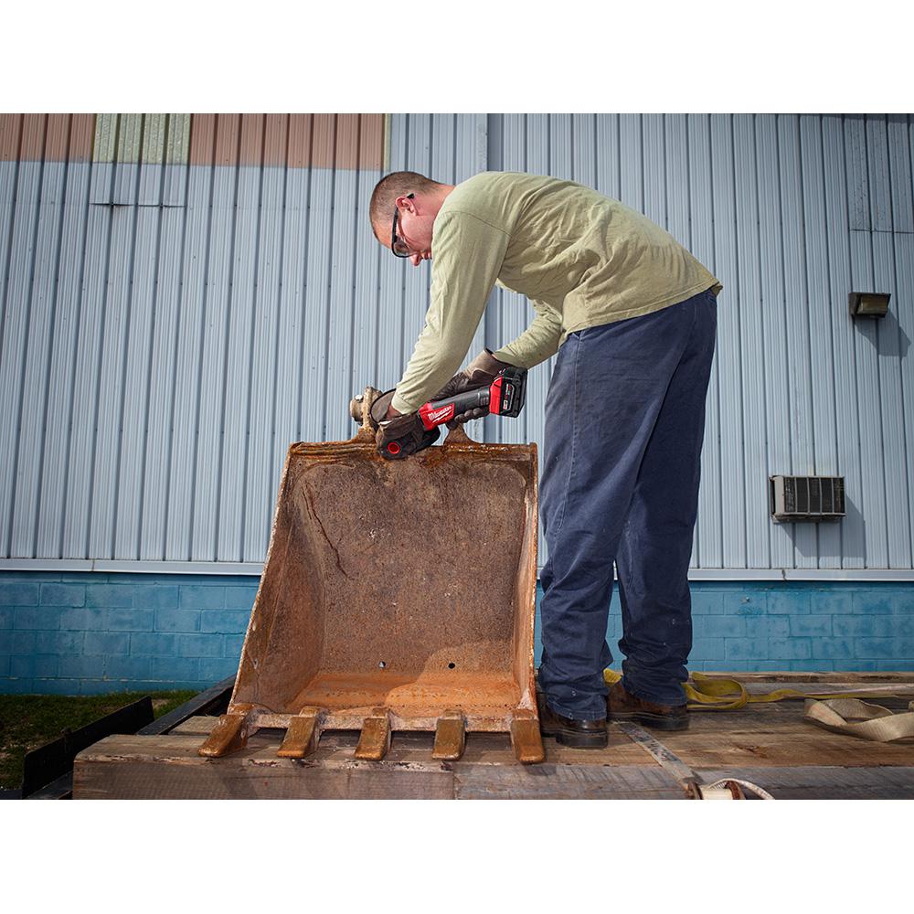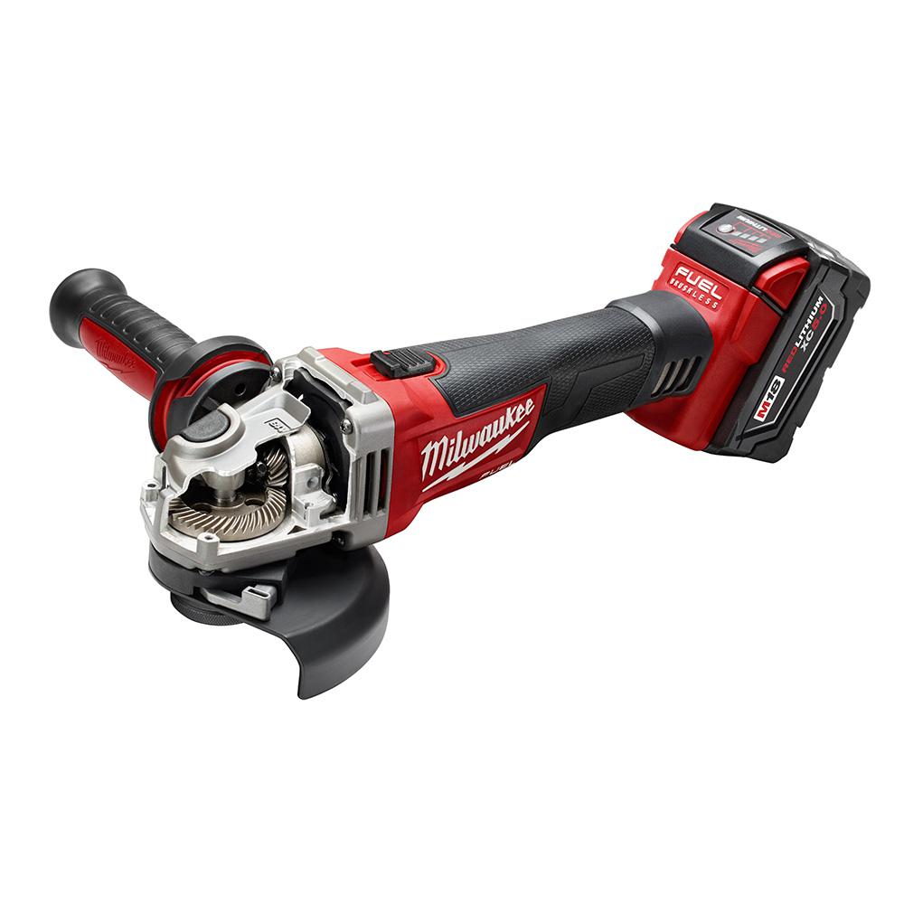 Power To Grind: World's first cordless grinder with corded performance. Utilizing a POWERSTATE Brushless Motor, the M18 FUEL 4-1/2 in. / 5 in. Grinder, Paddle Switch No-Lock, delivers maximum sustained power to complete the toughest grinding, surface prep and cutting applications while providing a lower cost of ownership with up to 10X longer motor life. REDLITHIUM XC5.0 Battery Technology provides superior pack construction, electronics, and performance deliver 2X more run-time and more work over pack life than any battery on the market. REDLINK PLUS Intelligence has the most advanced system of cordless power tool electronics, providing optimized performance, electronic clutch, and overload protection using total system communication between tool, battery and charger. The thin body design delivers optimized balance to rest easily in the users hands. 100% tool-free-tool - No wrench, No Screwdriver, No problem: Tool-free accessory change to easily change"all accessories without a wrench and a toll-free adjustable guard for quick guard installations and adjustments. The M18 FUEL 4-1/2 in. / 5 in. Grinder, Paddle Switch No-Lock proves corded durability in a cordless tool by utilizing the same metal housing, gearing system, guards, flanges, and anti-vibration side handles as legendary high performance corded grinders.
