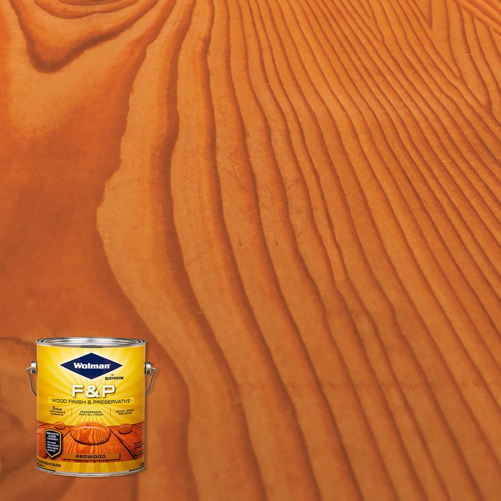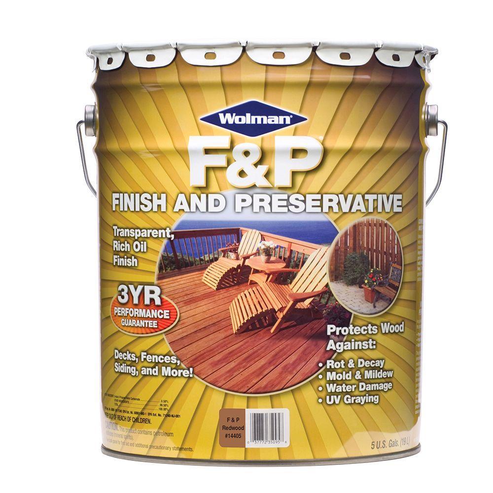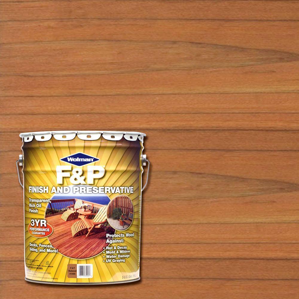 Wolman 5 gal. F&P Redwood Exterior Wood Stain Finish and Preservative is an oil-based wood finish that provides new or weathered wood with UV and water repellent protection. Protects against fading and graying. Provides transparent color in natural wood tones that reveal and highlight natural wood grain and texture.