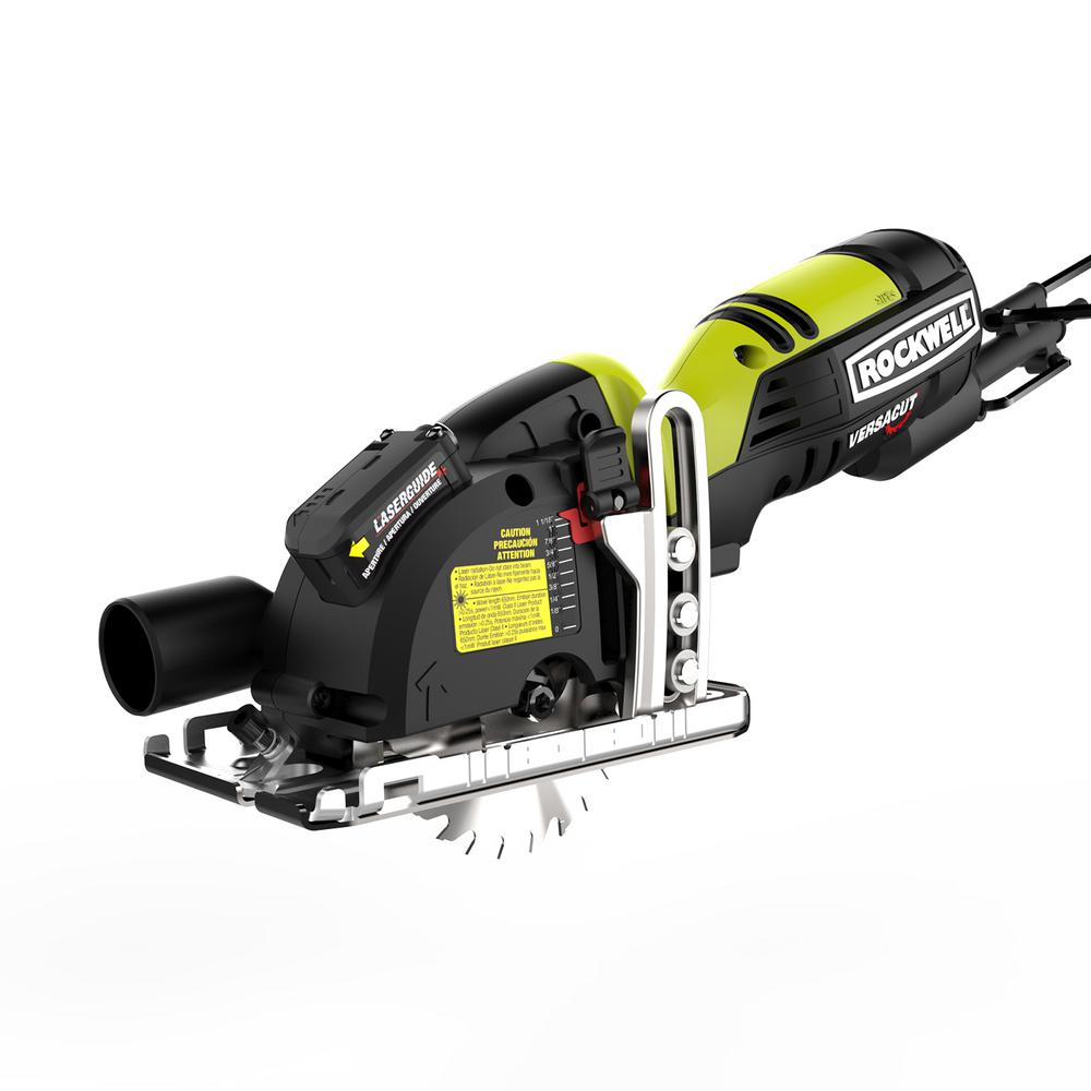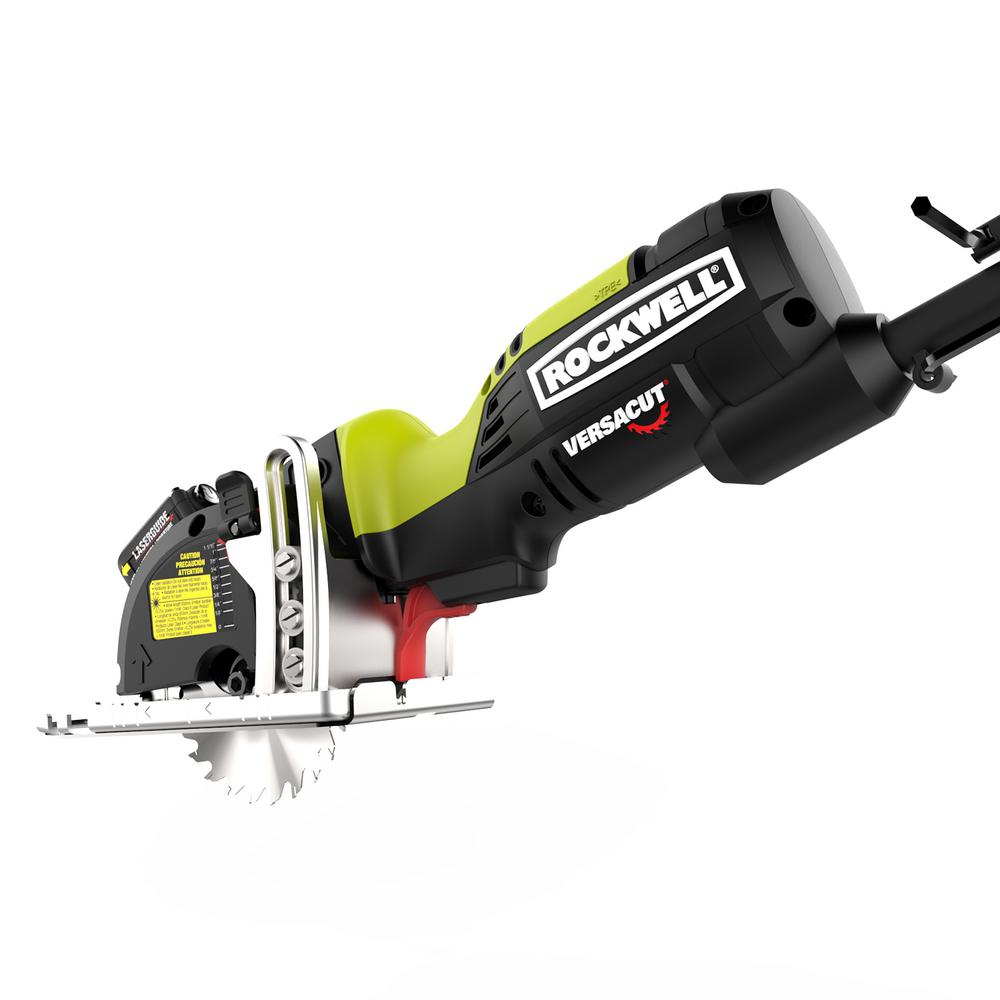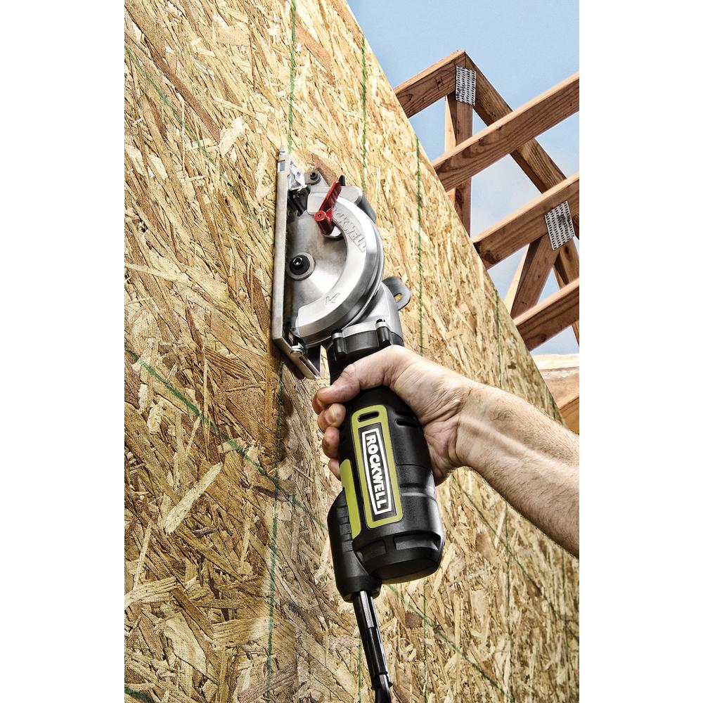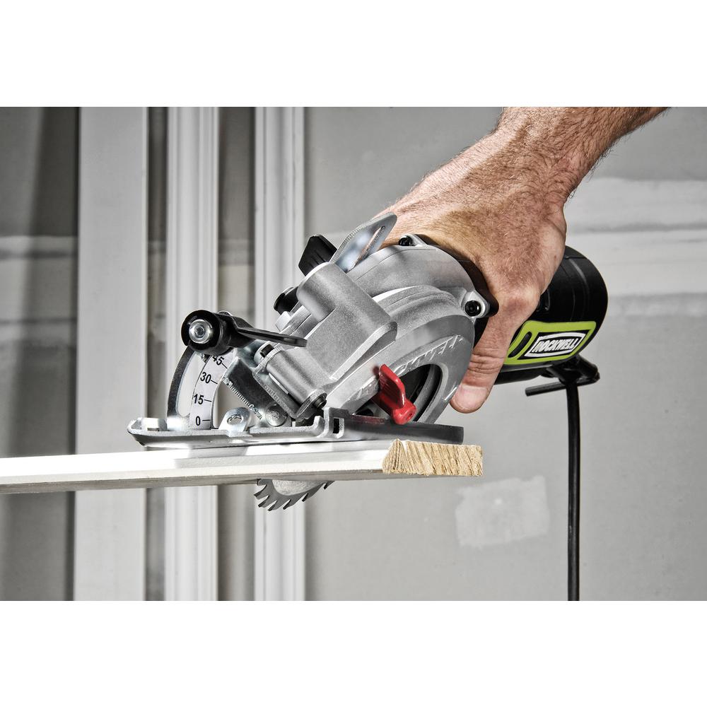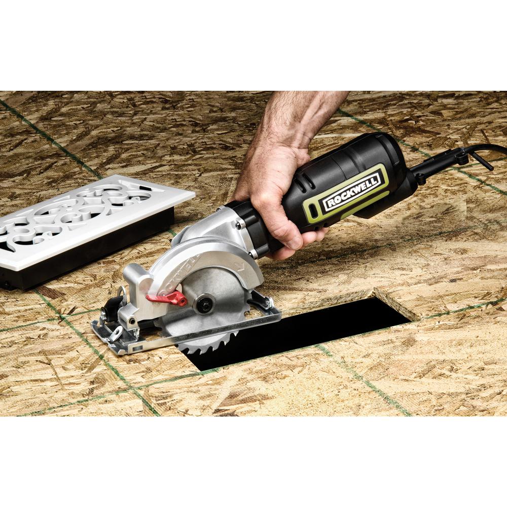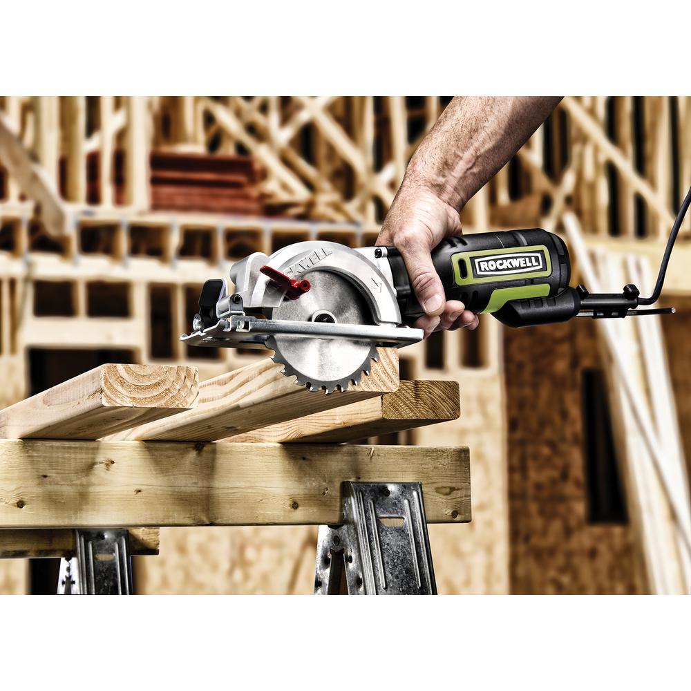 The Rockwell 4-1/2” Compact Circular Saw is an effective and hassle-free replacement for a traditional circ saw. Just grab it and go when you need to make some quick rip or plunge cuts—no need to lug out the bulky full-size saw. Even though it has the functionality to handle all sorts of projects, this saw was made for 2” lumber, cutting 2x4s in a single pass. Its lightweight design (only 5 lbs) allows for better control of the tool so you can operate it with just one hand. And it makes overhead cutting much more of a possibility than with a full-size saw. The grip is comfortable to use for extended periods. And the smaller blade allows the 5-amp motor to spin it up to 3,500 rpm, achieving the speeds of much larger saws while putting less strain on the motor for more efficient energy usage and increased life of the tool. The easy to access depth adjustment lever allows for a maximum cutting depth of 1-11/16” at 90. While the bevel lever lets you make the most common angled cuts from 0-45, with a maximum cutting depth of 1-1/8” on those cuts. Again, this saw excels at 2x4s, but is also awesome on plywood, hardwood flooring, pegboard, dowels, molding and more. Comes with one 24T TCT blade, a parallel guide, vacuum adapter, and blade key.