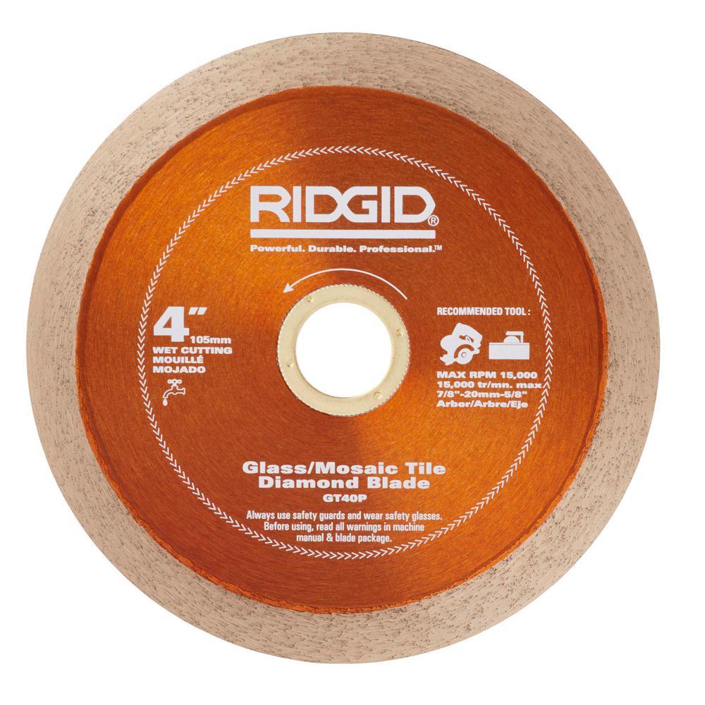 RIDGID Glass Tile Diamond Blades are engineered to cut glass tile, glass mosaic tile, and multi-finish mosaic tile. The continuous rim design with very fine diamond particles achieve precise, chip-free cuts helping you work quickly and effectively. Use this blade on 4 in. wet tile saws and 4 in. handheld wet tile saws that have a 7/8 in. arbor, 5/8 in. and 20mm adapters included.
