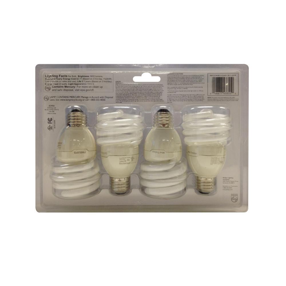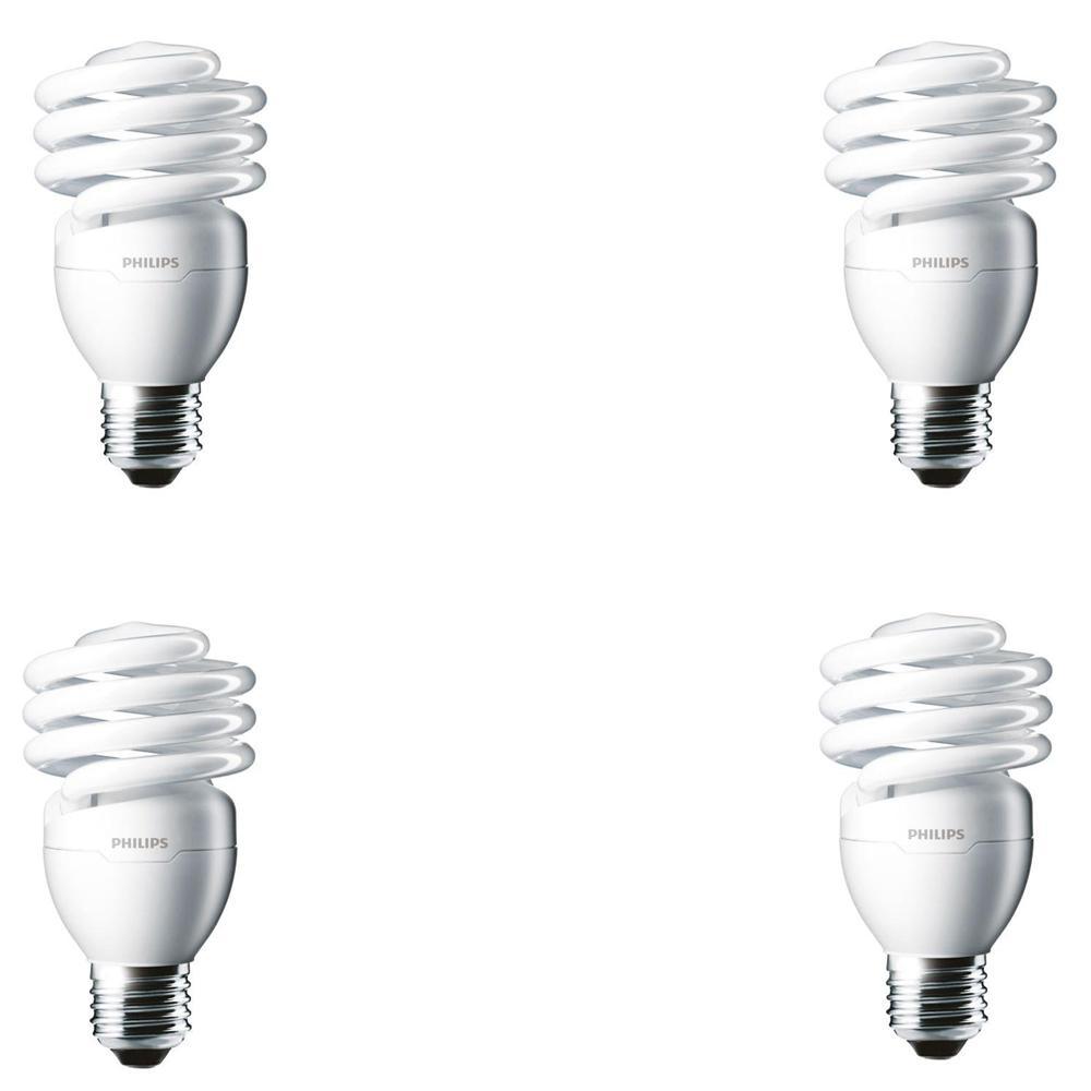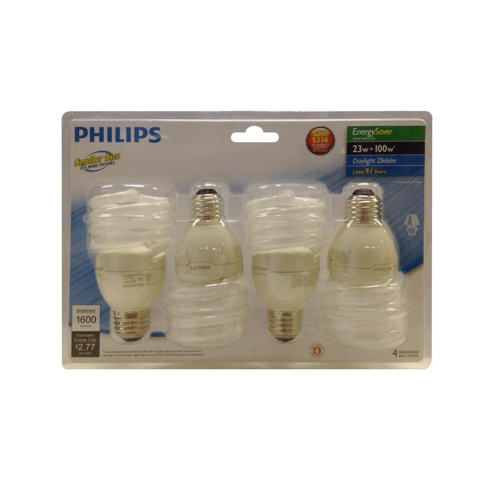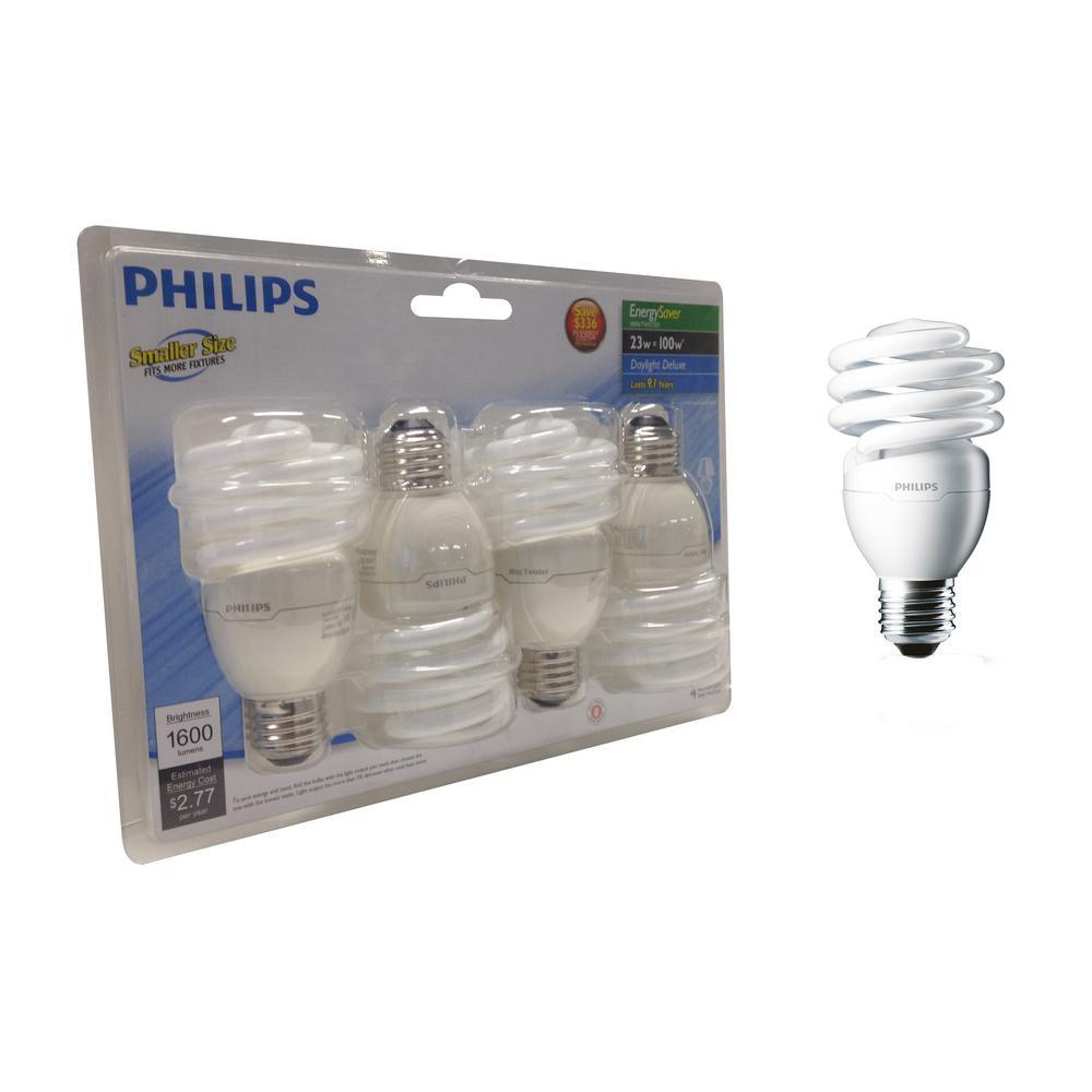 The Philips 23-Watt T2 Daylight Deluxe Twister CFL Light Bulb (4-Pack) projects an ultra-white (6500K) light similar to natural daylight to brilliantly illuminate household interiors. Considerably more efficient than a 100-Watt incandescent equivalent, each compact fluorescent lamp puts out a substantial 1600 lumens at a cost of only $2.77 in electricity consumption per year, amounting to a collective savings of $336 from the quartet over their existence. Fashioned with a medium base and compact in stature to fit a variety of light fixtures, these T2-spiraled bulbs are designed to last for 10,000 hours apiece.