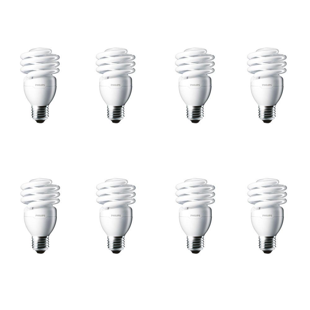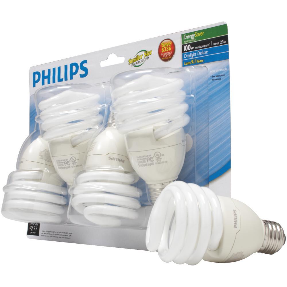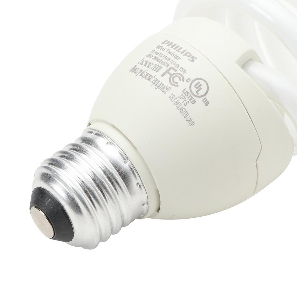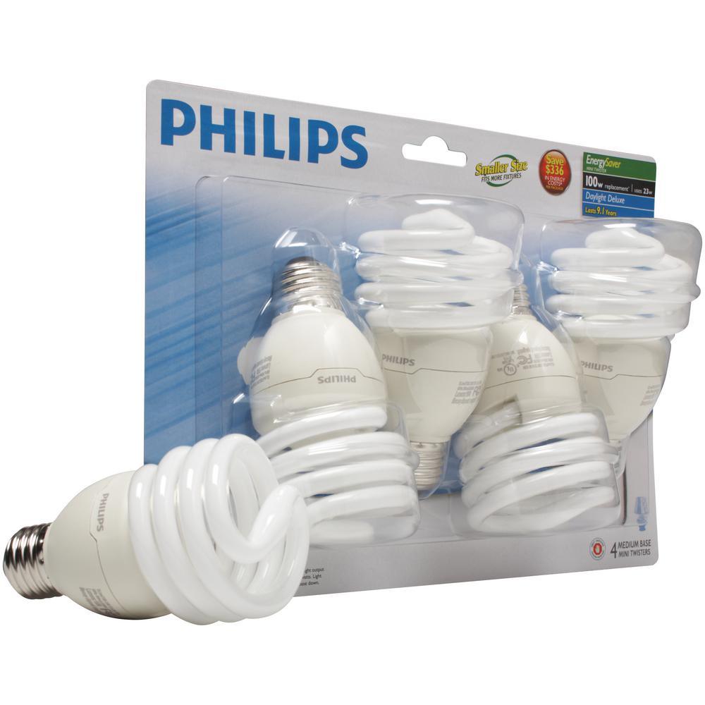 The Philips 23-Watt T2 Daylight Deluxe Twister CFL Light Bulb (4-Pack) projects an ultra-white (6500K) light similar to natural daylight to brilliantly illuminate household interiors. Considerably more efficient than a 100-Watt incandescent equivalent, each compact fluorescent lamp puts out a substantial 1600 lumens at a cost of only $2.77 in electricity consumption per year, amounting to a collective savings of $336 from the quartet over their existence. Fashioned with a medium base and compact in stature to fit a variety of light fixtures, these T2-spiraled bulbs are designed to last for 10,000 hours apiece.