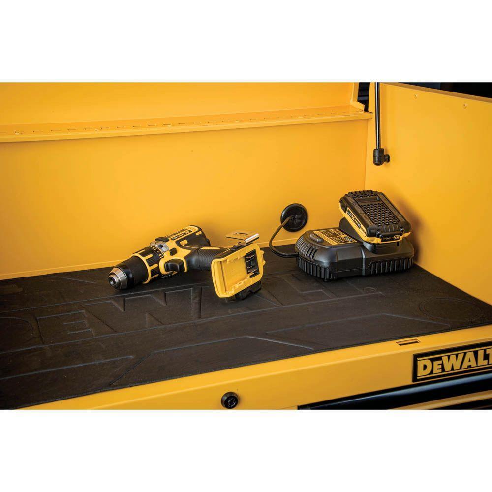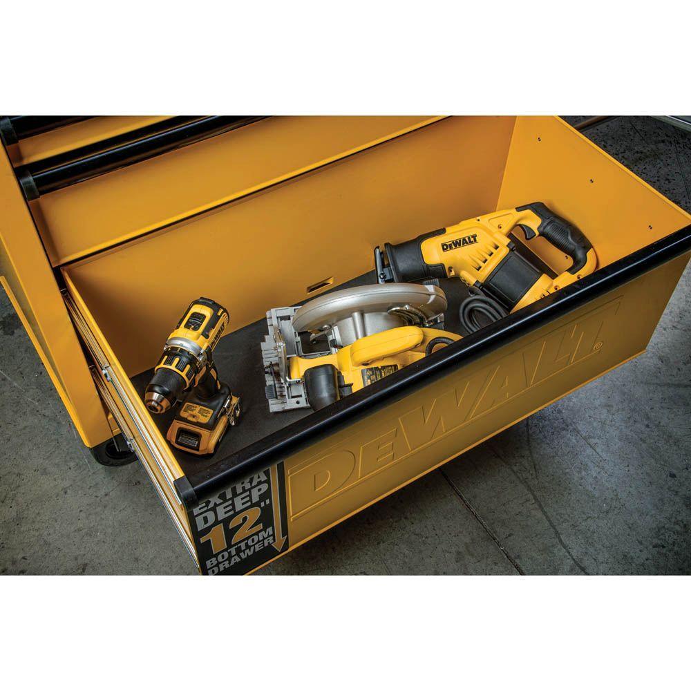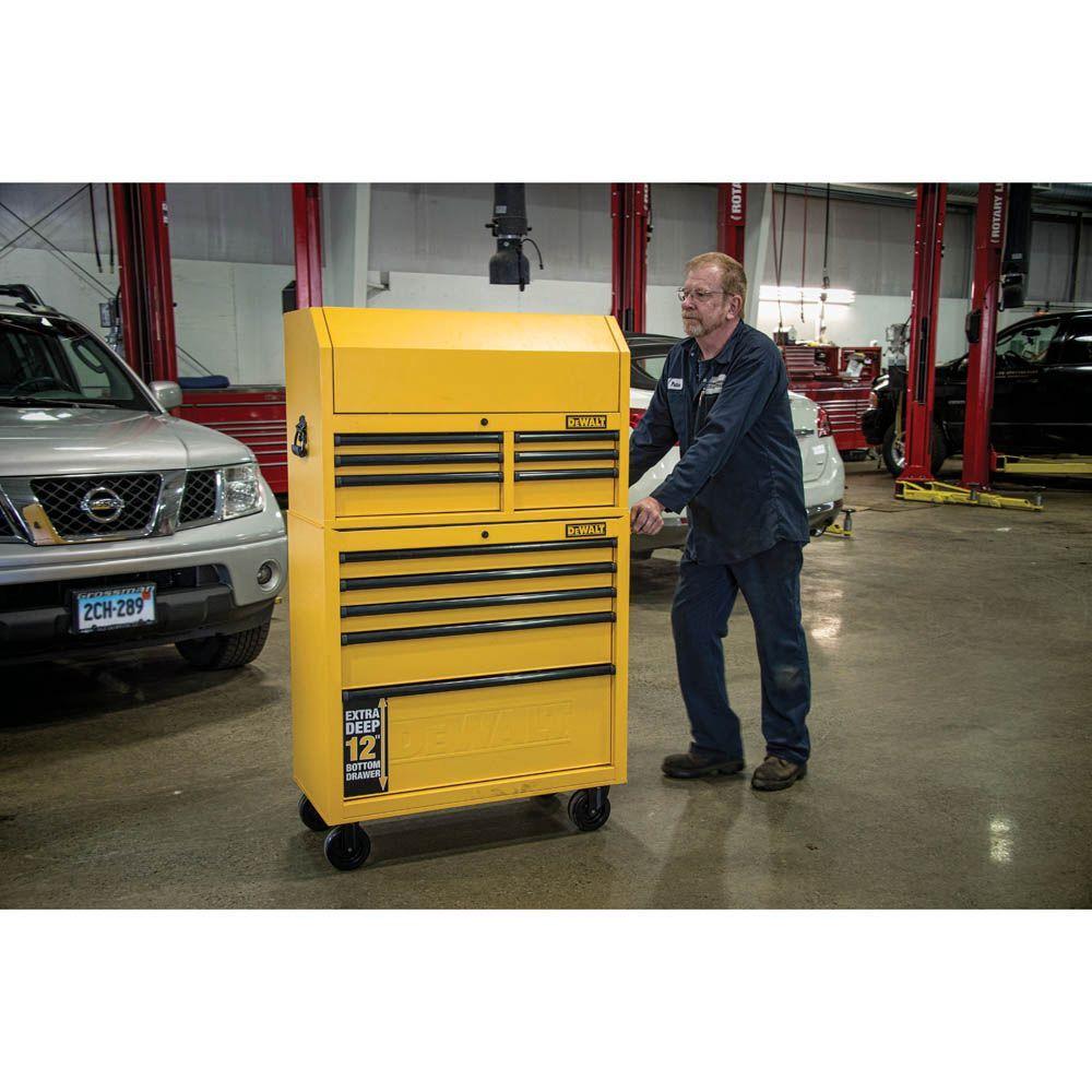 Keep your garage clean with the DEWALT 36 in. 11-Drawer Metal Rolling and Top Storage Chest in Yellow. Designed to ensure toughness and structural integrity, it is built with a metal construction, perfect for both professional tradesman and DIYers. This tool chest is designed with a lid that features gas struts, offering extra safety when opening and closing. It is designed with 11 drawers - six small, three medium and two large and features a total holding capacity of 21,992 cu. in., providing plenty of storage for all your equipment. It features ball bearing slides that can hold up to 100 lbs. for easy drawer operation. Thanks to the power tool drawer, you can store your larger equipment. This metal rolling and top storage chest has a keyed lock to secure your tools after use. It utilizes 5 in. x 2 in. casters that can support up to 1,400 lbs. and features a push handle, designed for comfortably moving the unit. Redefine your tool organization with the DEWALT 36 in. 11-Drawer Metal Rolling and Top Storage Chest in Yellow.