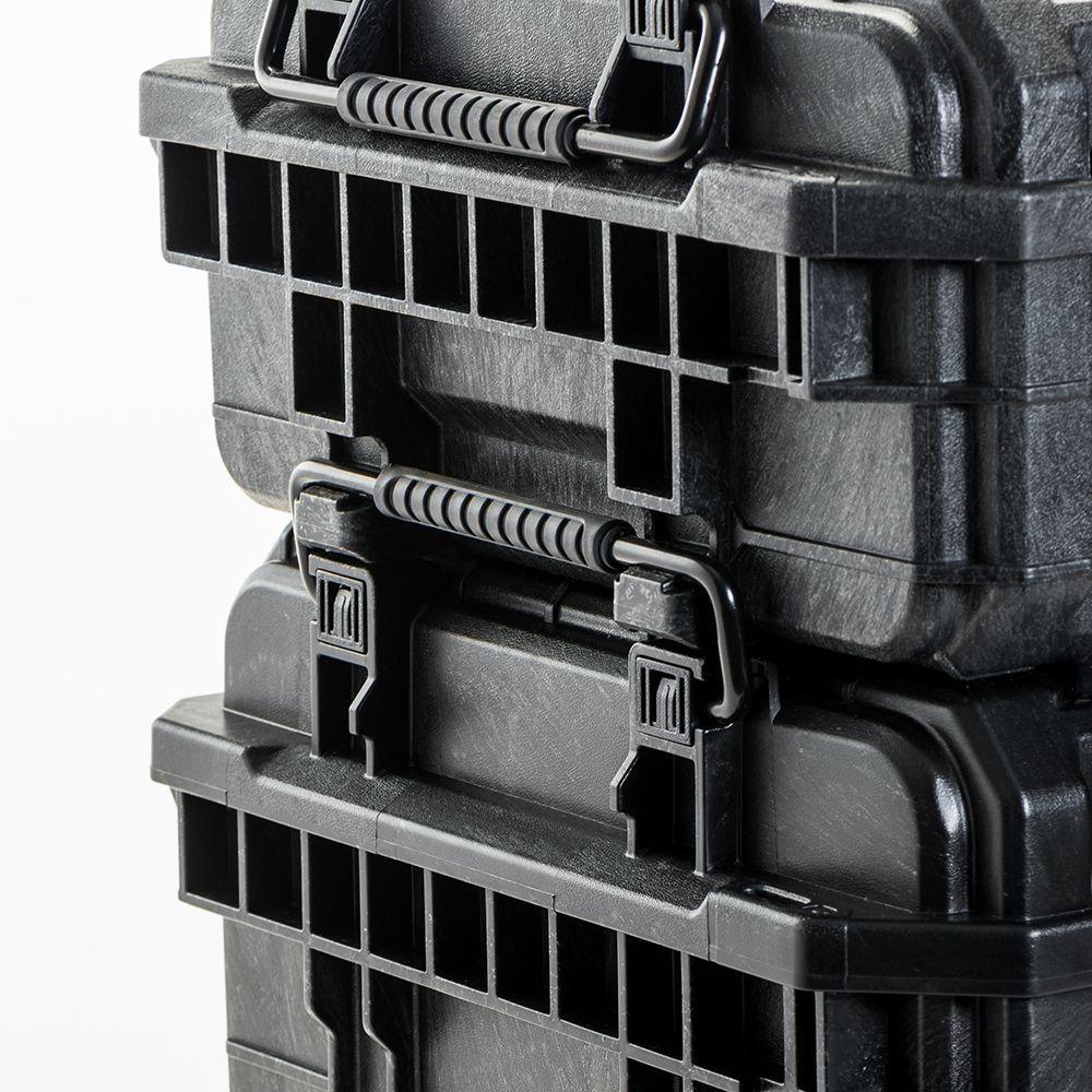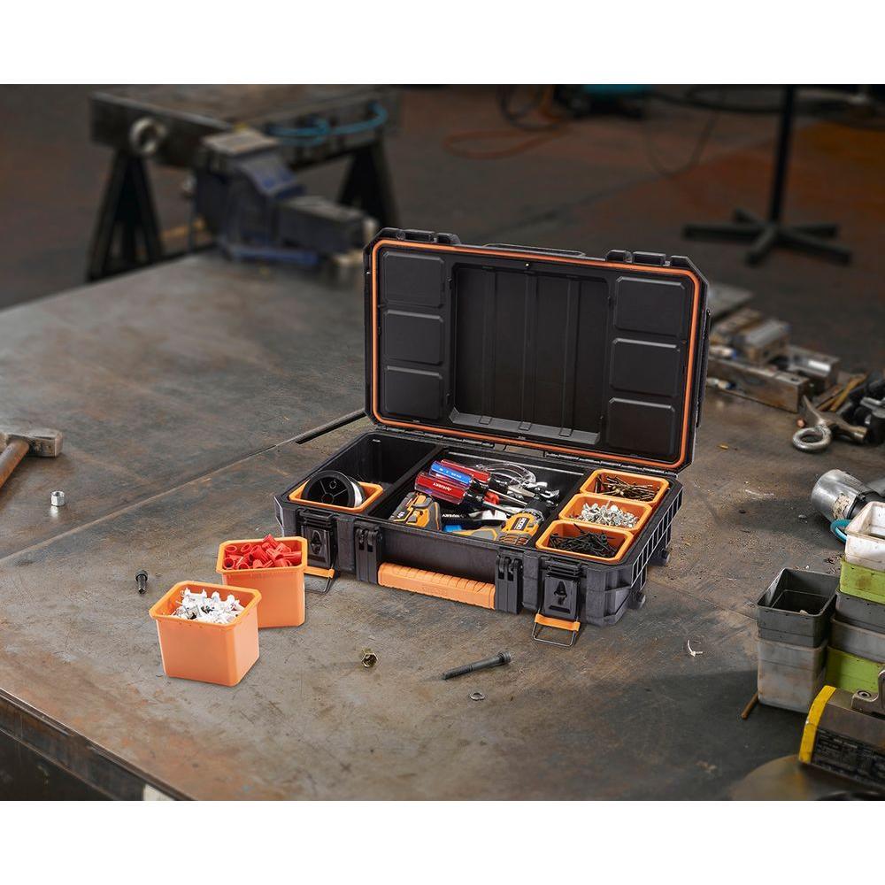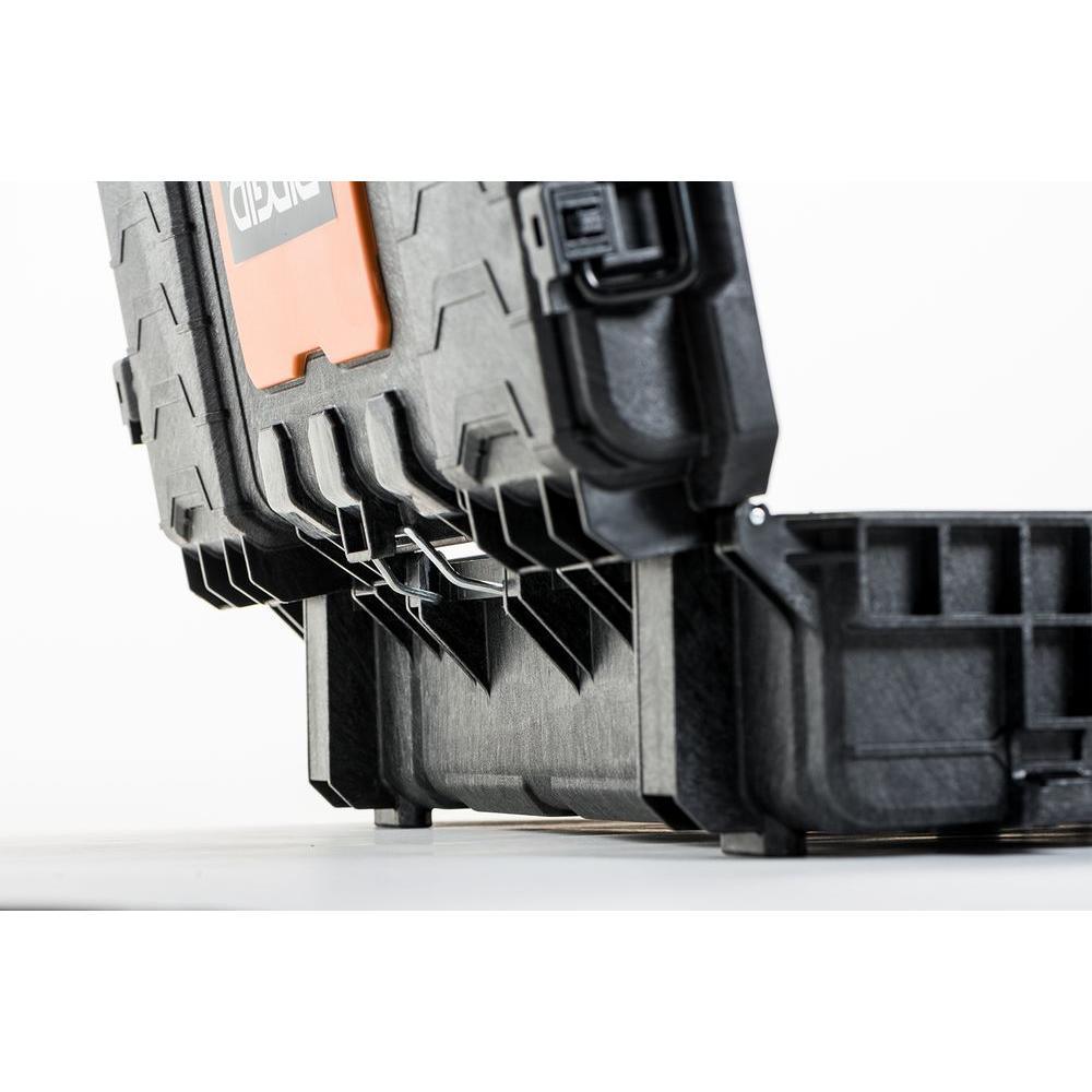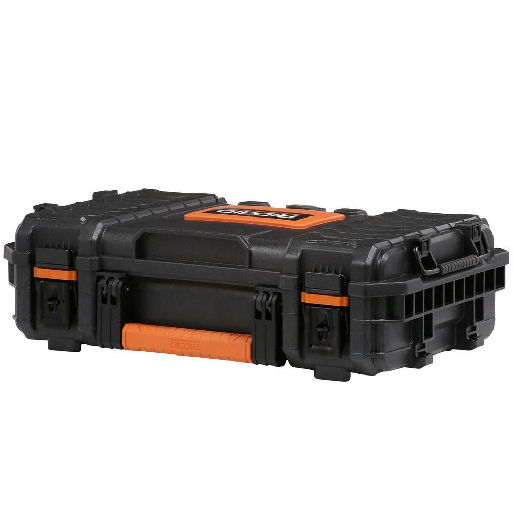 This black RIDGID 22 in. organizer box is made with durable, high-impact resin and constructed to last. It offers heavy-duty metal latches and features an integrated water seal to protect against water and dust intrusion. This organizer works with the RIDGID Pro Tool Storage System for a complete, professional look.