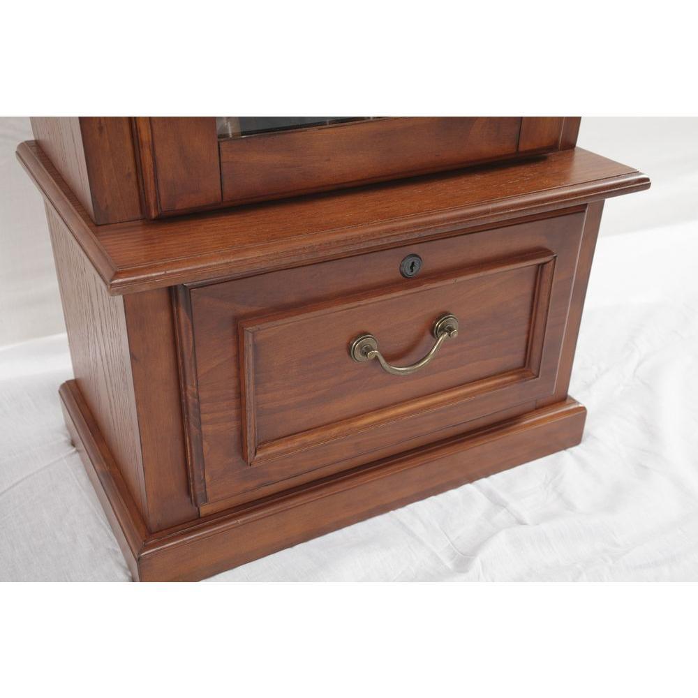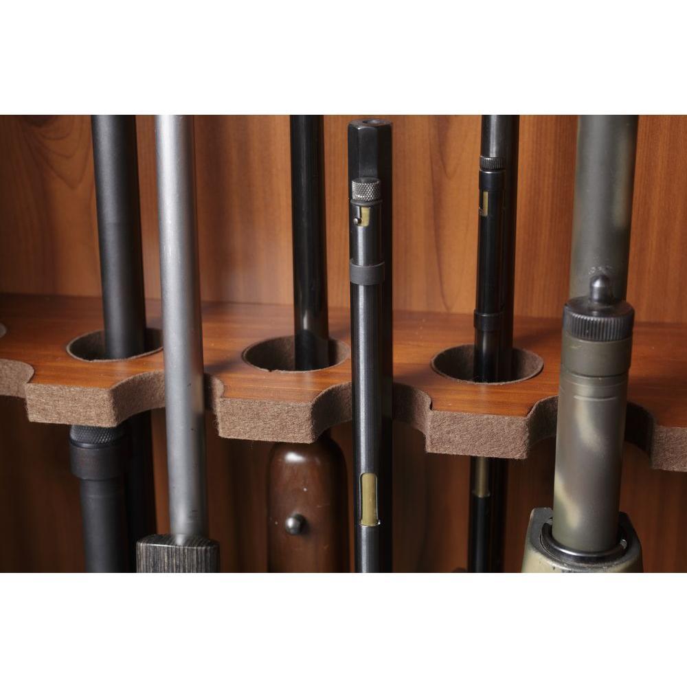 This 8-gun cabinet is finished in solid wood and wood veneers for long-lasting great looks. This fully locking cabinet features felt lined barrel rest and butt plate with storage area behind drop down front door. This cabinet will be a nice addition to any room.