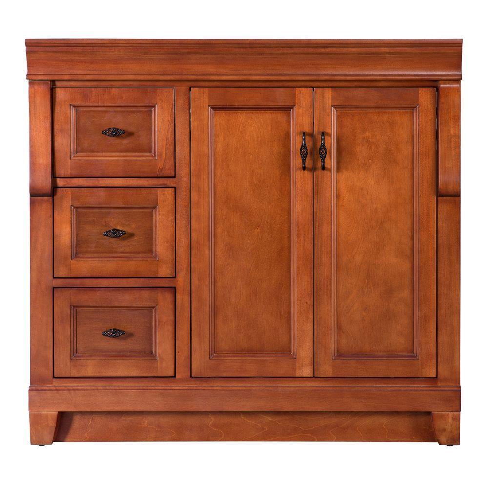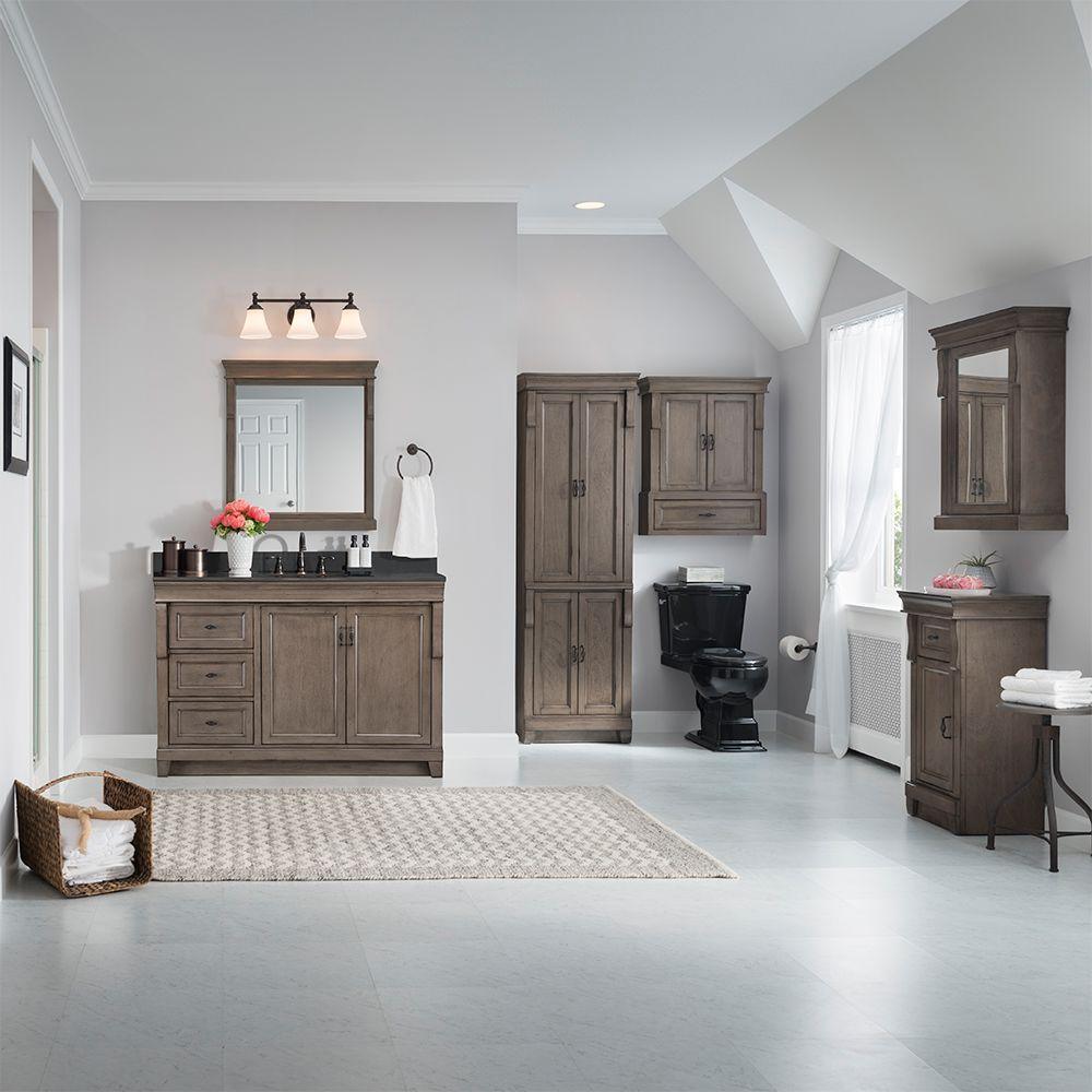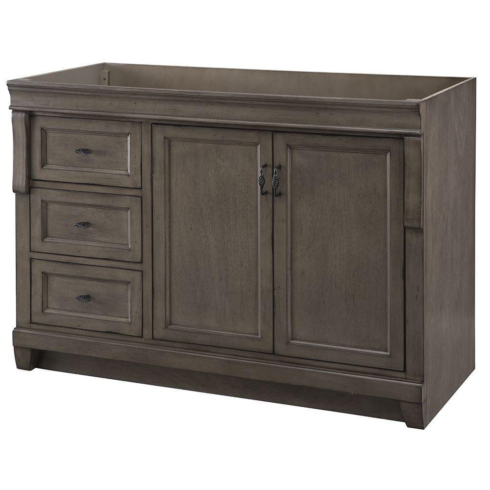 Enveloped in a Distressed Grey finish and accented with black birdcage-style hardware. This fully-assembled, 48 in. vanity features a unique design. Its 3 full-extension drawers are on the left side, providing ample storage space. Behind its 2 beautiful doors on the right lies an even larger storage area that's perfect for stacks of towels and a wide array of bath, skincare and household items. Crafted only with durable woods and designed to accommodate a single center-set basin. (Not included).
