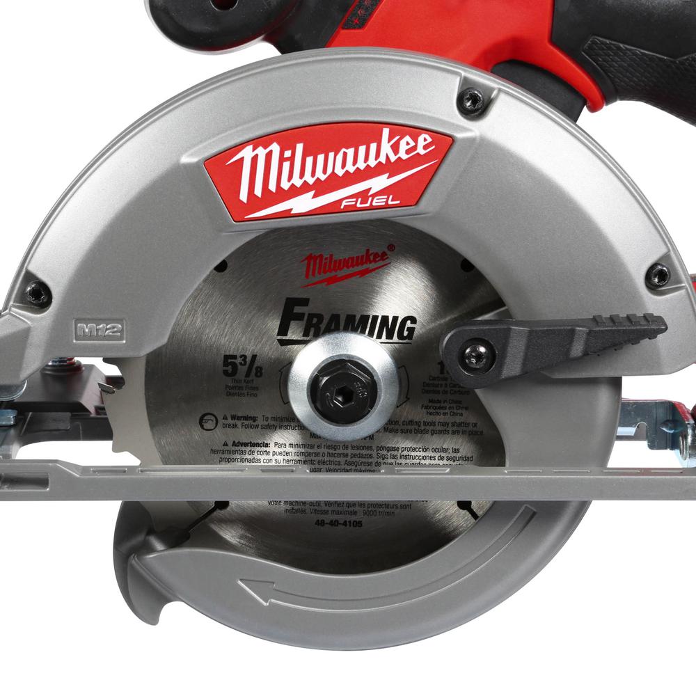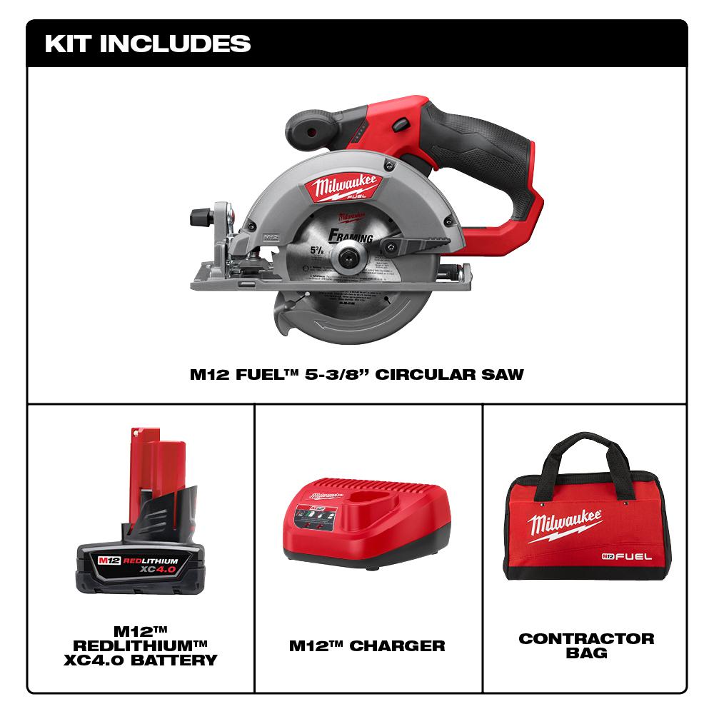 The MILWAUKEE M12 FUEL 5-3/8 in. Circular Saw has a cut capacity of 1-5/8 in. for cutting 2x dimensional lumber and delivers up to 170 cuts per charge and up to 2X the motor life of competitive products. The M12 FUEL circular saw was designed to deliver the power, run-time and durability required by professionals with the ability to cut a wide range of common jobsite materials. The circular saw features a POWERSTATE Brushless Motor outperforms all leading competitors with constant power output, yet runs cooler with no wearable components. REDLINK PLUS Intelligence ensures optimized performance and protects the user’s investment from overload, overheating and over-discharge. The M12 REDLITHIUM XC4.0 Battery Pack provides more work per charge and more work over the life of the pack than competitive batteries. The M12 FUEL 5-3/8 in. Circular Saw features a built in LED light for great cutline visibility and all aluminum guards and shoe for increased durability. In addition to the ciruclar saw, this kit includes 1 M12 REDLITHIUM XC 4.0 Extended Capacity Battery Pack and 1 M12 Charger.