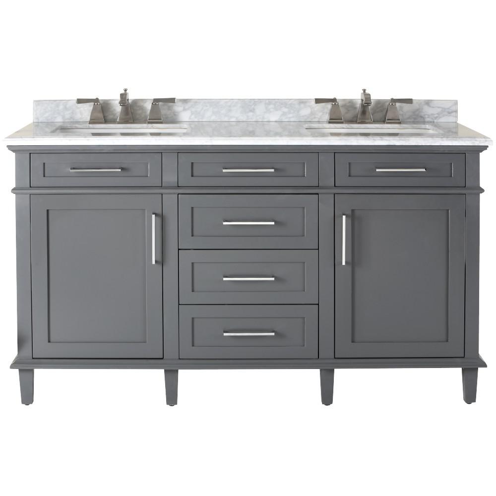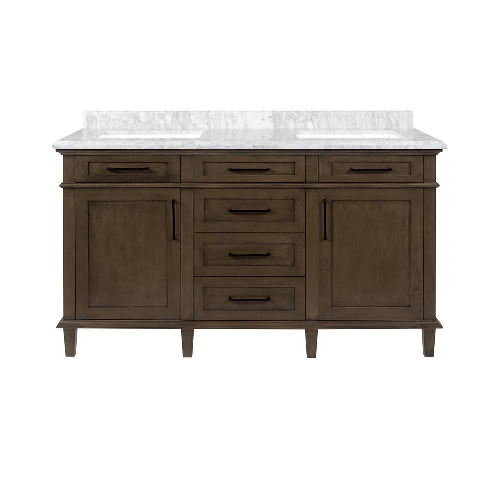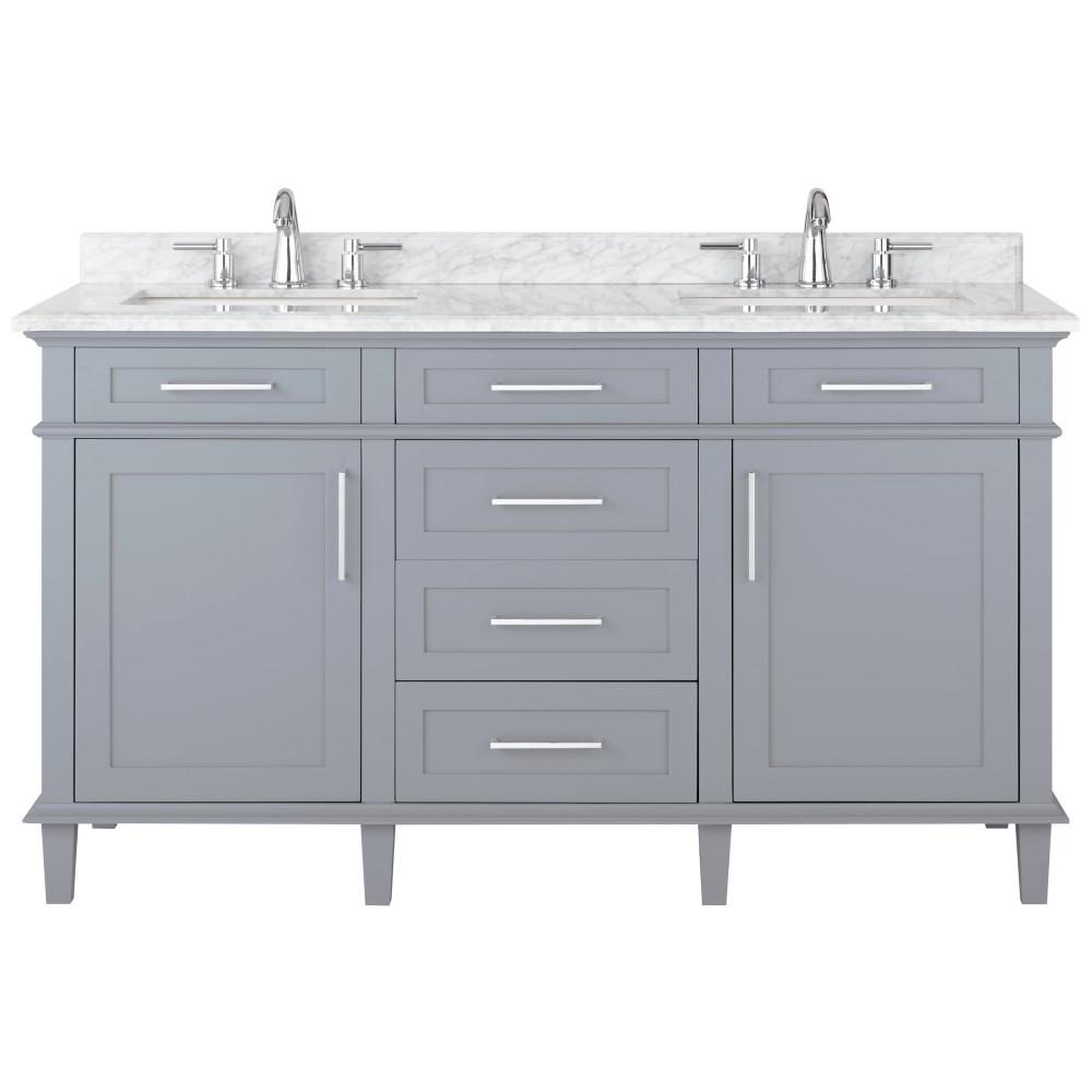 Enhance your bathroom decor with the refined designed of this Sonoma 60 in. W x 22 in. D double bathroom vanity. This waterfall-type vanity features a chrome-finished draw, producing an understated, finished look. The authentic marble vanity top contains swirling or veining that accentuates the beauty of the natural stone. Designed with slightly tapered legs and recessed panels, this modern vanity includes a white ceramic sink and backsplash. It has three soft-close drawers and two soft-close doors; each door features an adjustable shelf. This fully-assembled bathroom vanity is pre-drilled for 8-in. widespread faucets, and the faucets are sold separately. It is crafted from solid wood, plywood and engineered wood for durability.