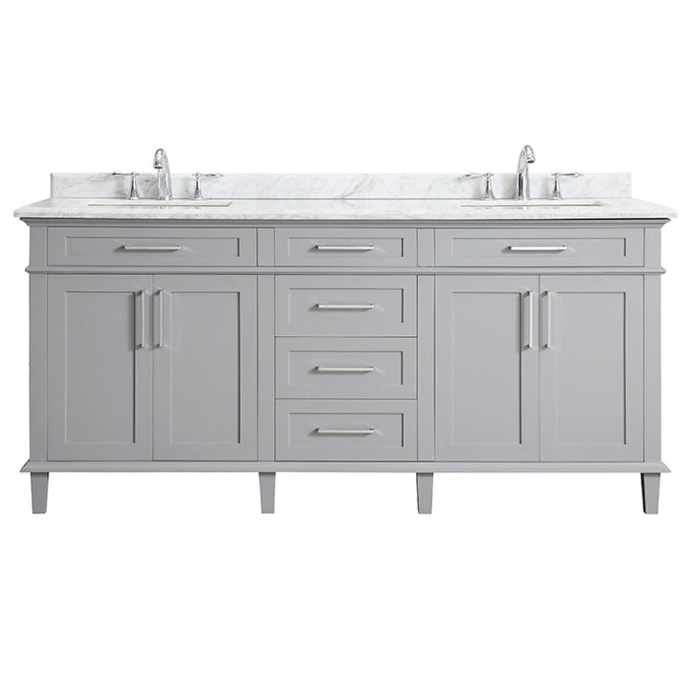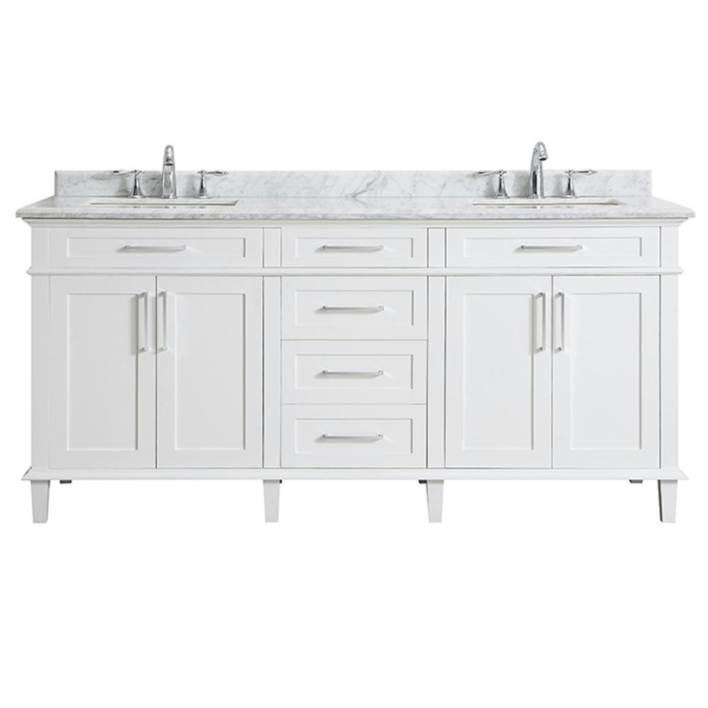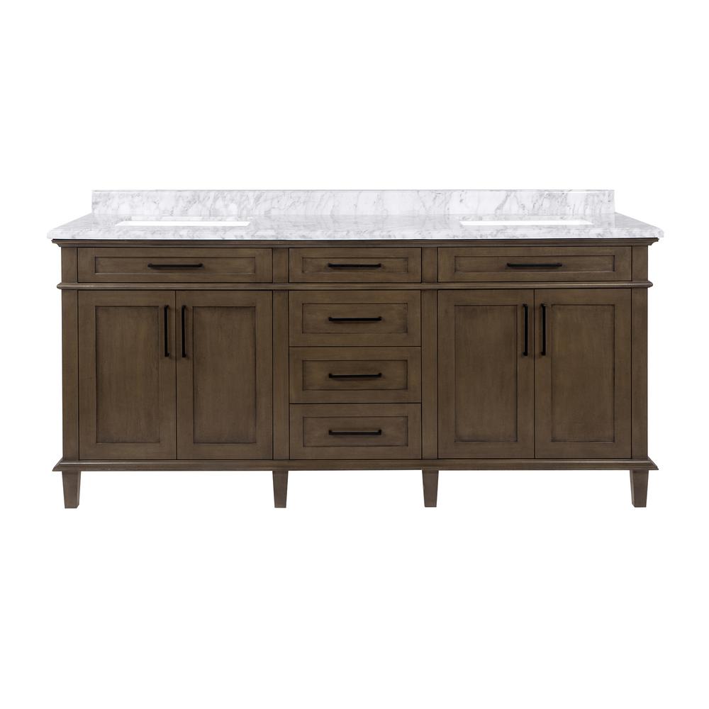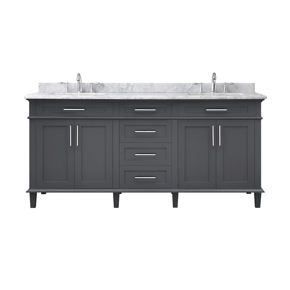 Enhance your bathroom decor with the refined designed of this Sonoma 60 in. W x 22 in. D double bathroom vanity. This waterfall-type vanity features a chrome-finished draw, producing an understated, finished look. The authentic marble vanity top contains swirling or veining that accentuates the beauty of the natural stone. Designed with slightly tapered legs and recessed panels, this modern vanity includes a white ceramic sink and backsplash. It has three soft-close drawers and two soft-close doors; each door features an adjustable shelf. This fully-assembled bathroom vanity is pre-drilled for 8-in. widespread faucets, and the faucets are sold separately. It is crafted from solid wood, plywood and engineered wood for durability.