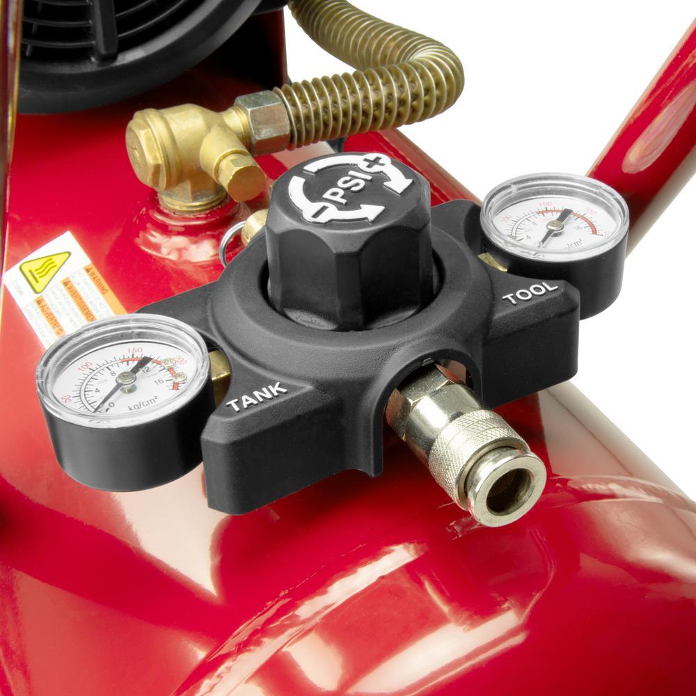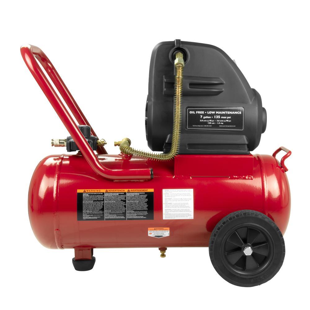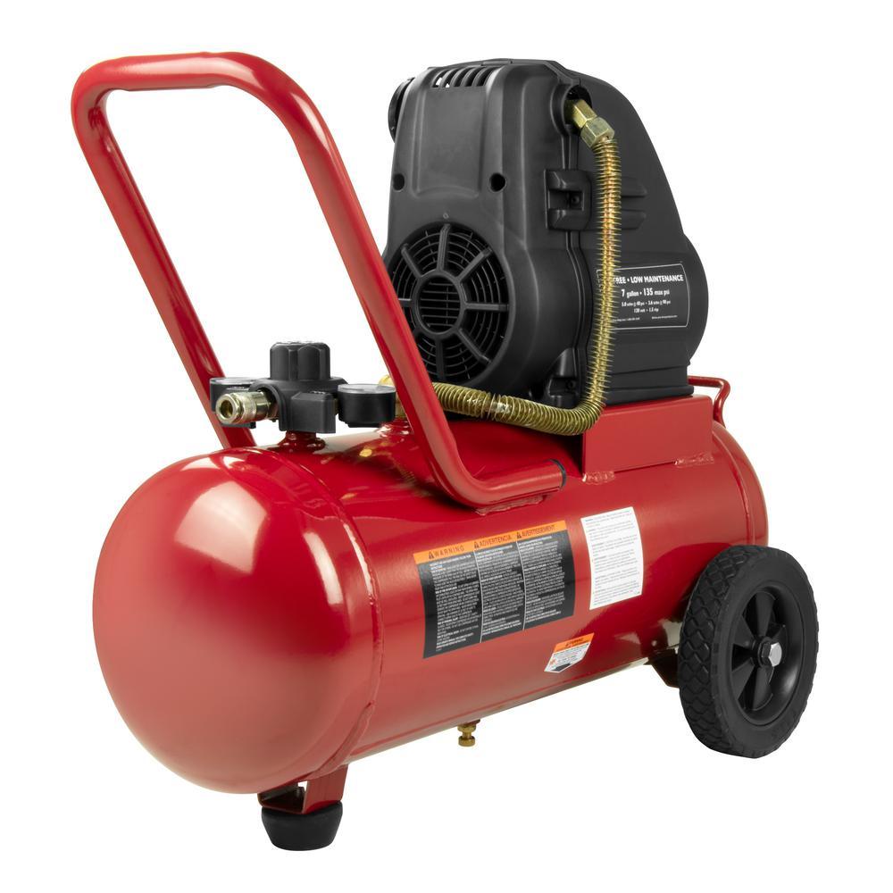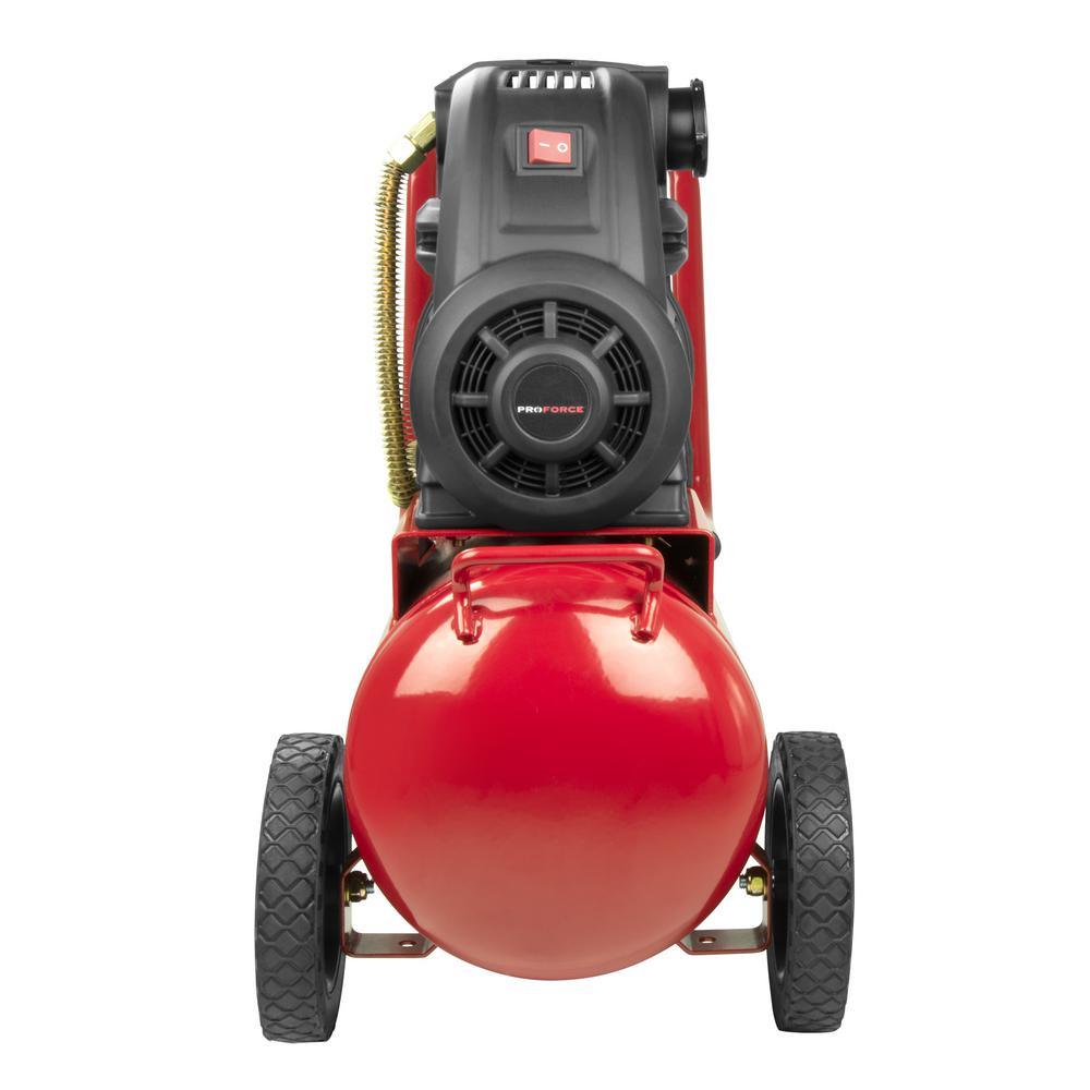 Perform many jobs around the house with the ProForce direct drive oil-free air compressor. This tool is ideal for inflating tires and balls, finish nailing and stapling and blow cleaning. The low-maintenance machine doesn’t require oil changes. This compressor is equipped with a pressure regulator, a pressure gauge and a quick-connect air outlet. Enjoy simple transport with the provided wheels and cushioned handled, and it includes a hose and tire inflation kit