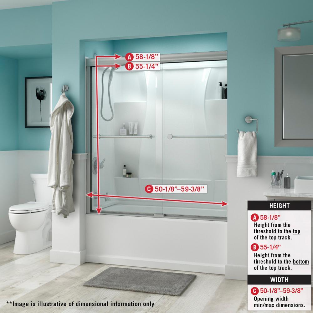 Traditional sliding bathtub door designed to accommodate out-of-plumb (uneven, not vertically level) conditions totaling 3/8 in.
