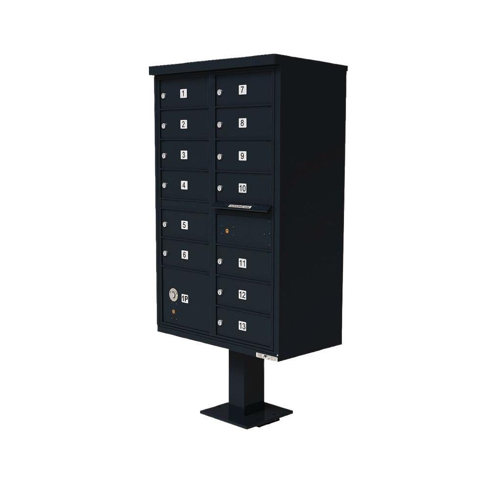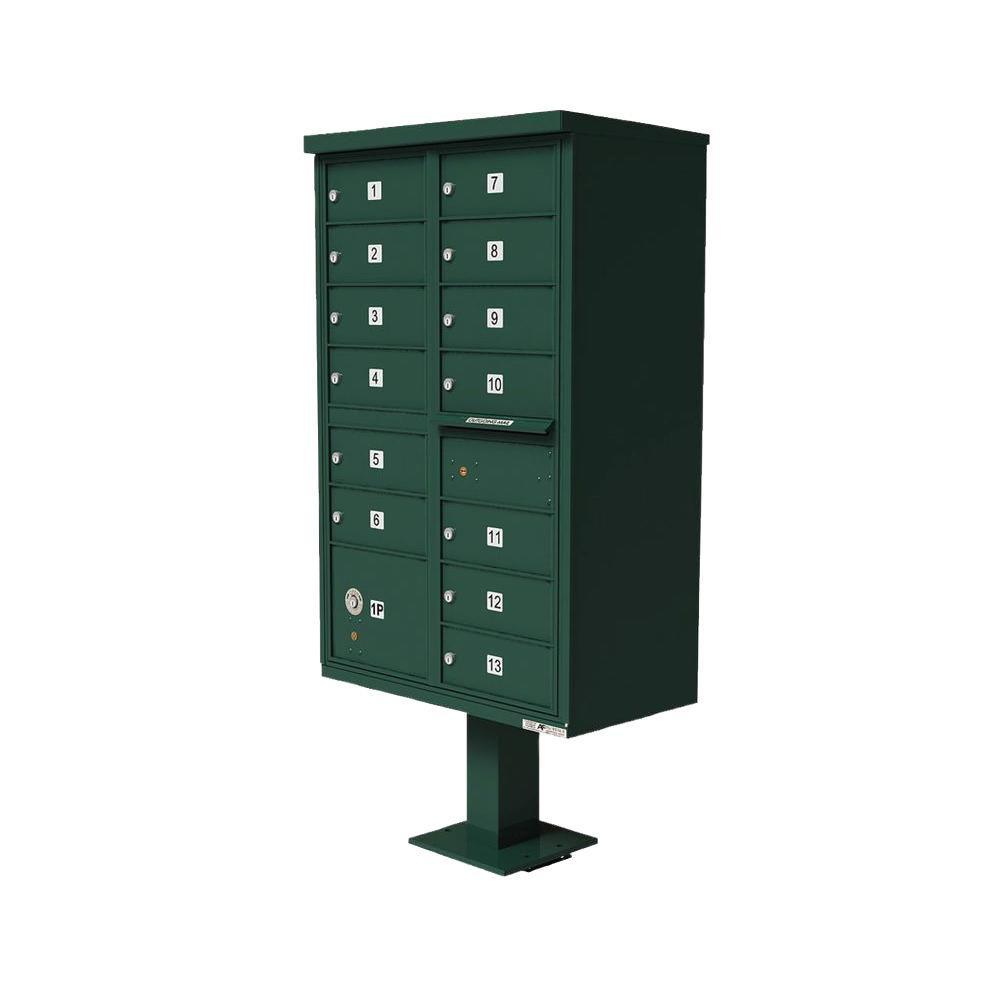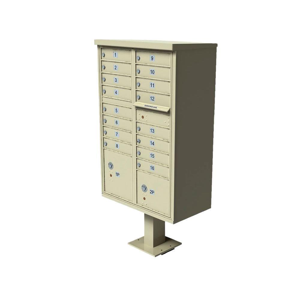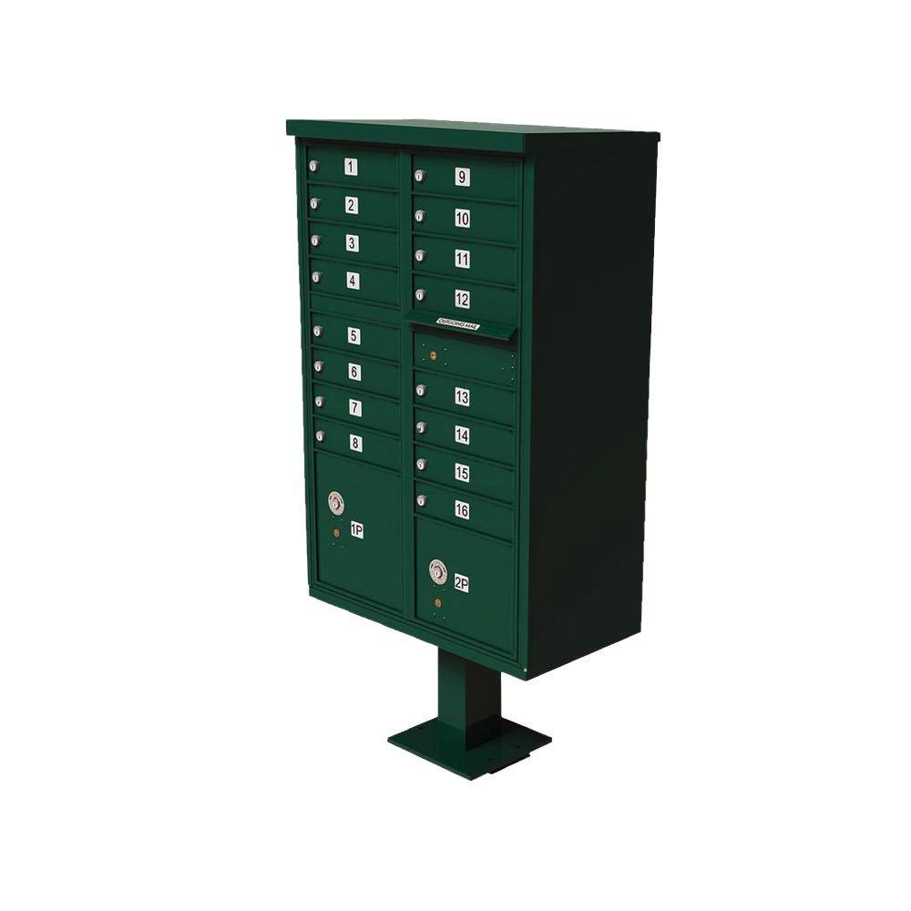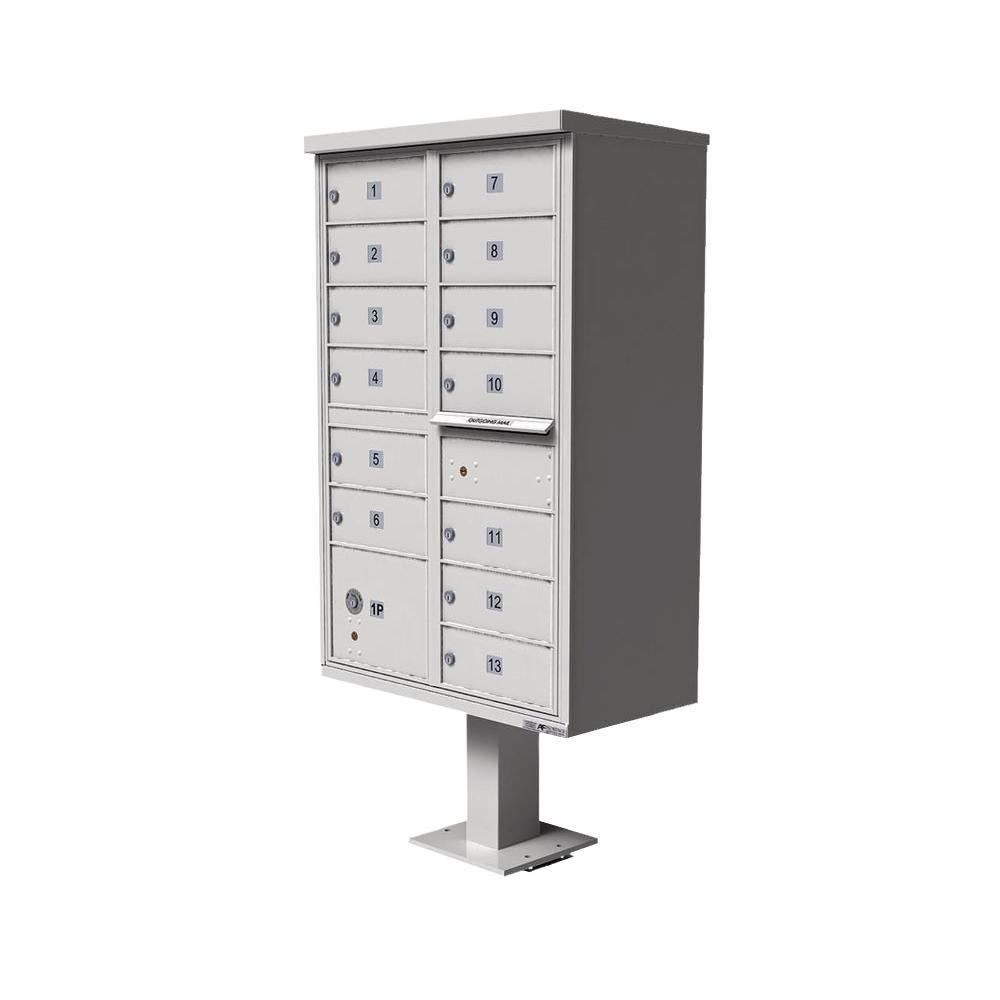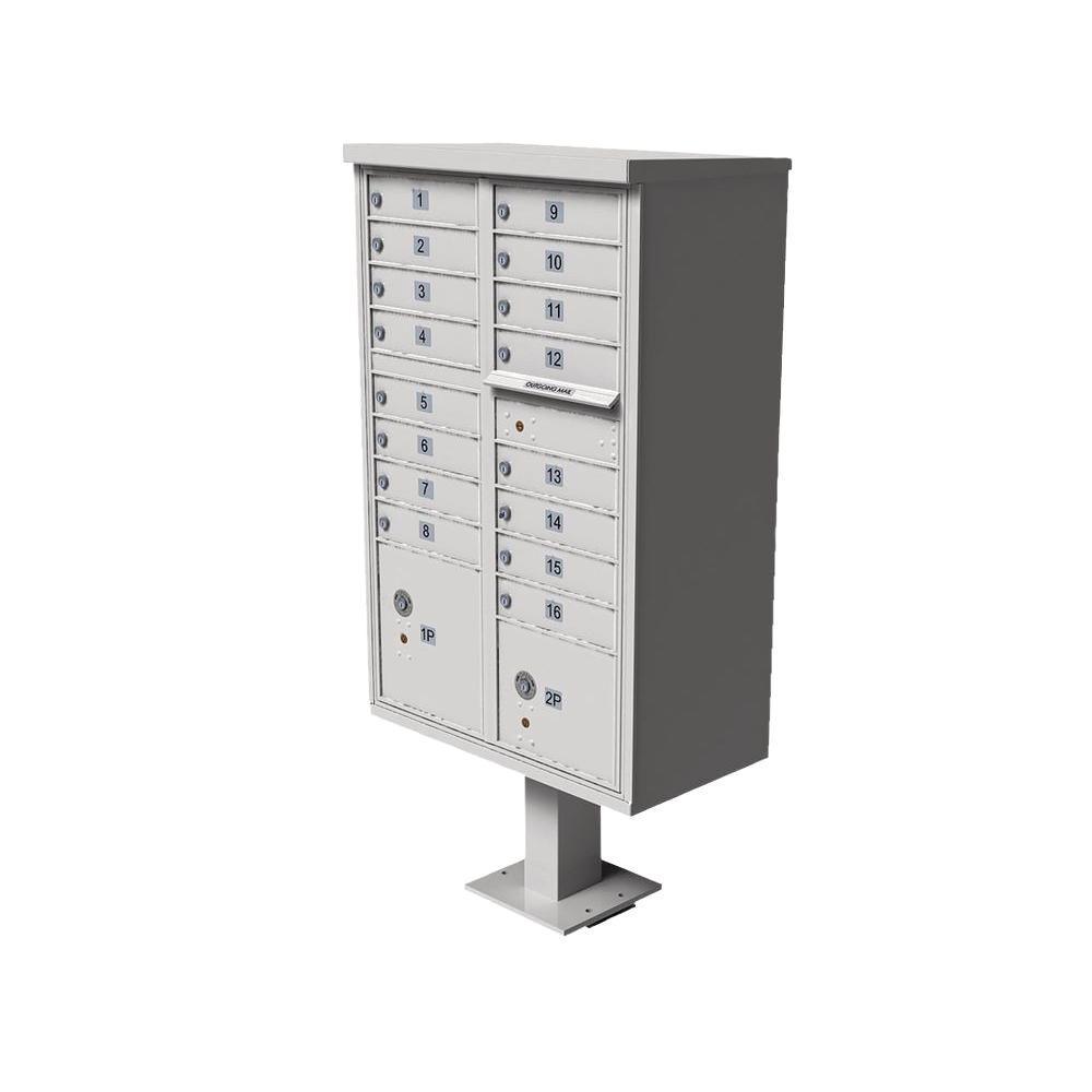 Featuring a heavy gauge, welded construction and a heavy-duty pedestal, the Florence 1570 Type III 16-Compartment Cluster Box Unit easily resists the elements to ensure parcels and mail remain safe. With the combined strength of aluminum and steel, this unit provides 16 compartments, 2 shared parcel lockers and an outgoing mail receptacle for convenience. Each master door is reinforced with 4 hook latches for added protection against theft or vandalism.
