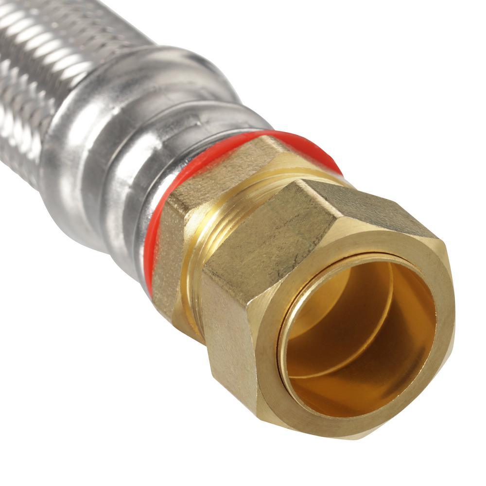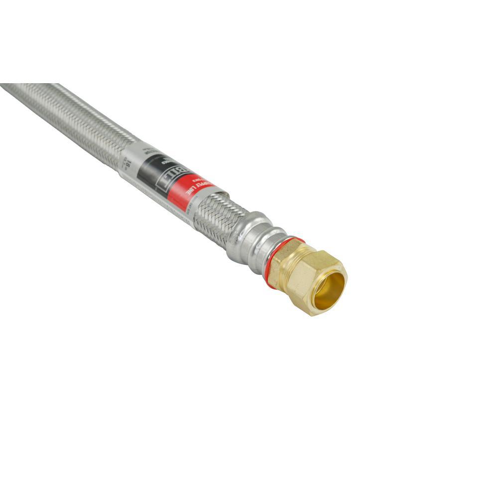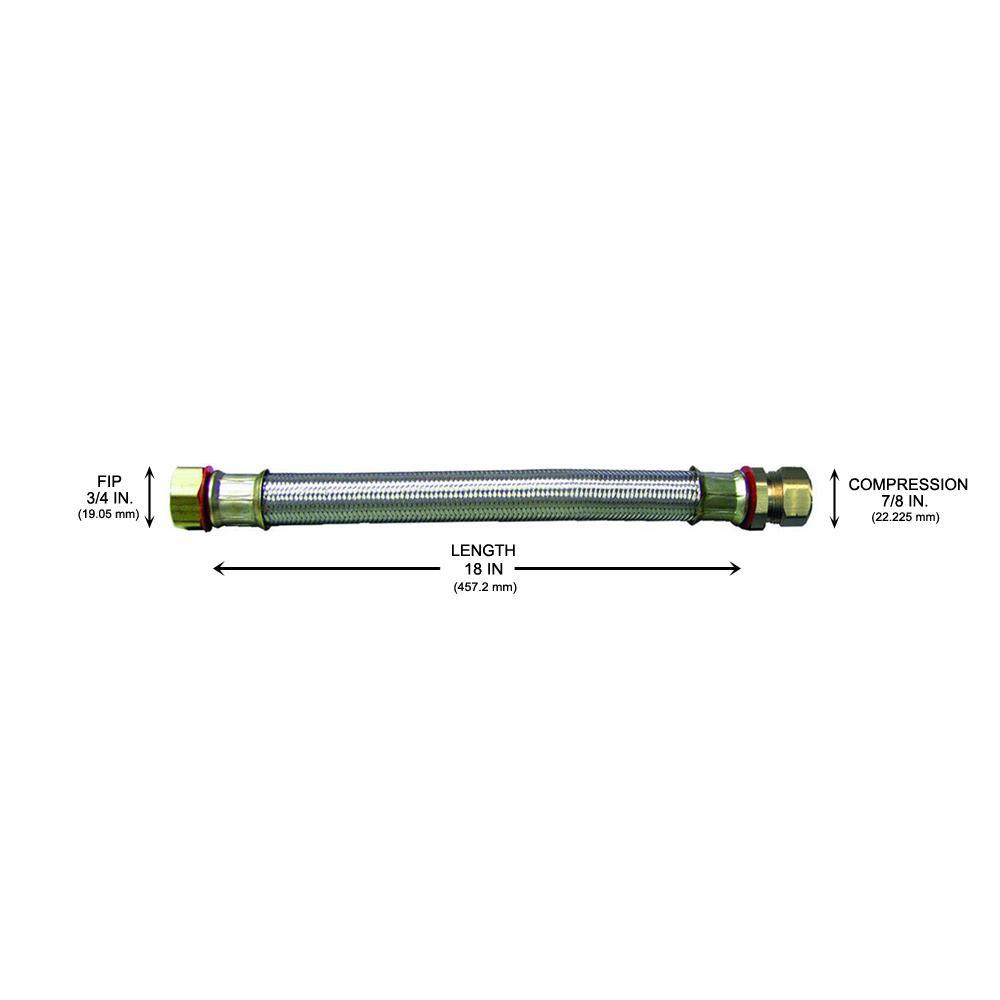 This 3/4 in. x 7/8 in. x 18 in. stainless steel braided supply line starts with an extruded core of PVC tubing. The core is then over-braided with polyester yarn and another layer of PVC material. The final layer consists of stainless steel braid to form a strong, yet flexible supply line.