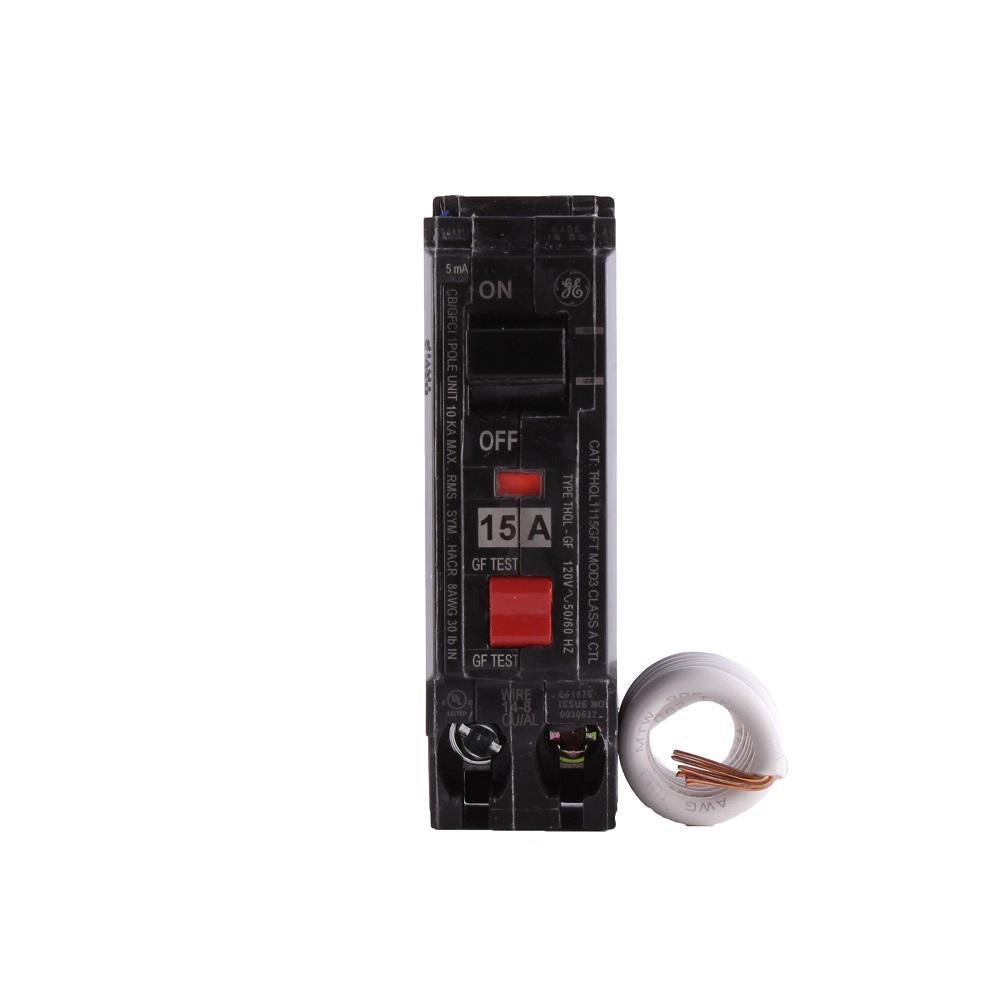 The GE 15 Amp Single Pole Ground Fault Circuit Breaker with Self-Test features a tin plated copper stab that ensures a durable, long-lasting, and corrosion-resistant connection. It serves as a replacement for GFCI wall outlets and provides a reliable means to locate the source of a tripped circuit (back to the electrical panel). No more guessing which outlet to reset. The Self-Test function is a UL requirement for all GFCI devices, starting in June 2015. This GFCI variant ensures proper performance by conducting periodic diagnostic tests on its ground circuitry. In case of any issues, the breaker will trip and require replacement. The unit provides protection against overloads, short circuits, and ground faults, quickly shutting off power to prevent serious shock. It also detects even the lowest levels of electrical current leakage (ground faults). With a Class A 5mA ground fault circuit interrupter, it is suitable for wire range #14-8 AWG CU/#12-8.