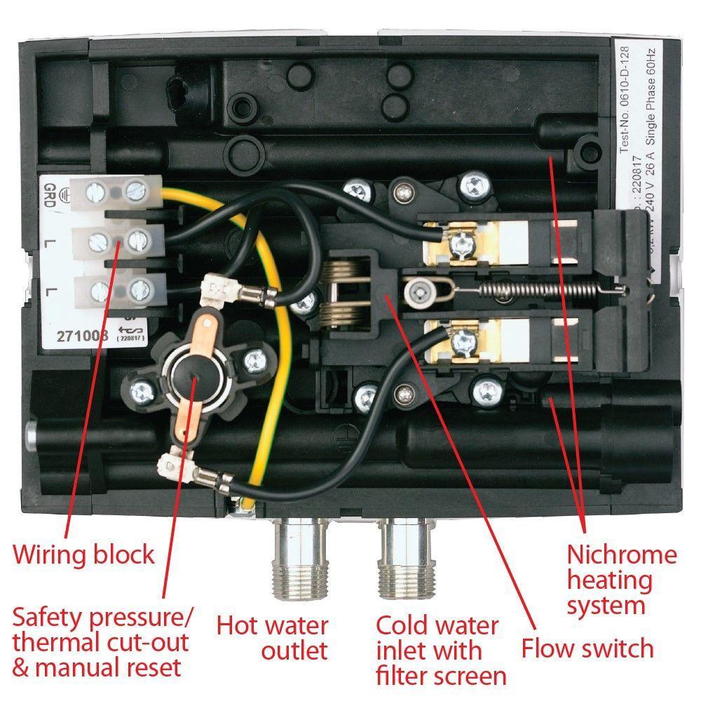 - A special flow switch control protects the nichrome heating element from failure caused by dry-firing