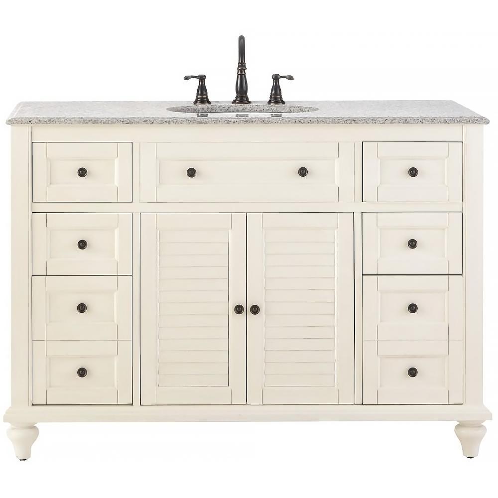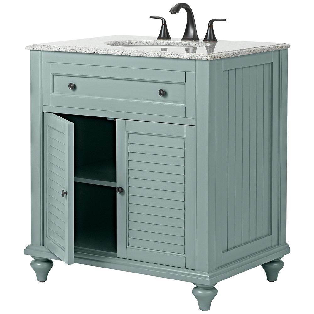 Perfect for a powder room or small bathroom, our Hamilton Shutter Vanity offers classic cottage charm. The faux drawer in front of the sink features an inset panel; the two soft-close doors boast louvered panels. Turned feet and a granite top complete the look. Crafted of real granite, the vanity top may contain swirling or veining. These features are part of the natural beauty of stone and have no effect on function or durability.