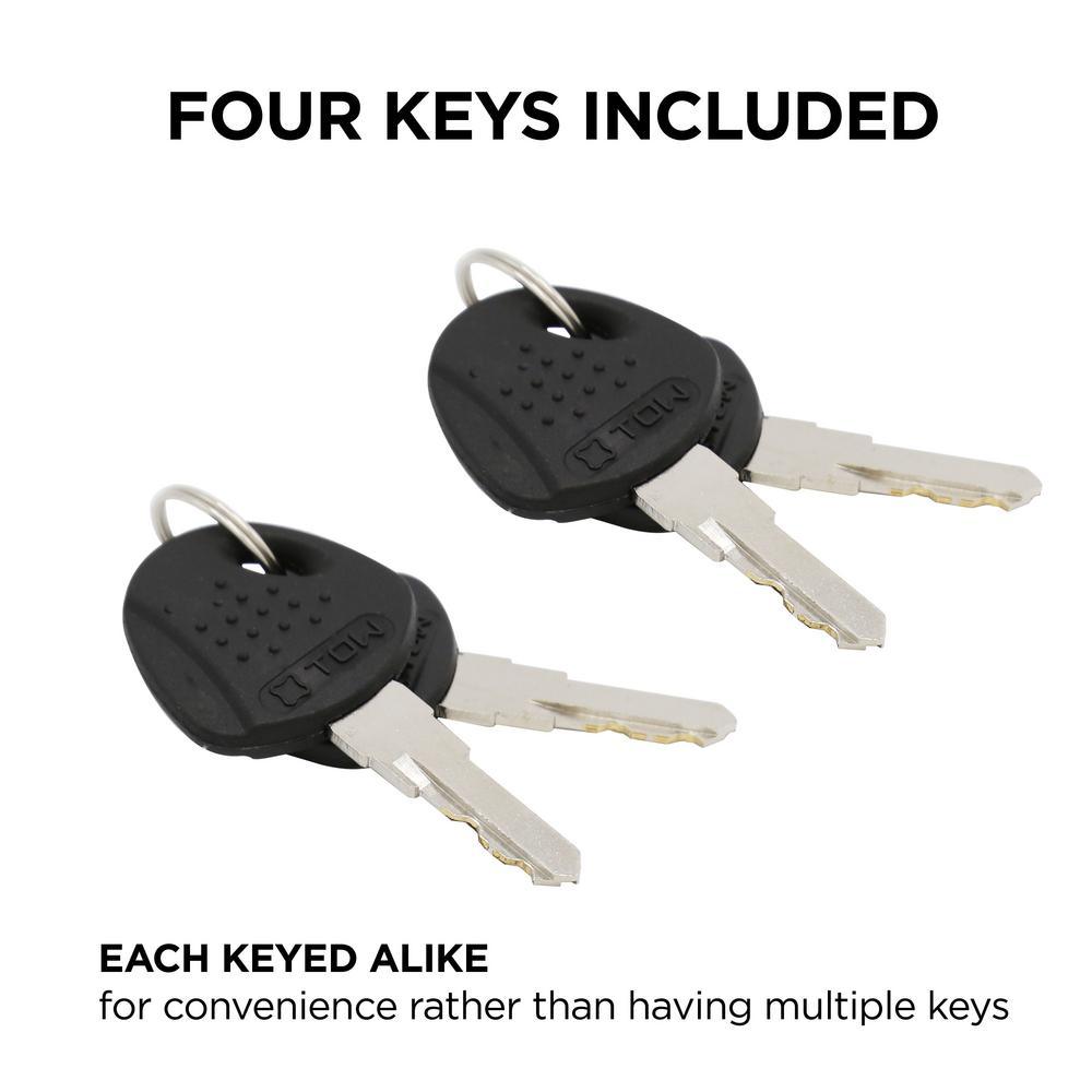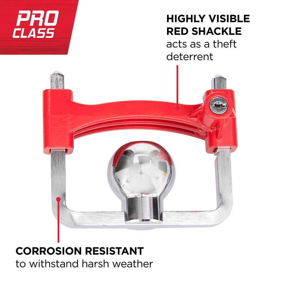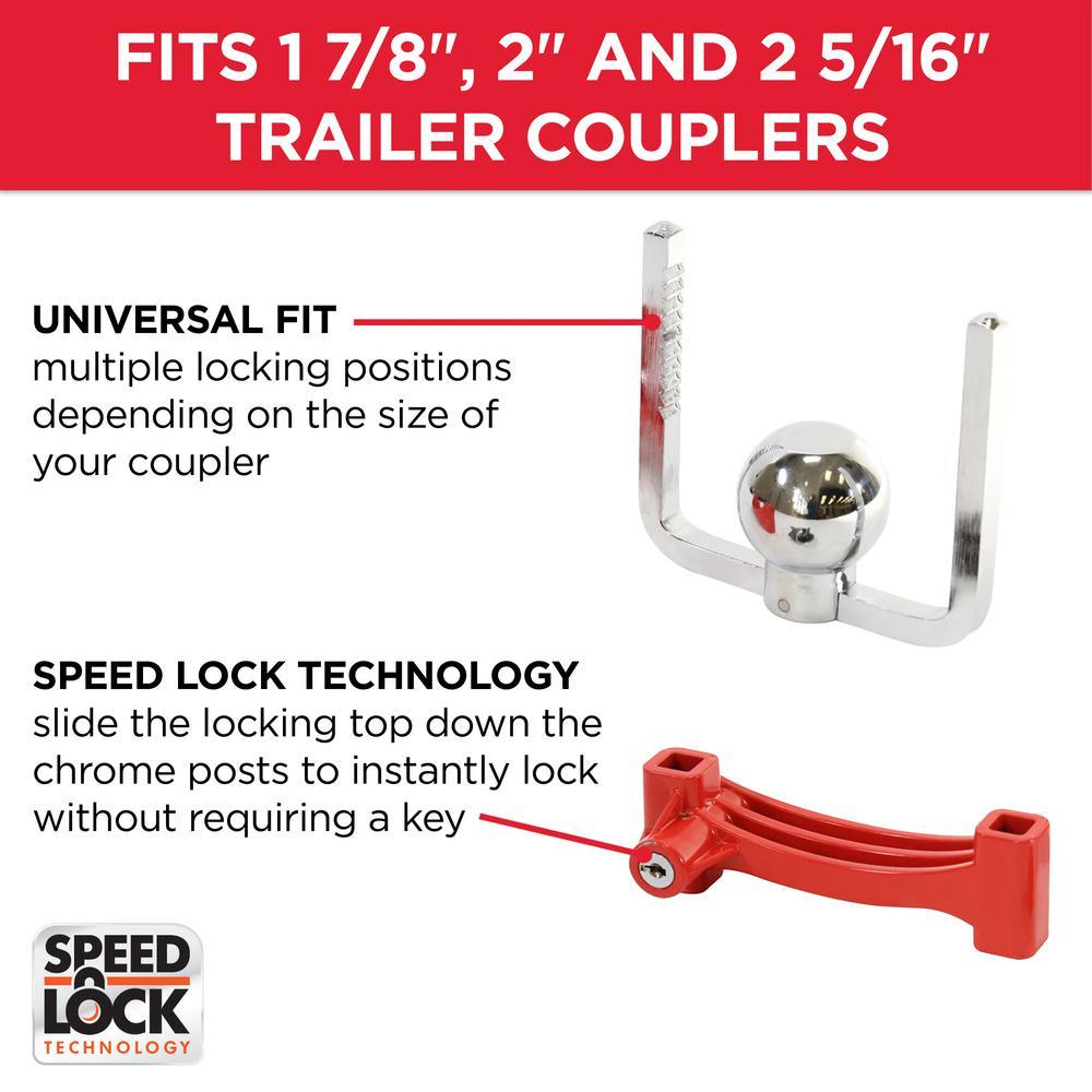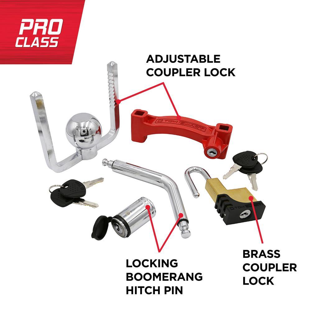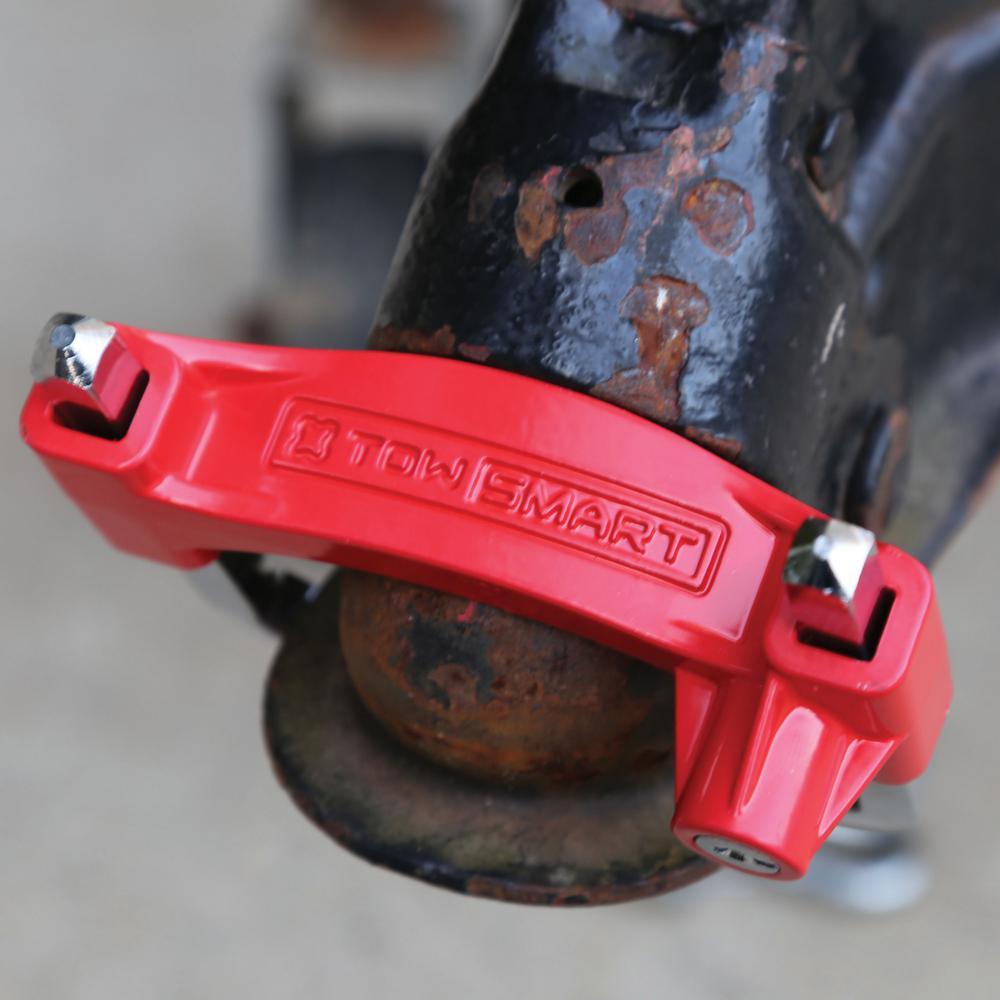 The TowSmart Boomerang Hitch Pin and Coupler Lock protects your boats, campers, trailers, equipment and other valuable assets from theft. It easily secures your ball mount or hitch accessories to the receiver hitch. Simply insert the pin into the fastener hole once you have positioned the ball mount or hitch accessory in the receiver hitch. The Boomerang Hitch Pin offers a patented, reversible dual diameter design that fits 1/2 in. and 5/8 in. receivers. It provides a tight and secure fit and is made of corrosion-resistant materials designed to withstand harsh weather conditions. The Coupler Lock secures the trailer to the ball mount when in tow and provides superior protection to the trailer when it is left unattended. Weather resistant dust caps protect the locking mechanism from moisture and dirt build up. This product is not recommended to remain on vehicles for an extended period of time. Includes 4 keys that are keyed alike for convenience rather than having multiple keys.
