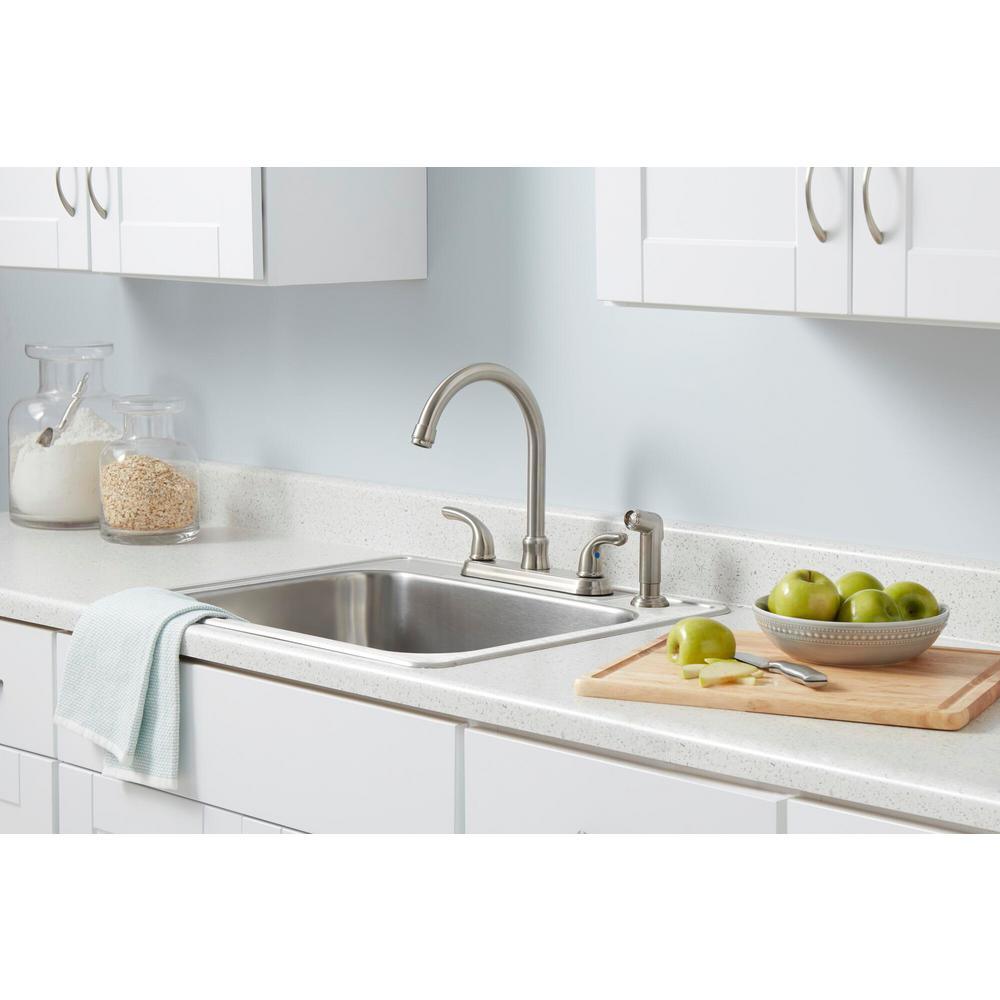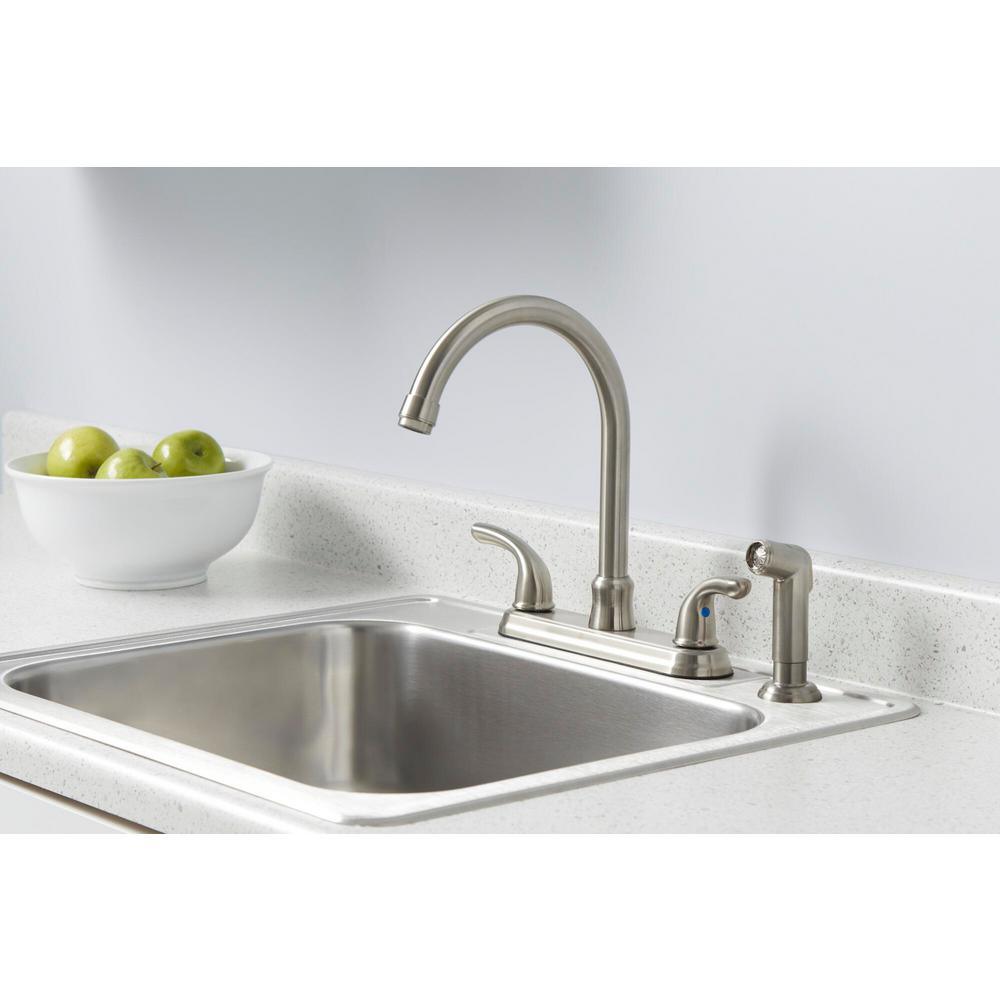 The Glacier Bay Builder 2-Handle Kitchen with sprayer in Stainless finish offers a convenient high arc spout for ease of use in the kitchen. The included a side sprayer makes cleaning the sink, washing vegetables, or filling containers quick and easy. Glacier Bay provides a Limited Lifetime Warranty.