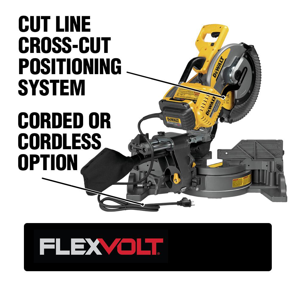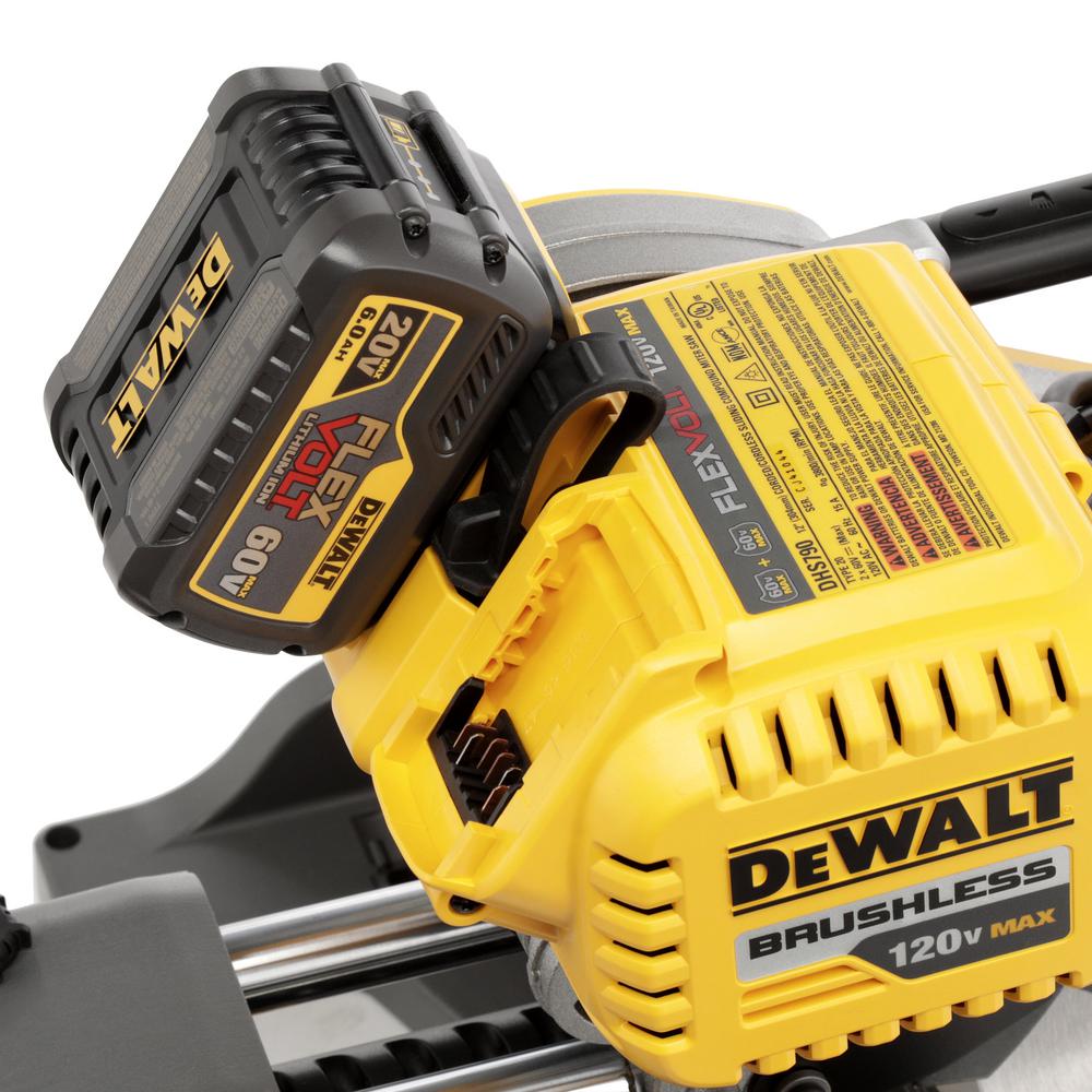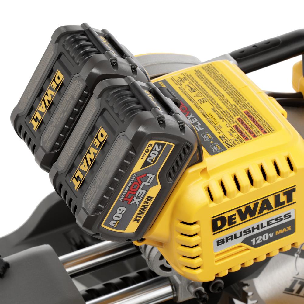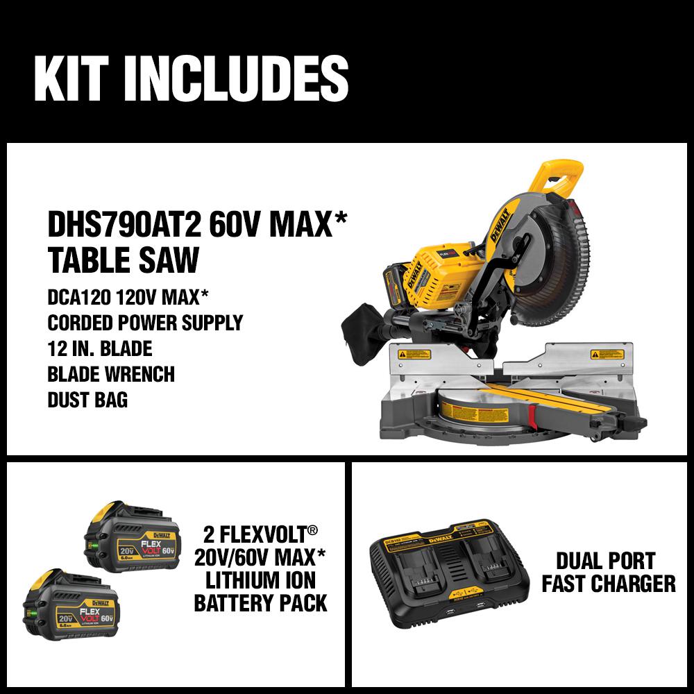The DHS790AT2 offers flexible power options - corded for unlimited runtime or cordless for portability powered by DEWALT brushless motor technology. Accuracy is delivered through adjustable miter scale with 11 positive stops and high visibility bevel scale the CUTLINE blade positioning system. The kit includes 2 60-Volt MAX lithium-ion battery packs, a dual port fast charger and the DC120A corded power supply.