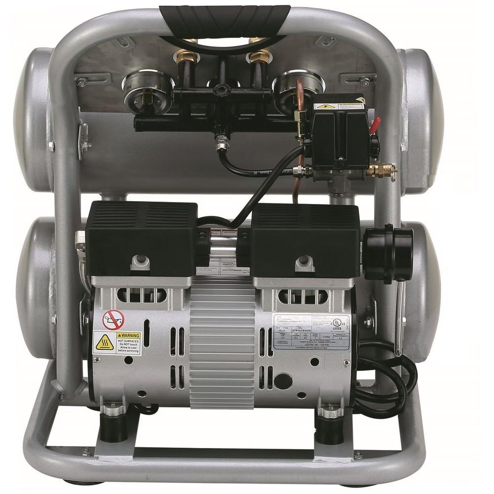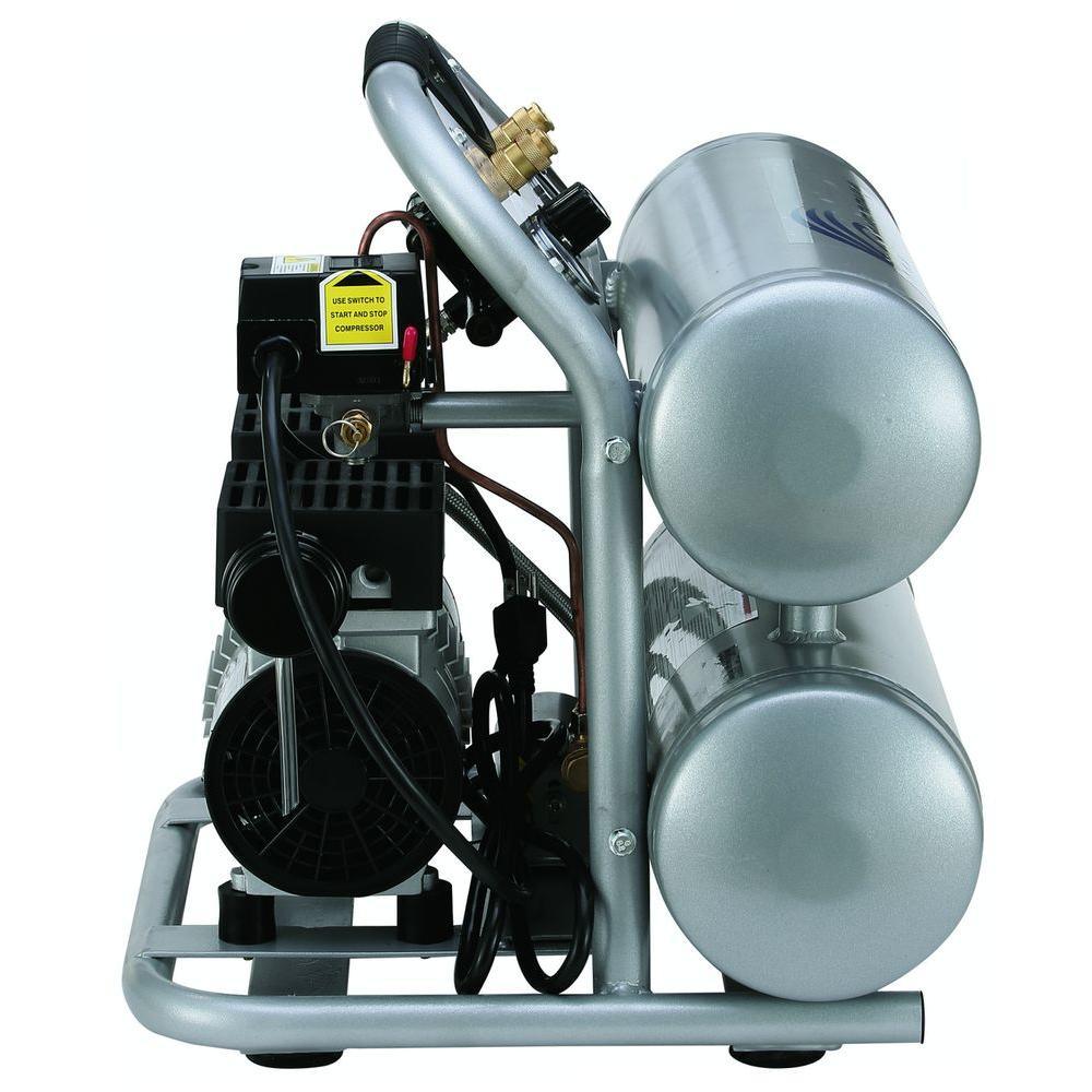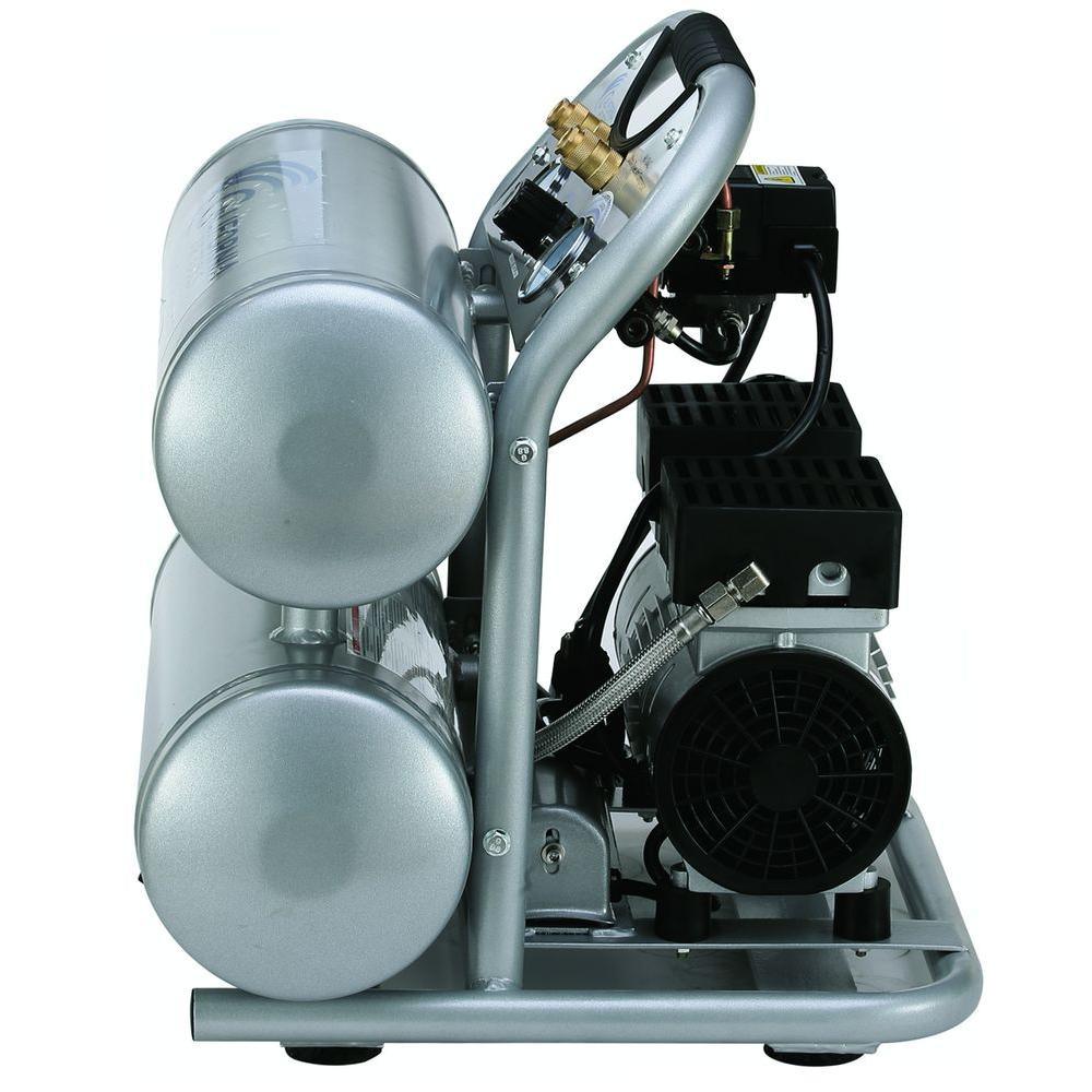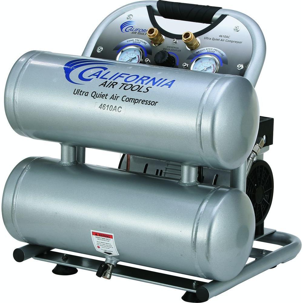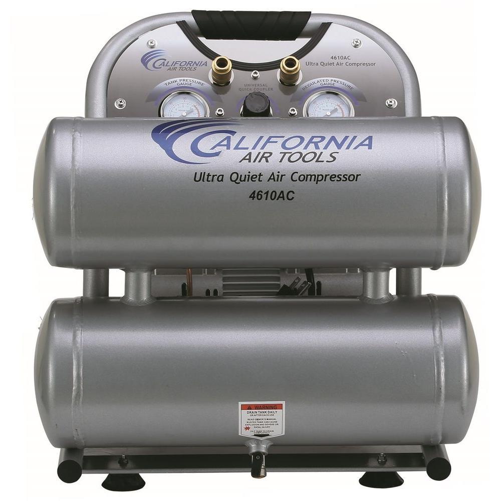 The California Air Tools 4610AC Ultra Quiet and Oil-Free Air Compressor is designed to be one of the quietest air compressors in the industry having only 60 dB of sound. The powerful 1.0 HP (SP-9413) motor operates at only 1,680 RPM creating less noise and less wear. The "New" SP Series of Ultra Quiet Air Compressor Motors have been designed to increase duty cycle and allow for longer continuous run times. The Oil-Free Dual Piston Pump System is engineered for high performance and durability. The CAT-4610AC Air Compressor has an Oil-Free Dual Piston pump designed to have a life cycle before wear of 3,000 Plus hours compared to other comparable air compressors with life cycles of 500 hours or less. The Oil-Free pump allows for use in a variety of temperatures and uneven terrains. The 4.6 Gal. Aluminum (Rust-Free) Air Tank is Lightweight (45.5 lbs.) and very easy to transport. This air compressor is ideal for anyone working inside where noise is a major issue.