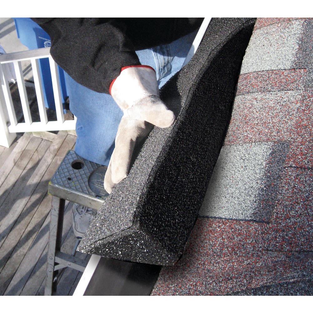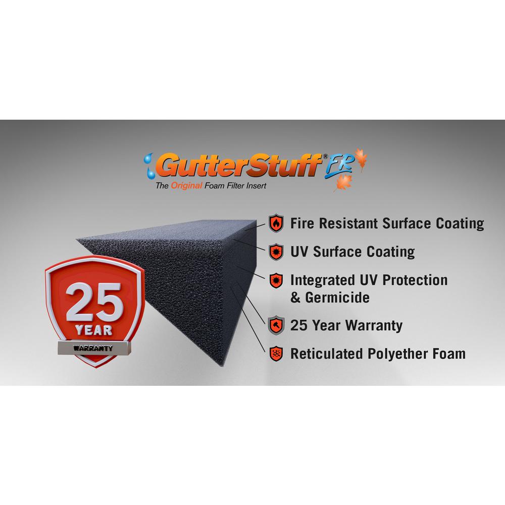 GUTTERSTUFF FR, the easiest self-installed gutter filter on the market. It is affordable and invisible from the ground. GUTTERSTUFF FR eliminates dangerous and dirty gutter cleaning so you can spend time doing the things you enjoy. Unlike other systems, installation is simple and easily installs in minutes. It does not require special tools. GUTTERSTUFF FR fits completely inside any 5 in. K-style gutter-the most common style and size on the market today. When you reach a corner you make a miter cut using a scissors or a knife. GUTTERSTUFF seals out leaves while allowing large volumes of water to flow through quickly. No other gutter cover, screen or guard system works as effectively to keep debris from entering the gutter. Product comes in eight 4 ft. sections made from polyether outdoor durable foam; this lightweight insert won’t crumble, dent, bend or cave in, allowing for satisfied customers. It also prevents mosquitoes from breeding in the gutter. The foam’s main structure includes a UV stabilizer and a germicide, prolonging the life of the foam. Additional surface coating includes fire retardant compound. Provides value through UV safeguarding as well as protecting the foam overall from the elements. Includes a 25-year warranty.
