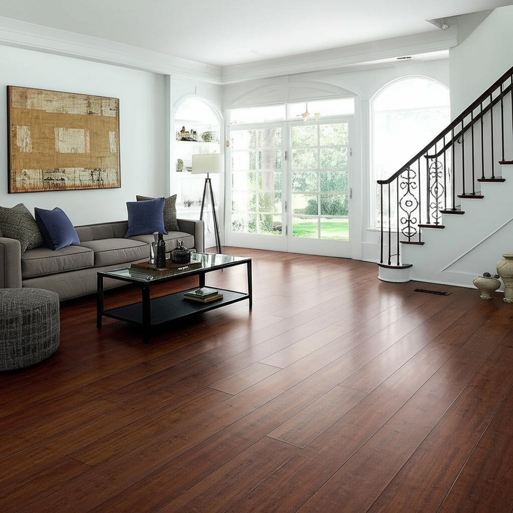 Transform your living space with the rich, hand-scraped texture of this engineered bamboo flooring. Its chestnut finish exudes warmth and sophistication, making it a perfect choice for both modern and rustic interiors. Pair it with neutral tones and textured rugs to create a cozy yet refined ambiance. This flooring is not just a surface; it's a statement of sustainable luxury.
