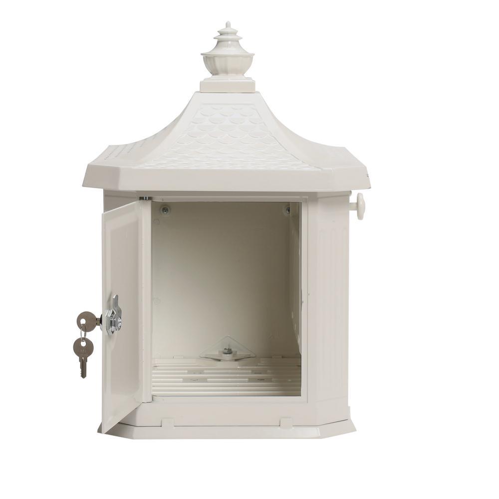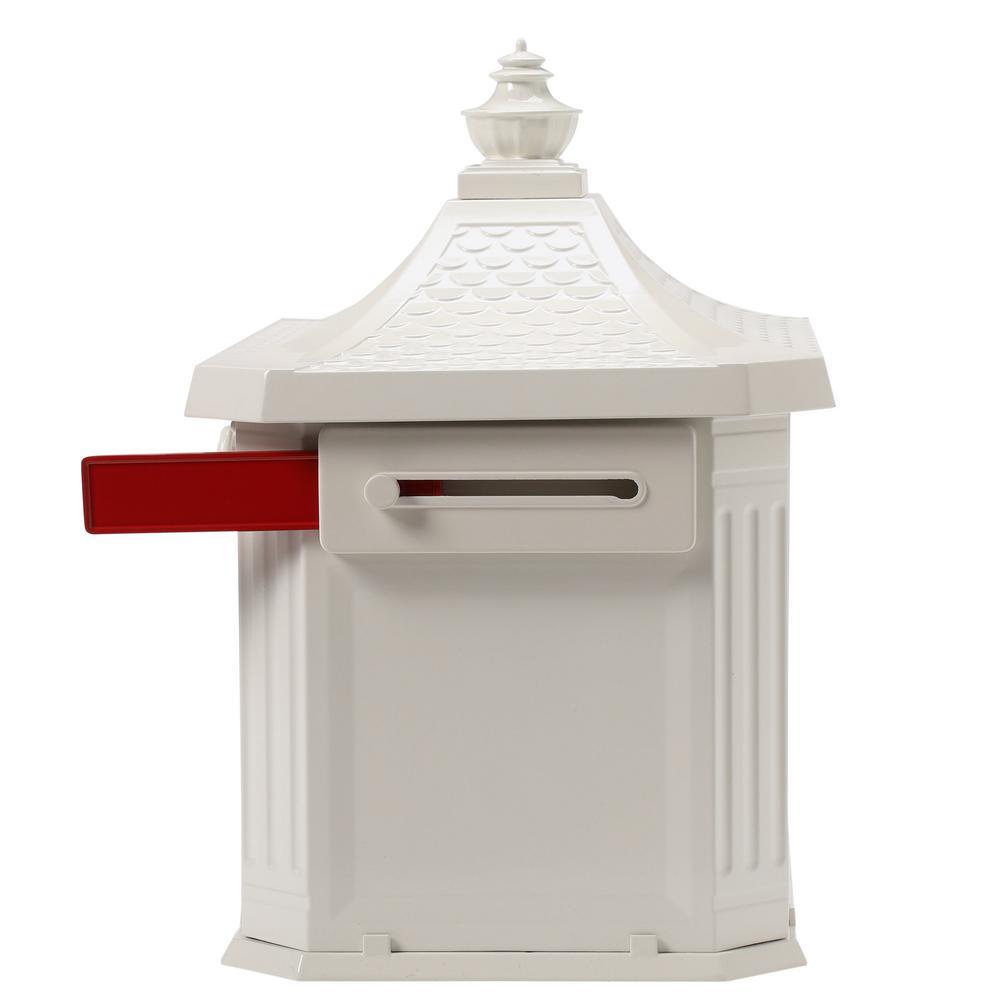 The Hamilton Premium locking post-mount mailbox is made from heavy-duty cast aluminum, offering both durability and style. Its weather-resistant powder-coated finish and decorative embellishments, such as an embossed U.S. Mail text and eagle, add character to your curbside landscape. This large capacity mailbox includes a concealed locking compartment and two mailbox keys for added security against theft. The extra-wide slot can accommodate high volume mail and its side access door allows for easy retrieval. The smooth white finish is rust-resistant, making it a long-lasting addition to your curbside. Some assembly is required, with mounting hardware sold separately. For best results, pair with Gibraltar Mailboxes posts labeled with the letter C, such as the Callaway pedestal mailbox post.