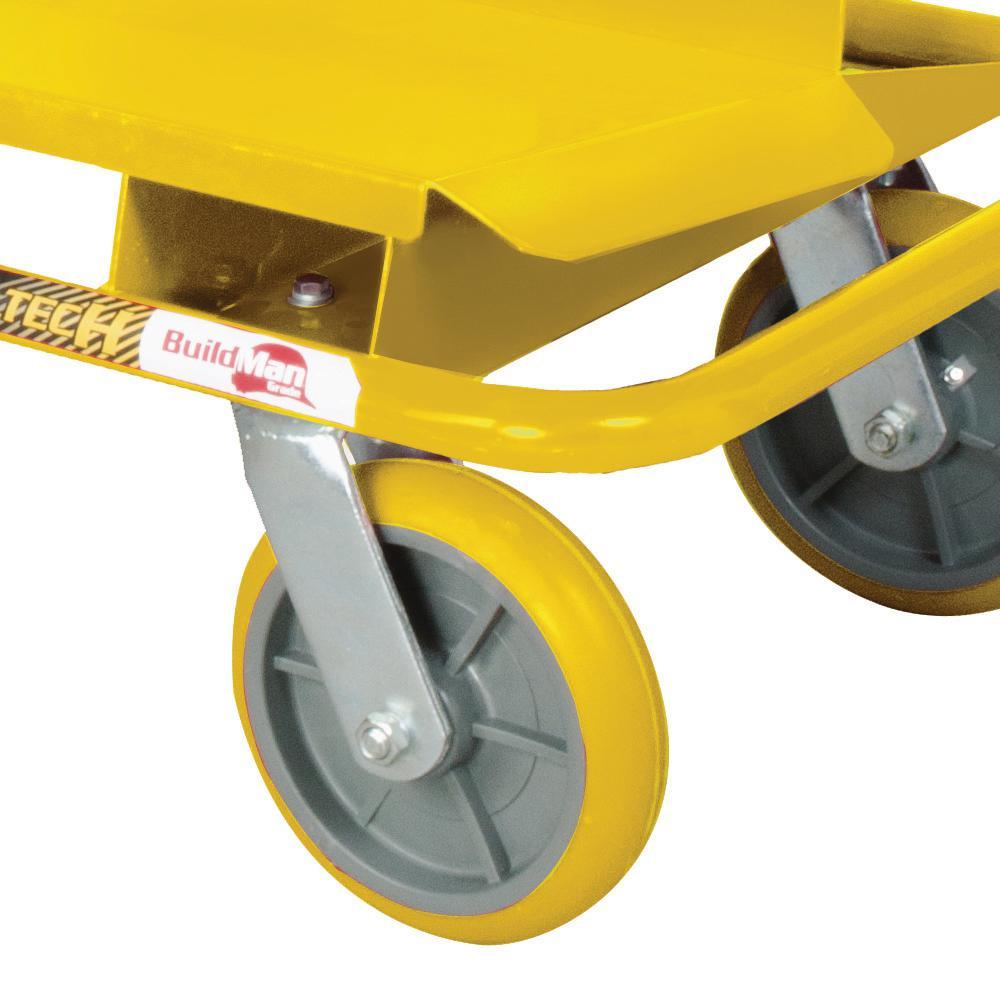 This heavy duty drywall cart is built to hold a 3000 lbs. load capacity. It has a 11.5 in. x 42 in. platform and can carry up to 22 sheets of sheetrock. When you have a lot of sheet rock, drywall, paneling or plywood to move in and out of tight spots, this is the cart to have on your team. Drywall hanging and mudding is one of the most important steps in finishing new construction. It features easy moving 8 in. rubber on PP core casters (two swivel, one with directional lock).