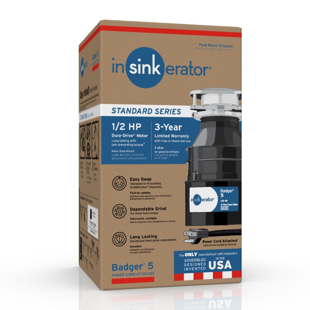 Badger 5 with power cord food waste disposers are a reliable and functional choice when affordability is the prime concern. Badger 5 features a 1/2 HP heavy-duty quiet Dura-Drive induction motor, rugged Galvanized Steel construction for disposer durability, and a space-saving compact design. To top it off, Badger 5 offers a 3-year We Come to You In-Home Service Warranty.