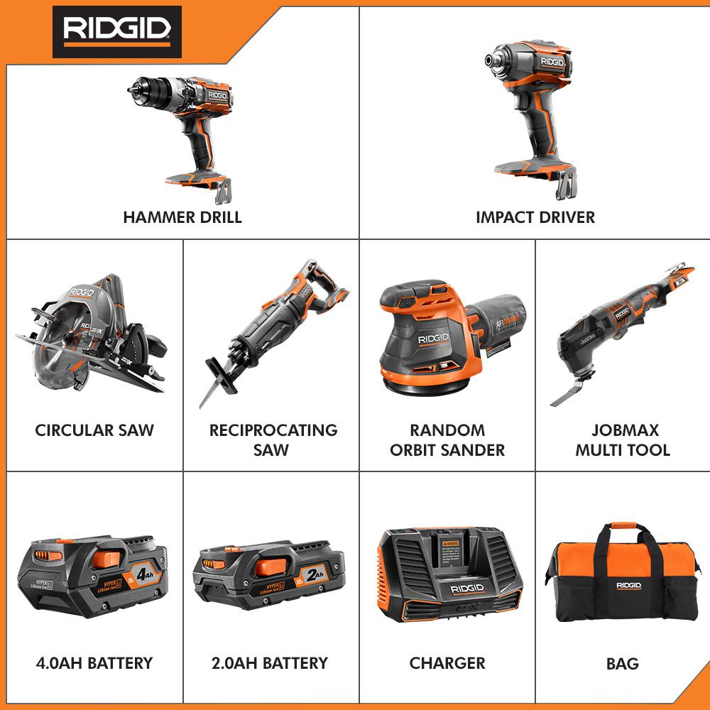 RIDGID introduces the 18-Volt Lithium-Ion Cordless 6-Piece Combo Kit with (1) 4.0 Ah Battery and (1) 2.0 Ah Battery, Charger, and Bag. Get all the tools you need for the job in one kit. The 18-Volt Cordless 6-Piece Combo Kit from RIDGID includes 6 common tools. You'll also get free batteries, free parts and free service for life when you register the kit within 90 days of purchase. This 6-Piece Combo Kit includes a hammer drill, a 3-speed impact driver, a reciprocating saw, a circular saw, an orbital sander, a JobMax multi-tool, a 4.0 Ah battery, a 2.0 Ah battery, an 18-Volt charger, a tool bag and an operator's manual.