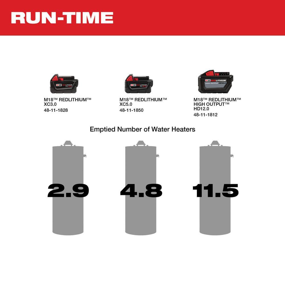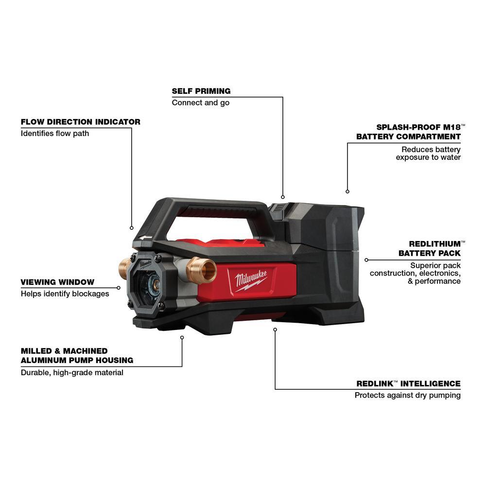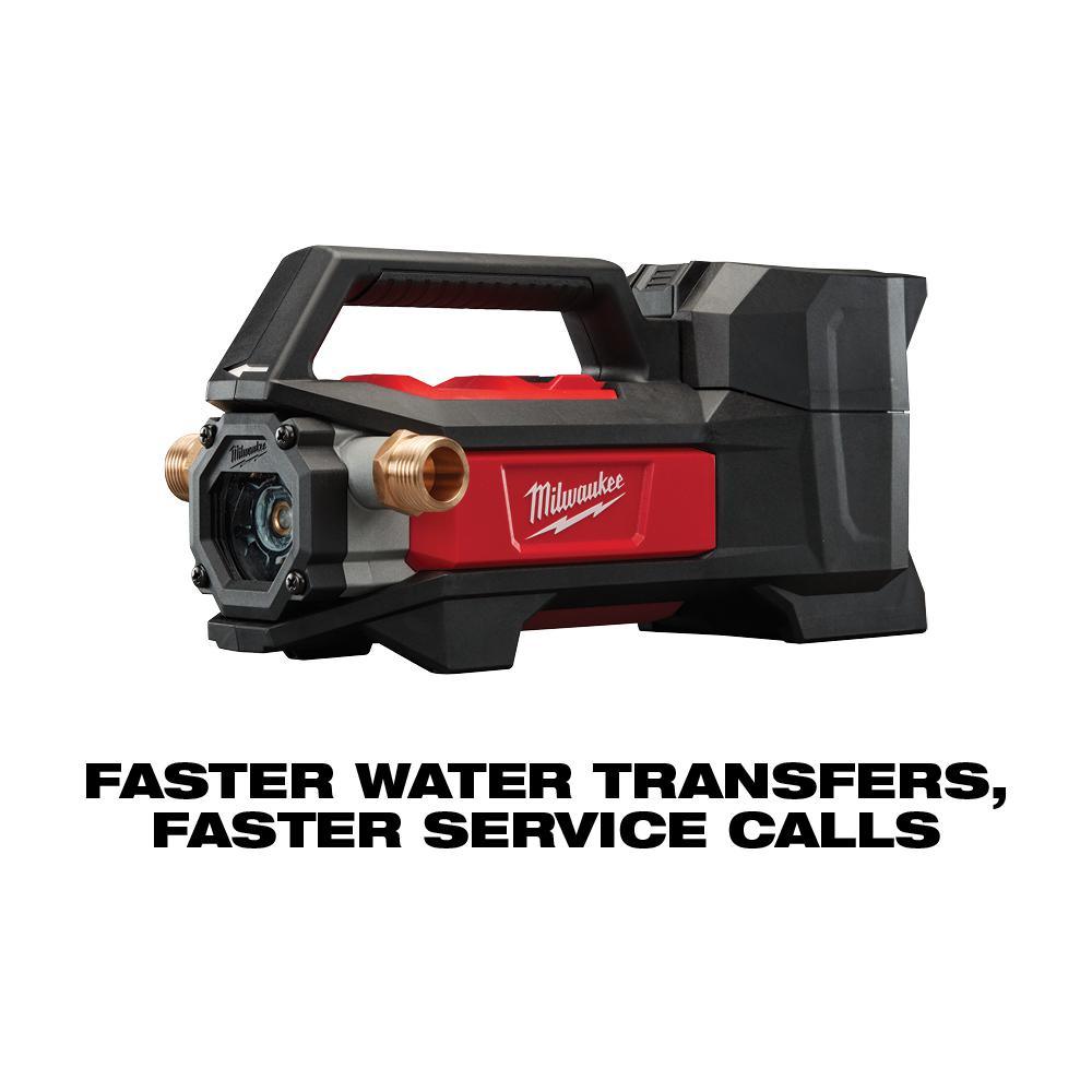 The MILWAUKEE M18 Transfer Pump offers users faster water transfers and service calls. This portable water transfer pump is the industry’s first cordless transfer pump, offering users the fastest setup. With an innovative self-priming pump, users can connect and go quicker than ever. The Milwaukee transfer pump's flexible impeller and powerful pump move water at up to 480 Gal. per hour, generates up to 18 ft. of lift and produces up to 75 ft. of head height. As a part of the M18 System, REDLITHIUM battery packs power the water transfer pump, which delivers up to 240 Gal. moved per charge on an XC5.0 battery pack. Onboard REDLINK Intelligence can recognize when the tool stops moving water and automatically shuts itself off to avoid dry pumping. REDLINK also provides optimized performance and overload protection in abusive situations.