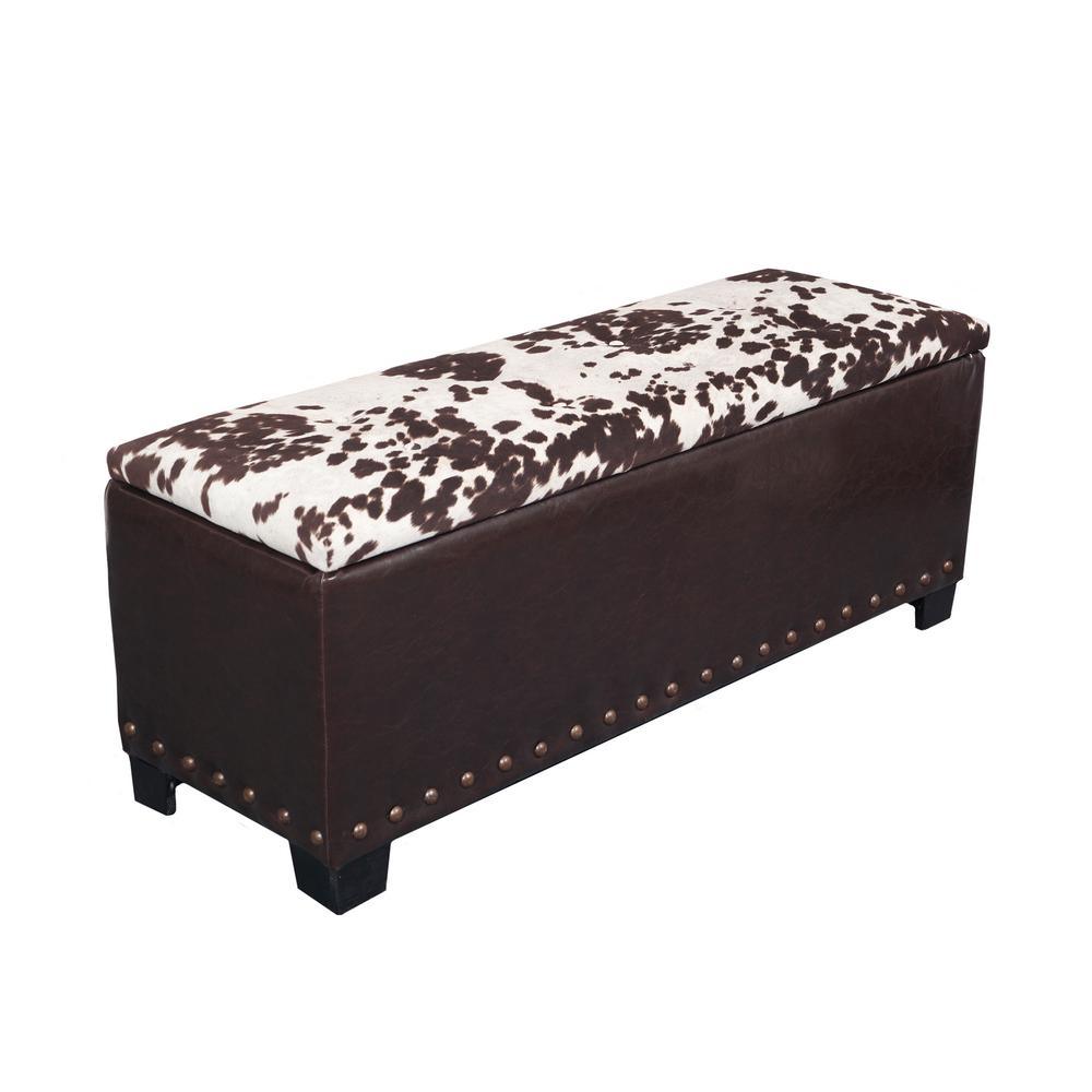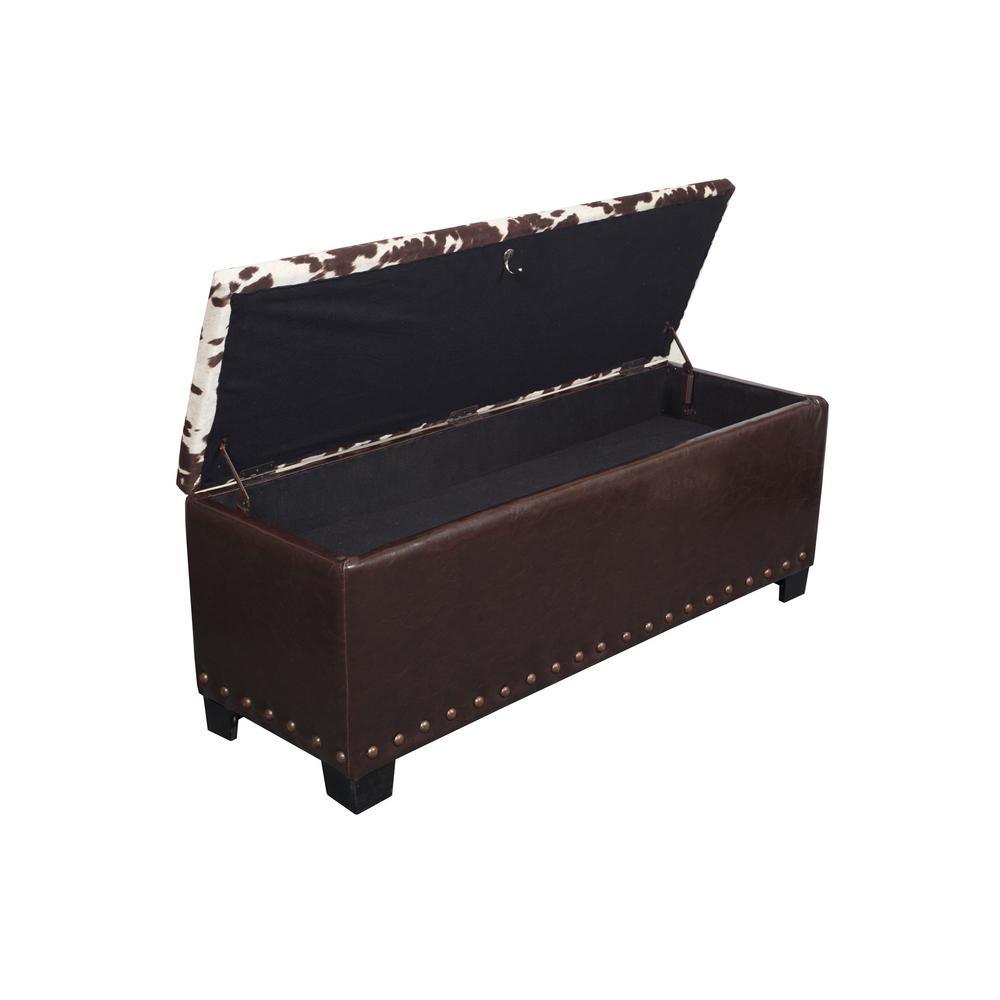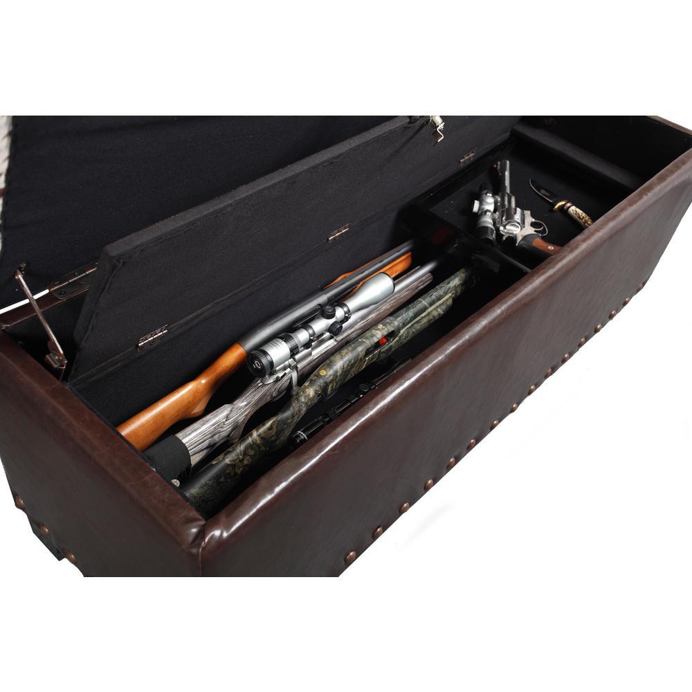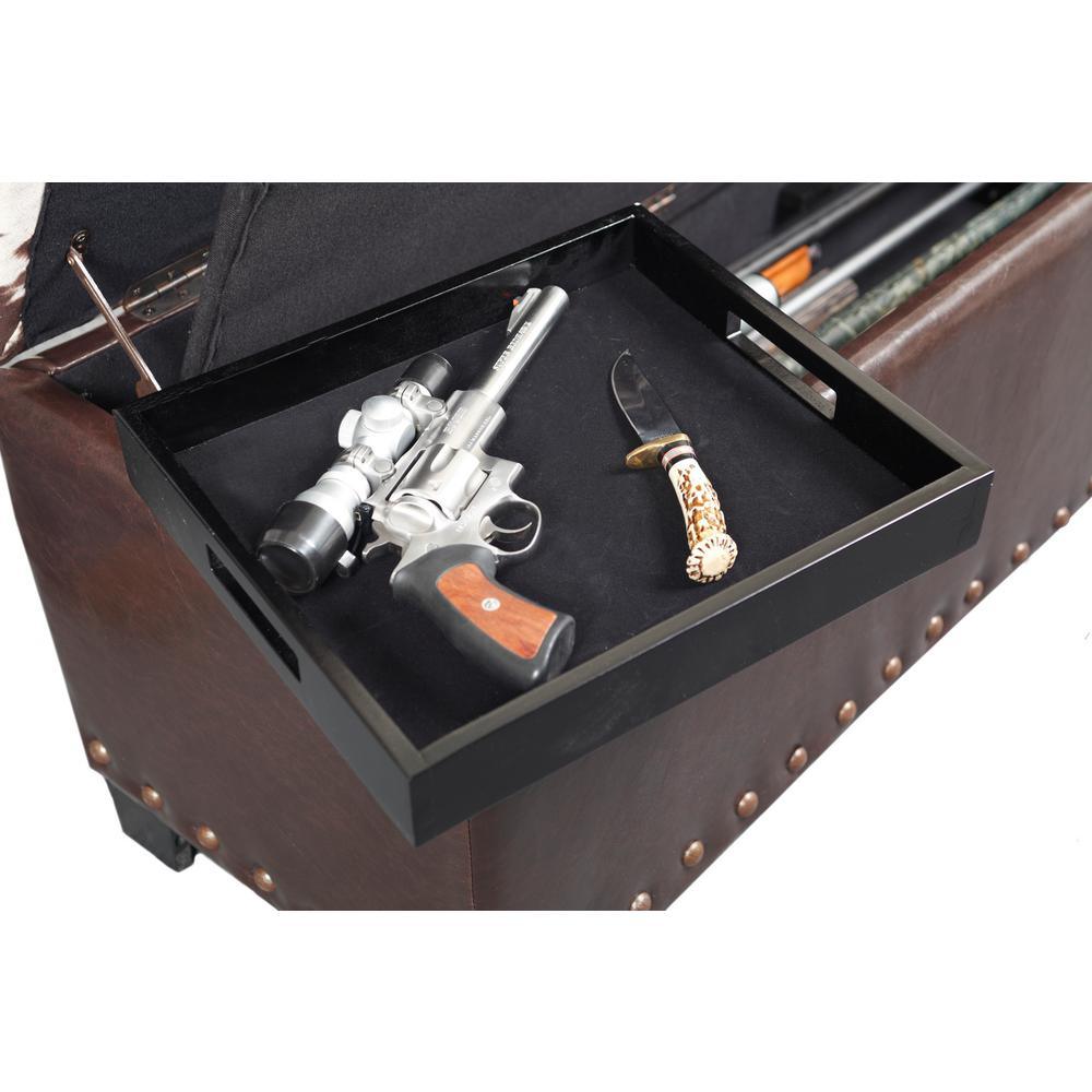 The gun concealment bench provides a clever way to store your firearms with room for up to five long guns. A removable wood tray is also provided for handguns or other accessories. This attractive brown poly-urethane bench with Udder Madness cowhide accented lid features a locking concealed gun compartment lined with soft fabric. The upper compartment provides ample room for blankets or other sportsmen accessories. Additional features include attractive hardwood feet, removable butt and barrel rests and dual safety stays that hold the lid open preventing pinching.