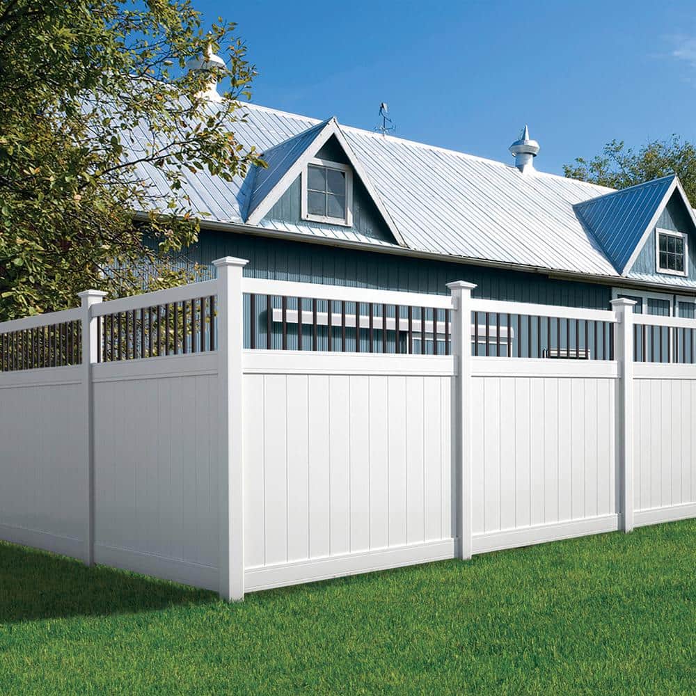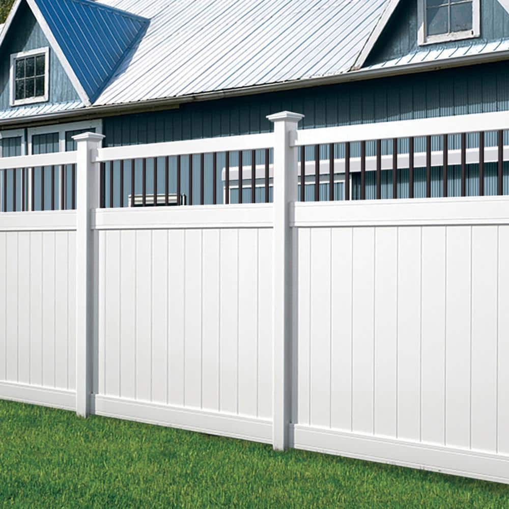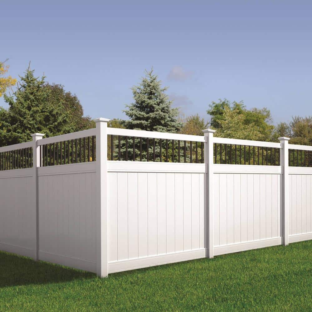 Mixed Material Design: Features durable white vinyl and powder-coated aluminum balusters for a stylish, long-lasting fence.