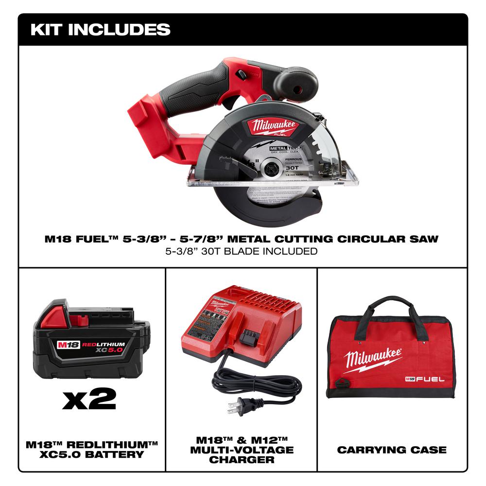 - Includes: 2782-20 M18 FUEL Metal Saw, (2) M18 REDLITHIUM XC5.0 Batteries, M18/M12 combi charger, 5-3/8 in. 30T blade, Allen wrench, contractor bag
