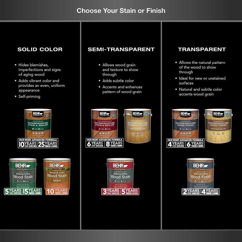 BEHR’s best wood finish, this advanced 100% acrylic formula delivers complete protection from the elements for up to 4 years on decks and 6 years on fences and siding. The silicone-fortified formula delivers excellent protection from the sun’s harmful UV rays. BEHR Premium Waterproofing Wood Finish is available in 3 pre-mix colors as well as 6 custom colors to reveal the beauty of your wood surface.