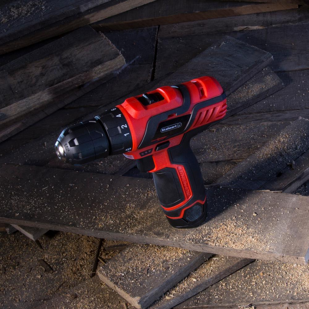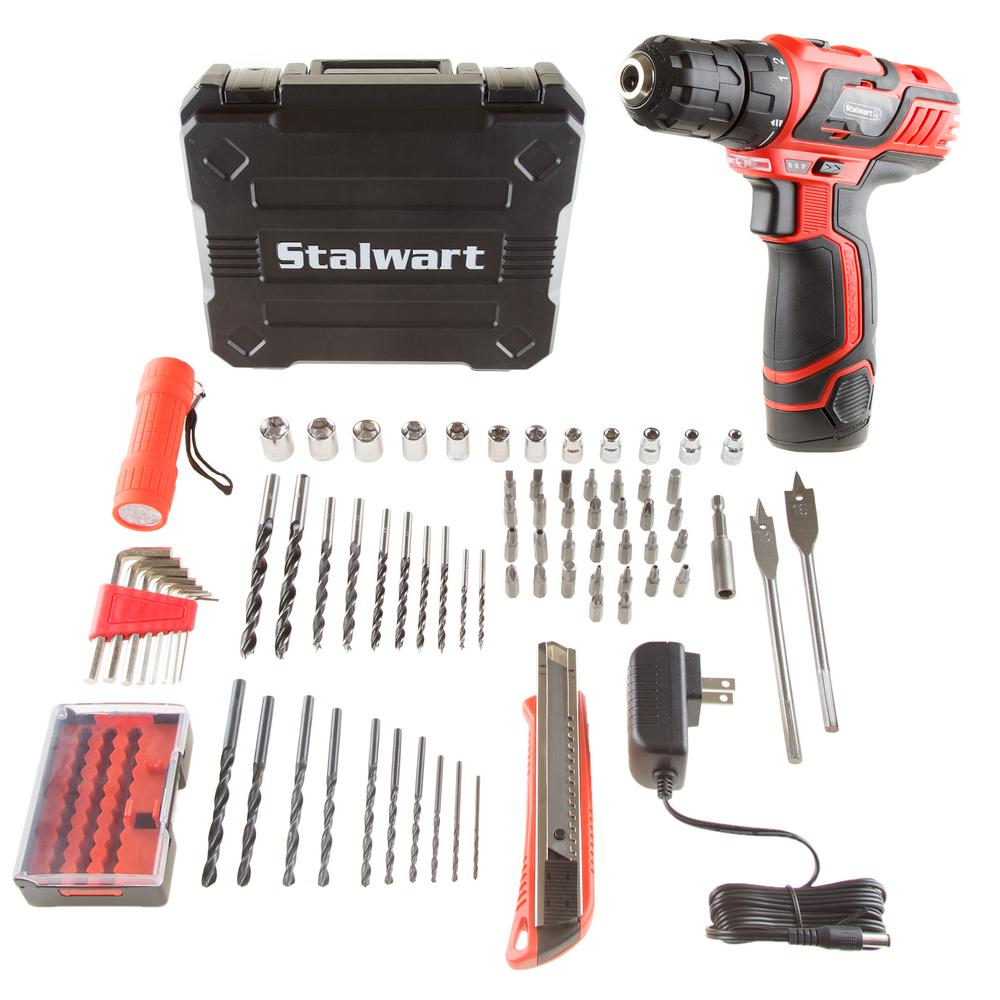 The Stalwart 75 piece 12-Volt Lithium Ion 2 speed drill set makes it easy to tackle DIY and household tasks. This drill comes with an LED light to illuminate what you're working on, that is activated when the trigger is pulled. This 75 piece kit includes a rugged and sturdy case that is ideal for storage and portability.
