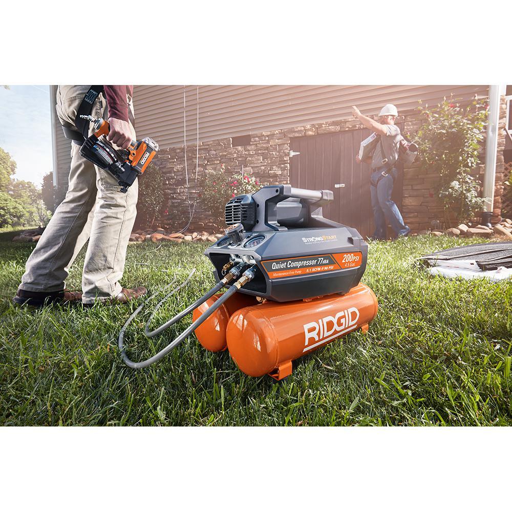 RIDGID introduces the 4.5 Gal. Portable Electric Strong Start Air Compressor with 21° 3-1/2 in. Round-Head Framing Nailer. This 200 PSI. 4.5 Gal. compressor comes in at 77 dB making this unit up to 75% quieter than leading competitor units and great for jobsites and keeping the crew working all day. Strong Start Technology allows this unit to start reliably in any power condition. This unit is also up to 61% more compact than leading competitor units allowing for easier transport and storage, without sacrificing any power. The 4.5 Gal. compressor is backed by the RIDGID 3-Year Limited Warranty. This combination kit comes with the 21° 3-1/2 in. Round-Head Framing Nailer, a contractor's bag, and operator's manuals. All RIDGID Nailers are backed by the Industry's only Lifetime Service Agreement.